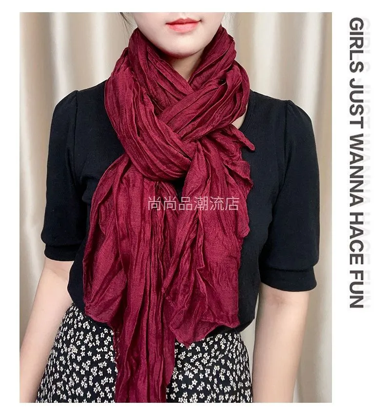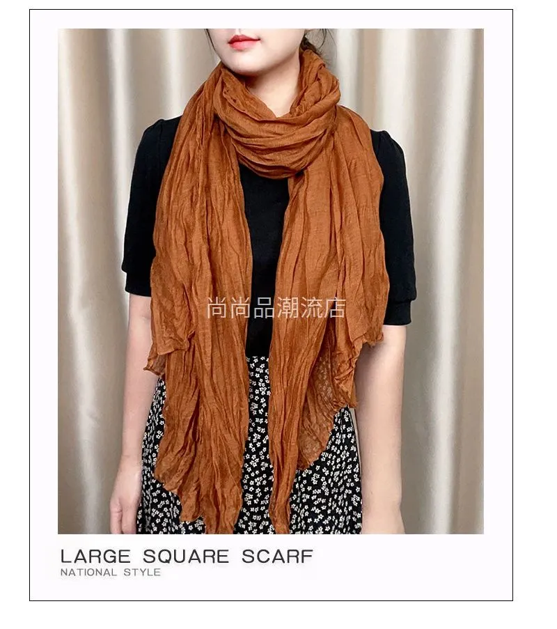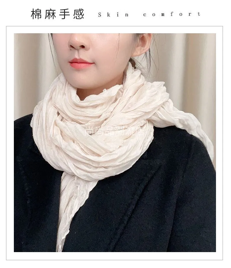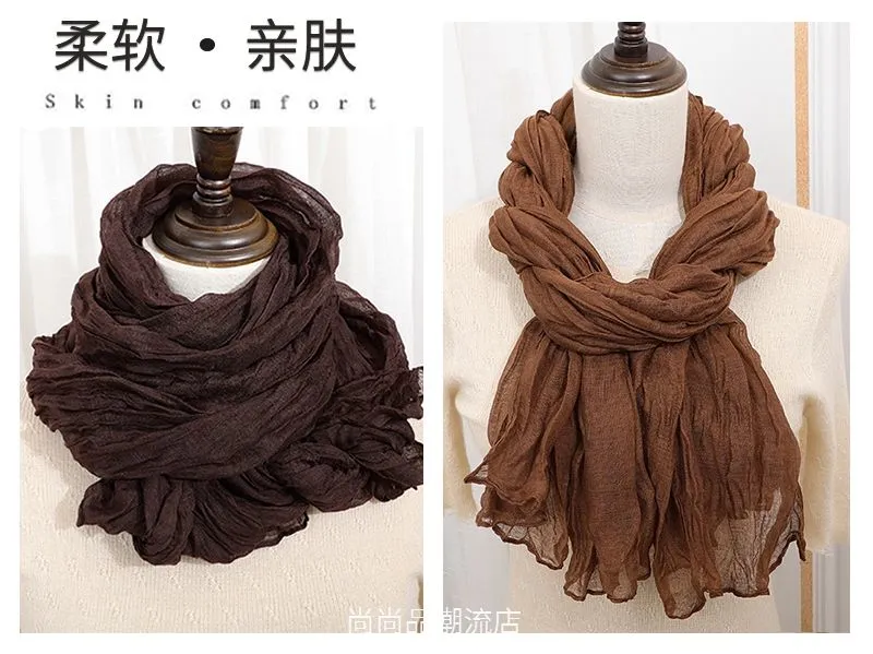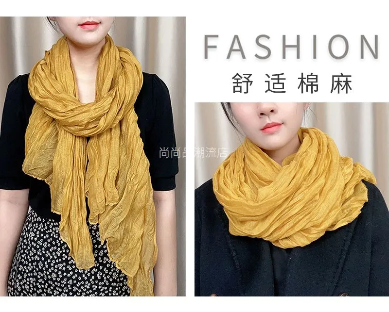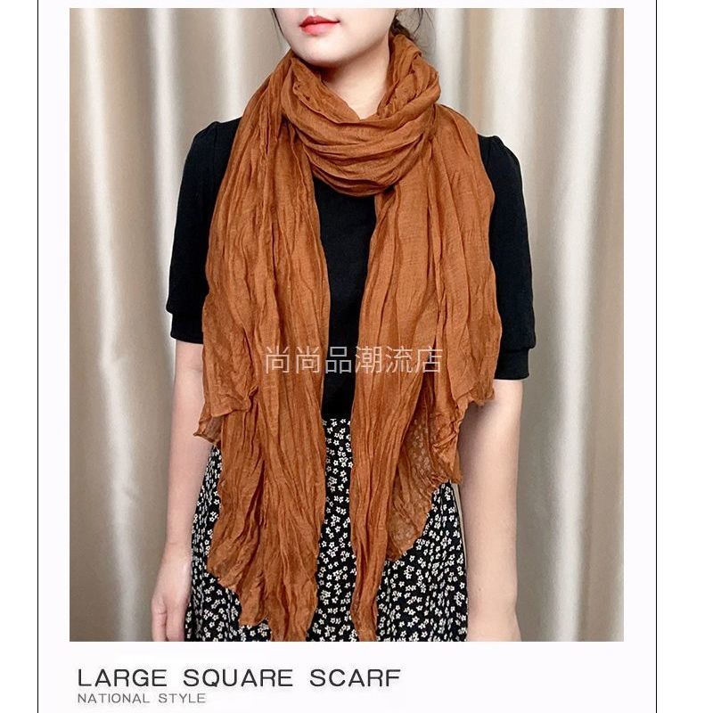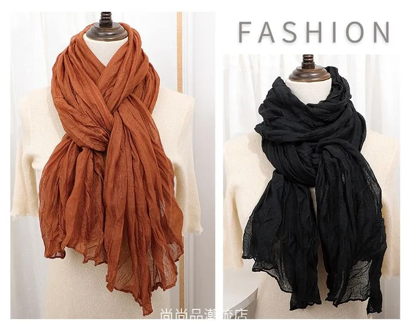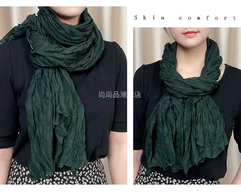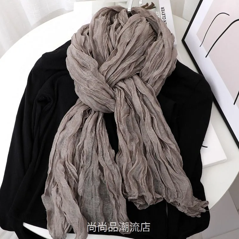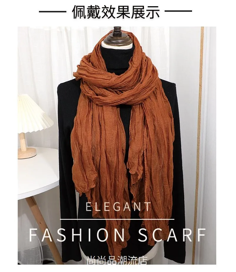 外贸复古秋冬季保暖棉麻围巾女纯色褶皱披肩护颈围脖文艺范丝巾新