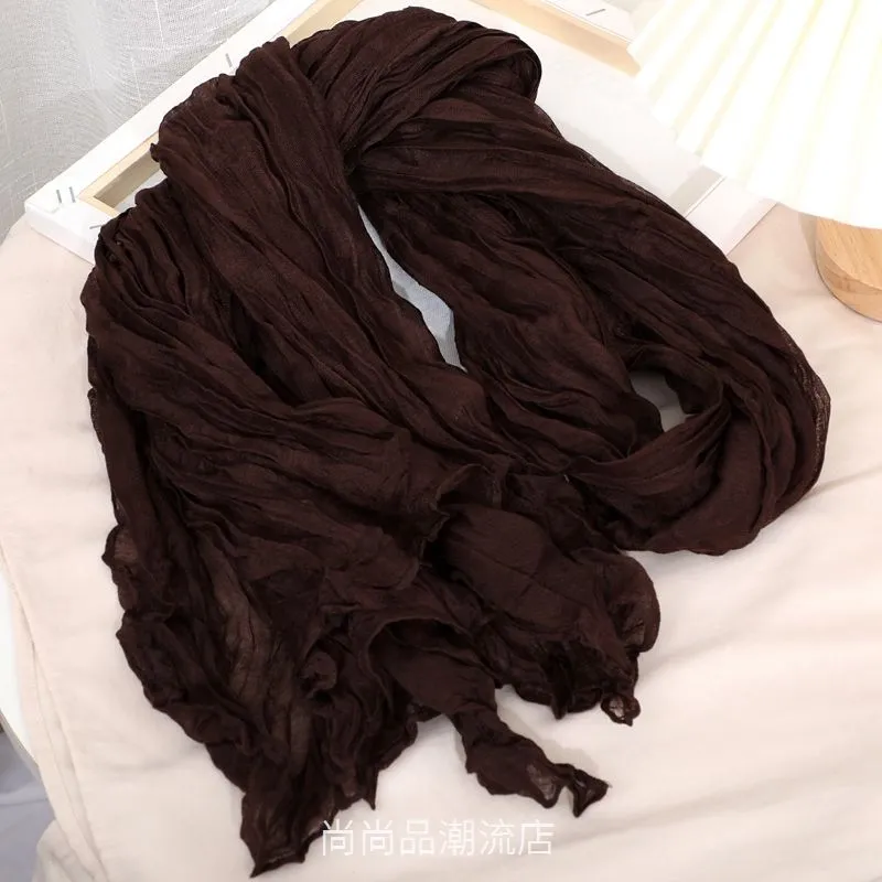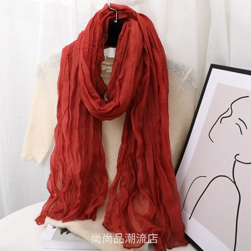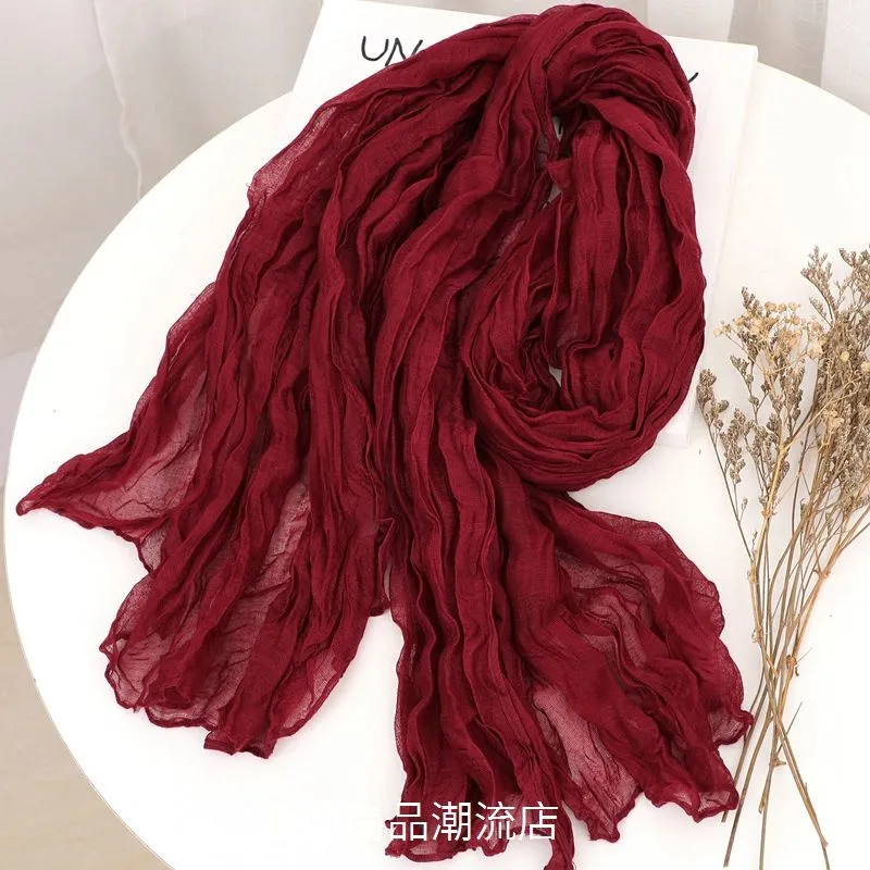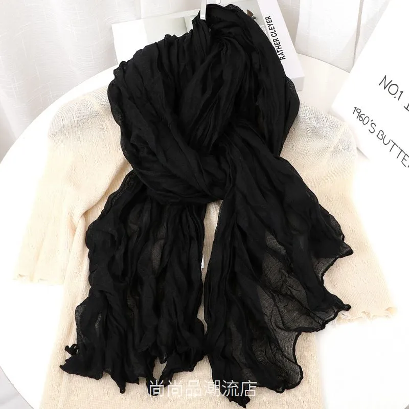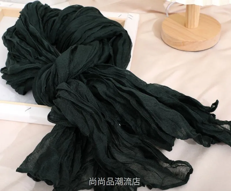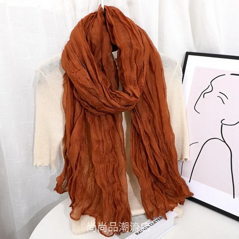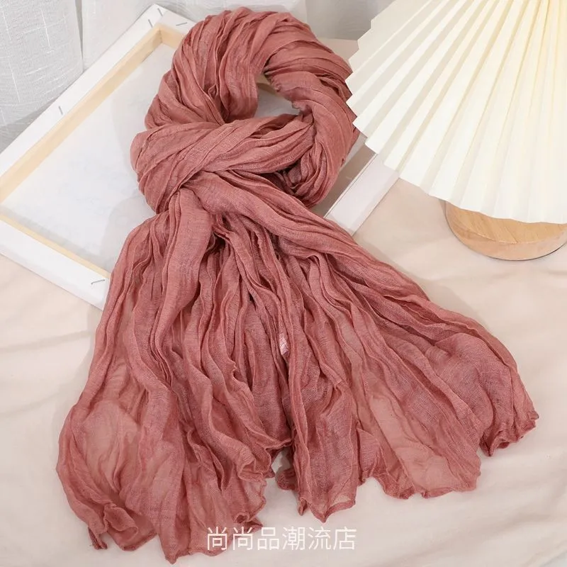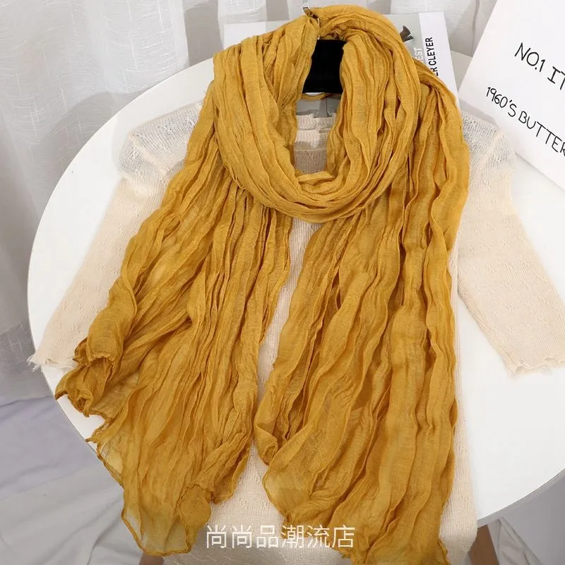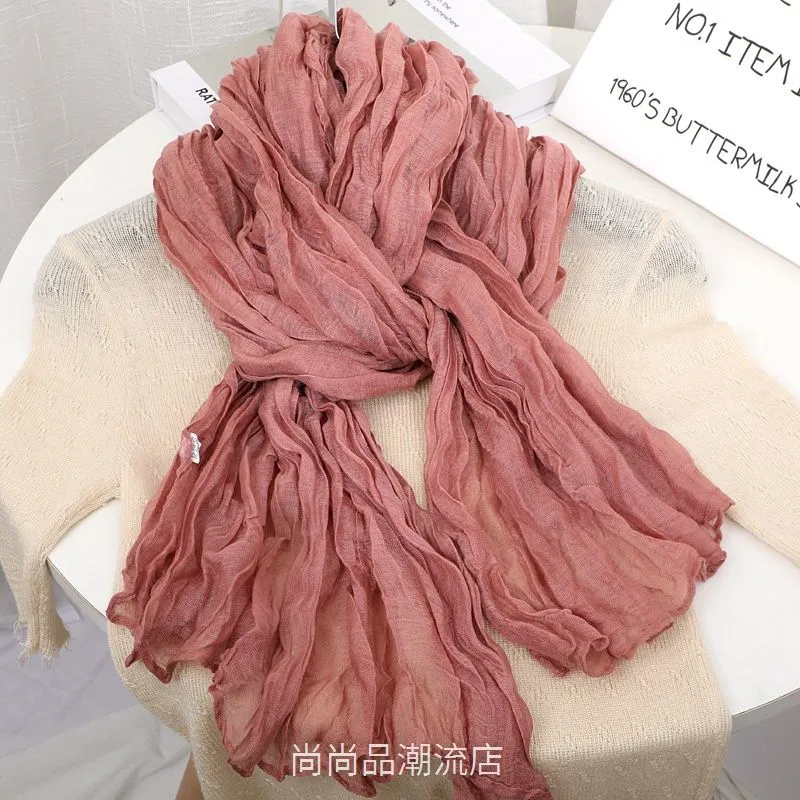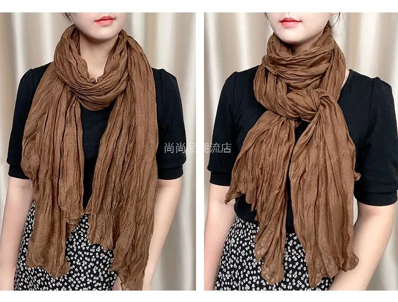 外贸复古秋冬季保暖棉麻围巾女纯色褶皱披肩护颈围脖文艺范丝巾新