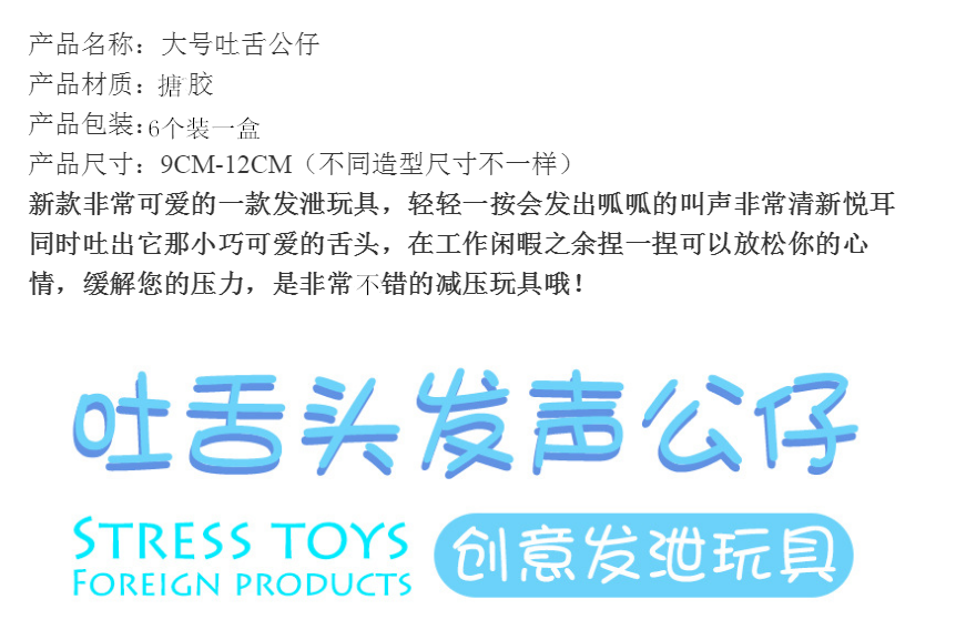 | 6 large sticking tongue out toys will be sent randomly(大号吐舌头玩具6个随机发) | USD $7.22 | 999999 piece available |