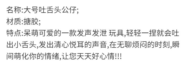 | 4 large sticking tongue out toys will be sent randomly(大号吐舌头玩具4个随机发) | USD $5.07 | 999999 piece available |