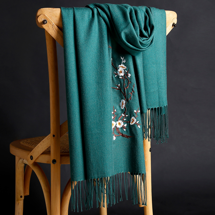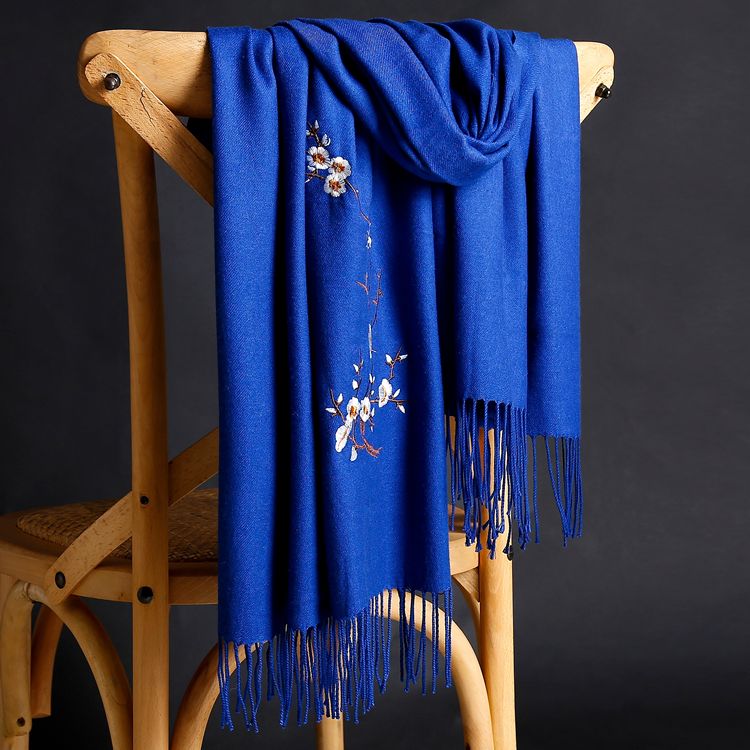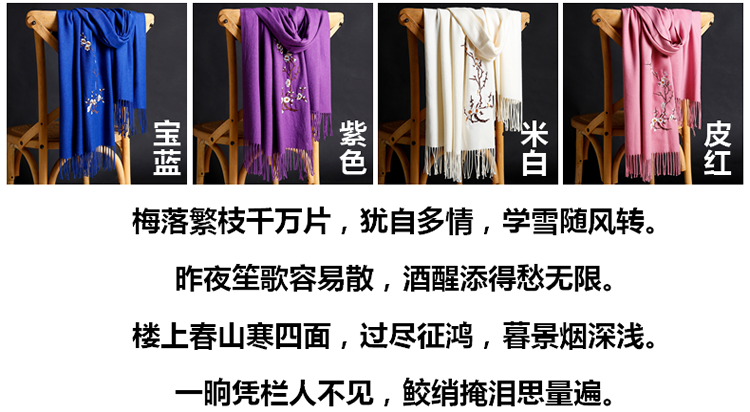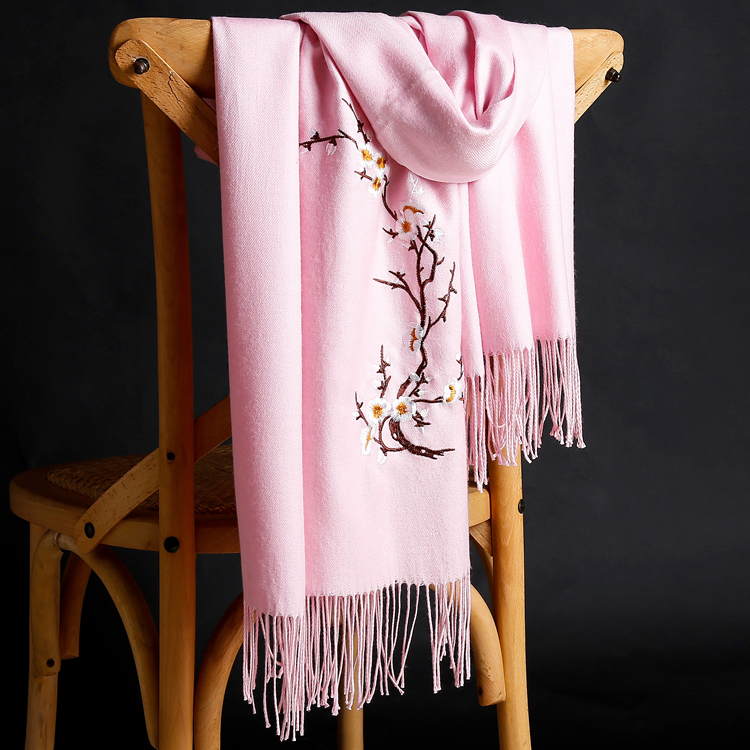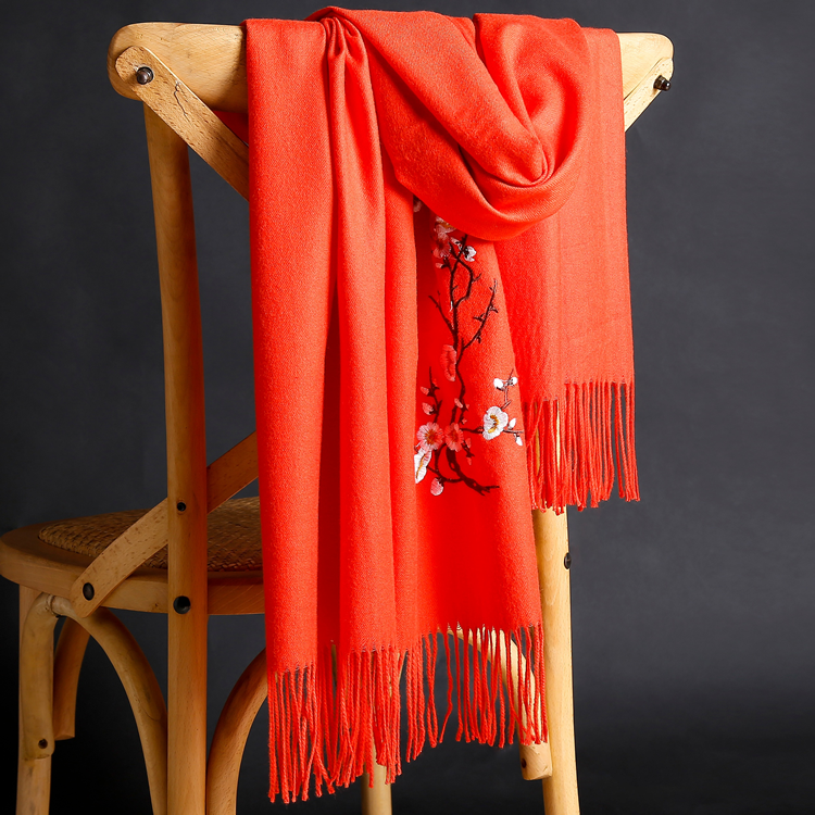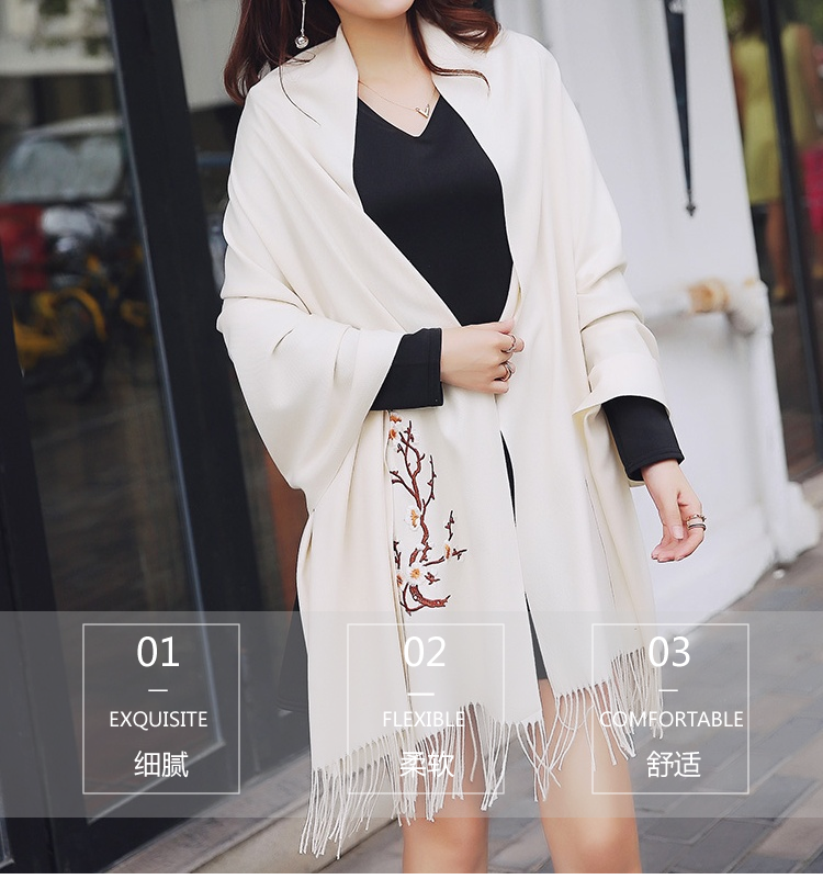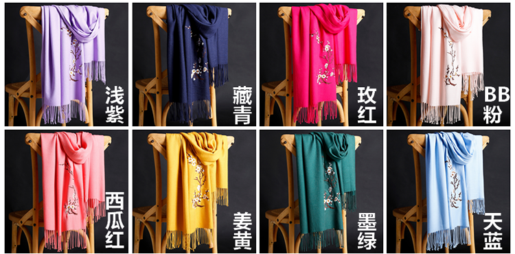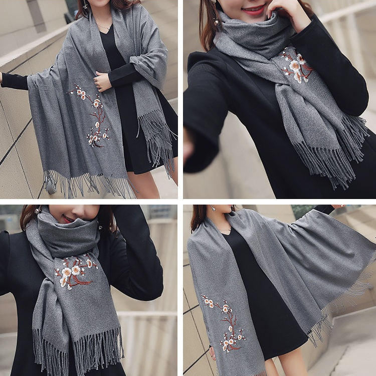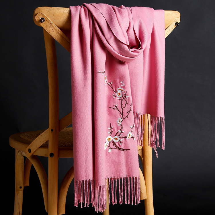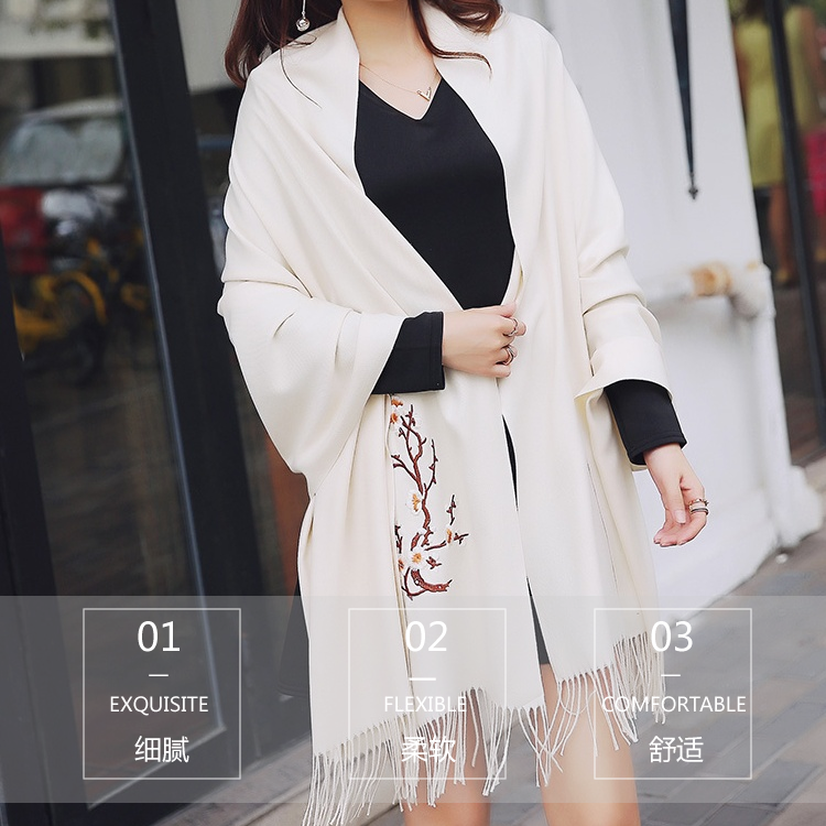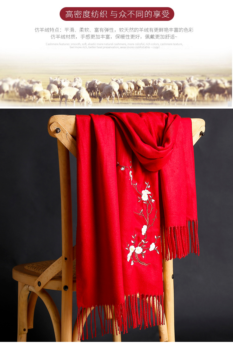 冬季纯色仿羊绒绣花围巾女长款民族风刺绣厚流苏披肩学生保暖围脖