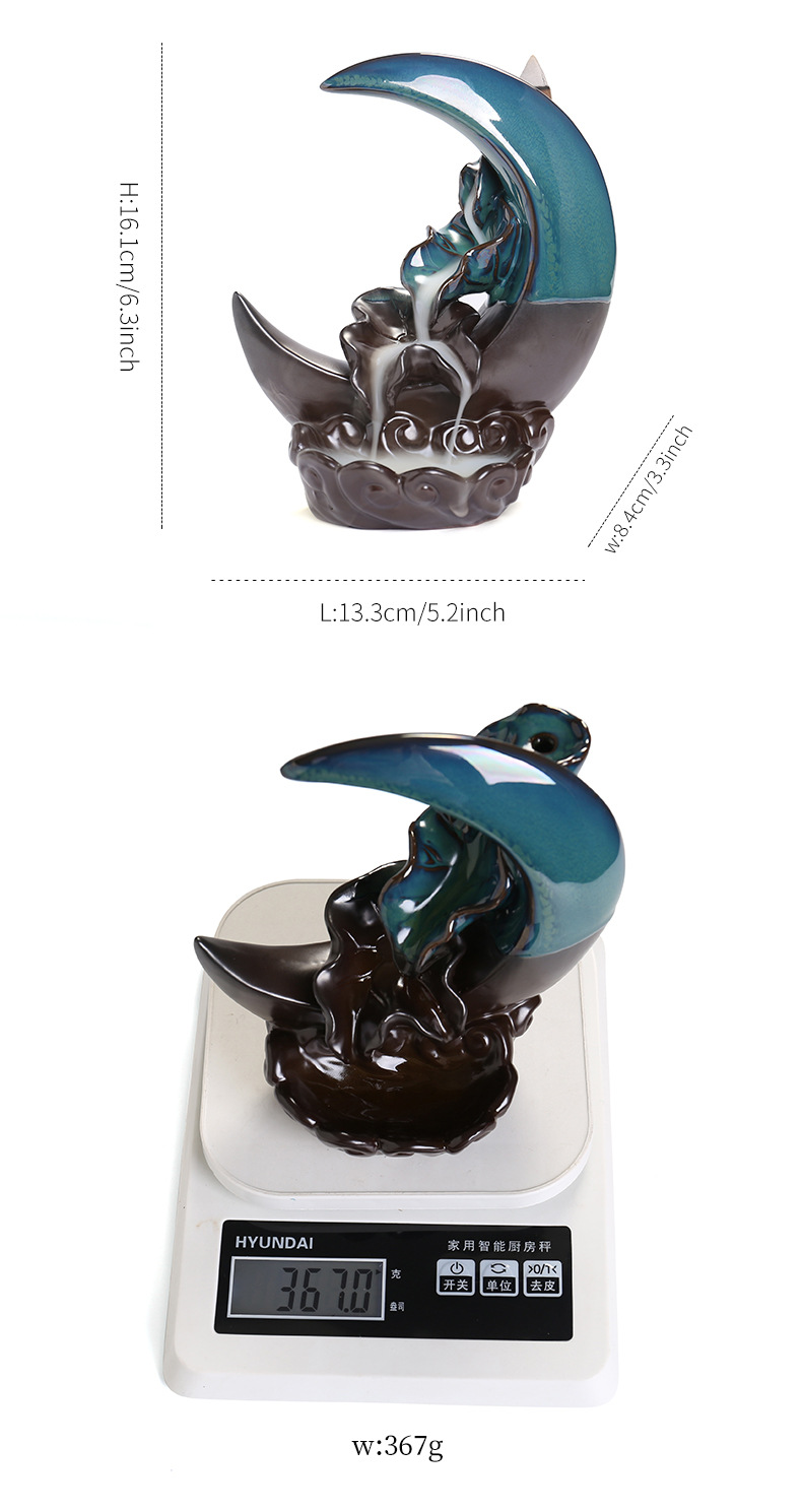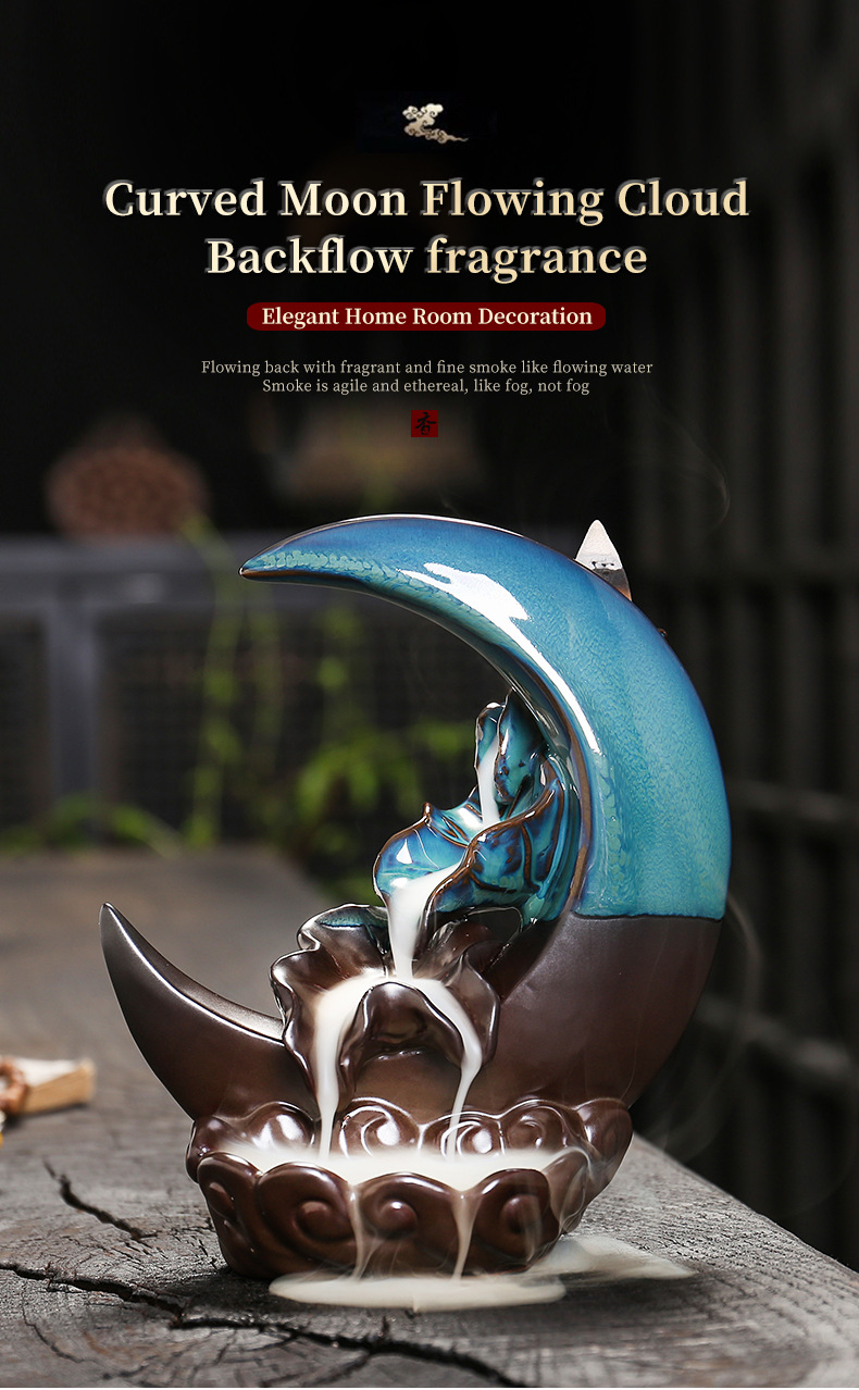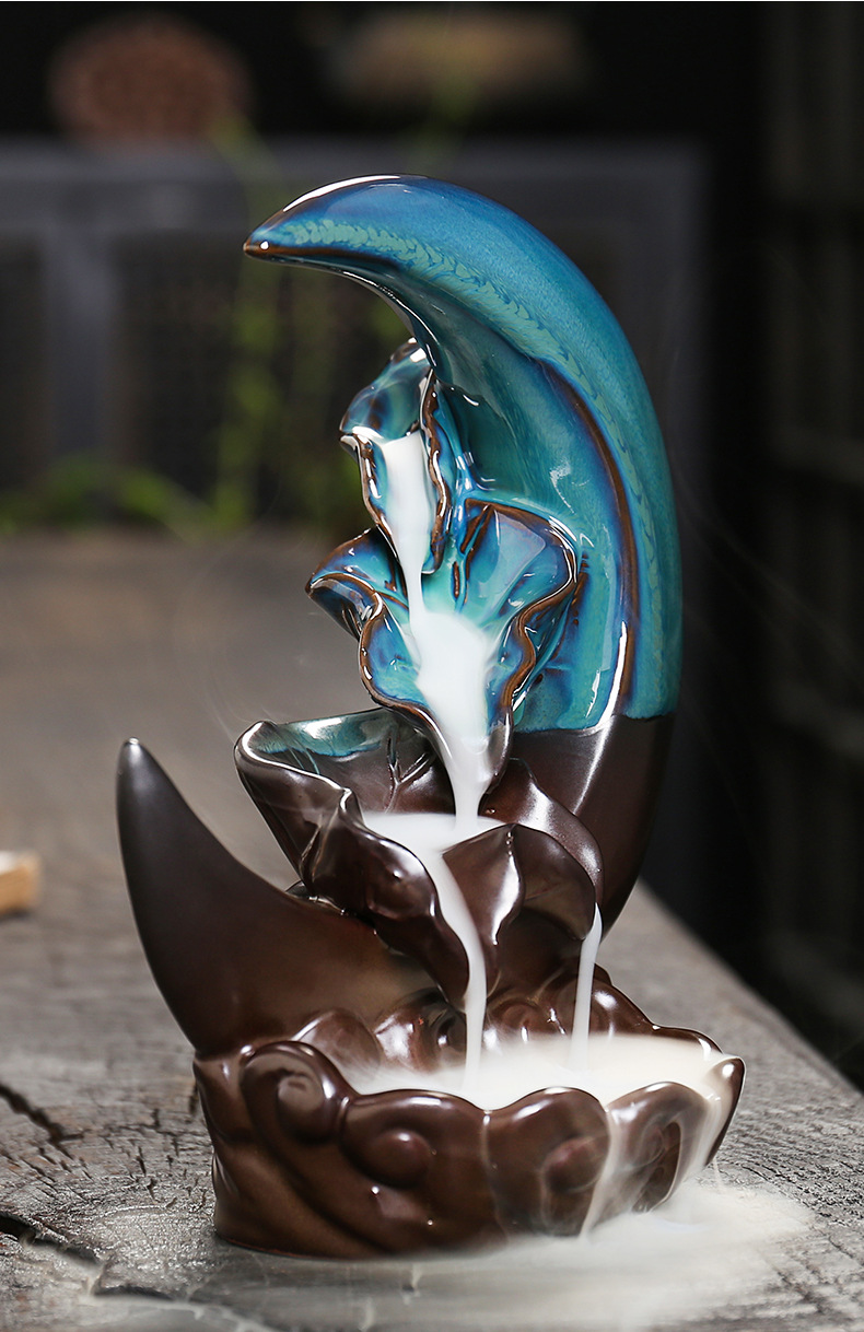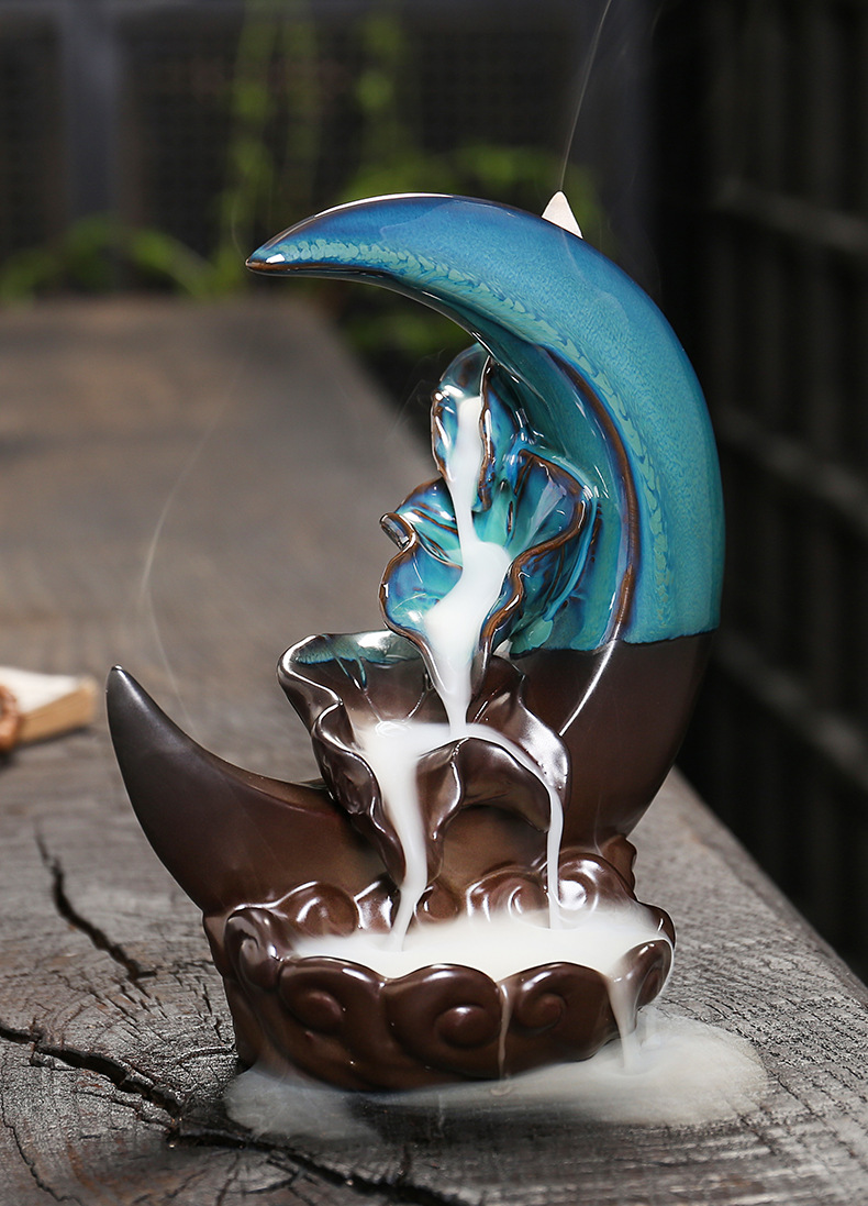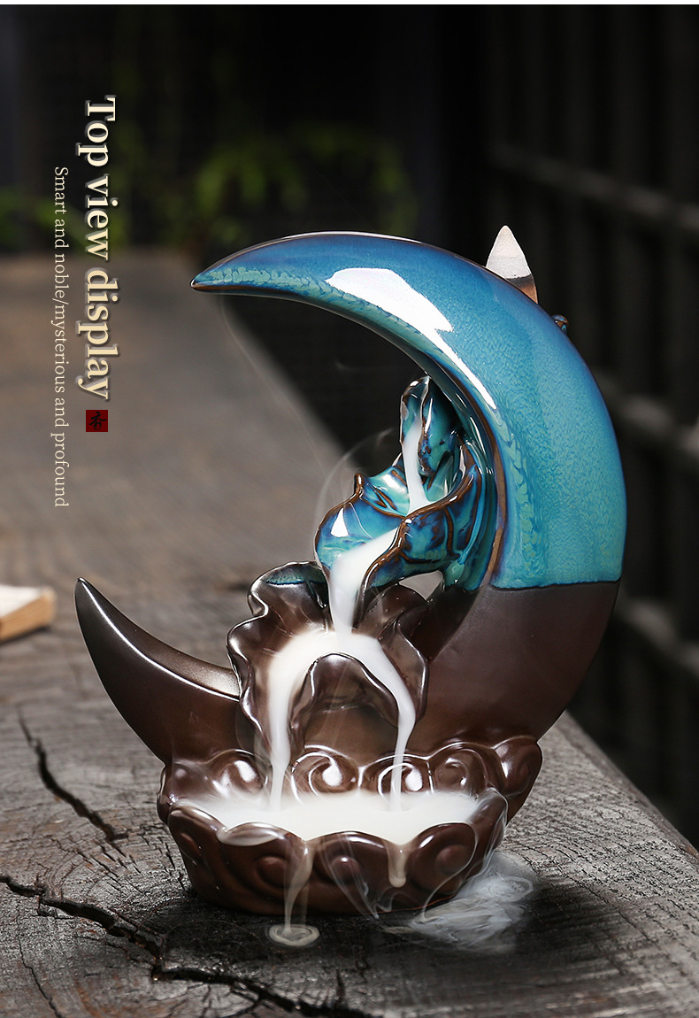 跨境 窑变蓝色荷叶高山流水倒流香炉 创意月亮香炉倒流香观赏摆件