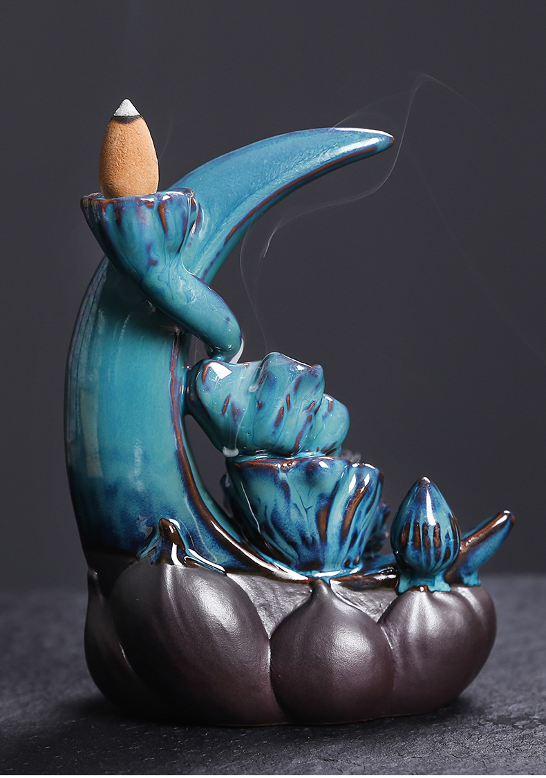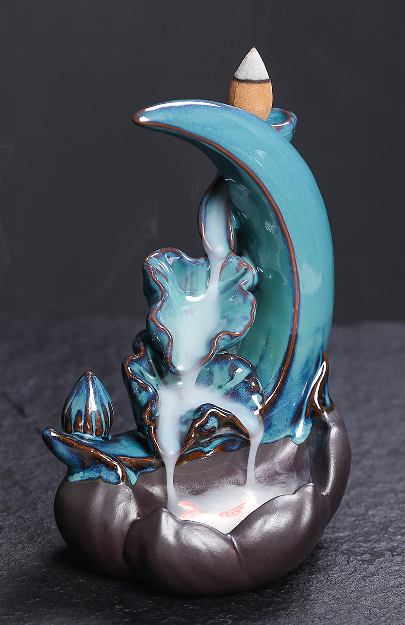 跨境陶瓷倒流檀香炉香座 创意月亮荷叶倒流香香炉工艺品家居摆件