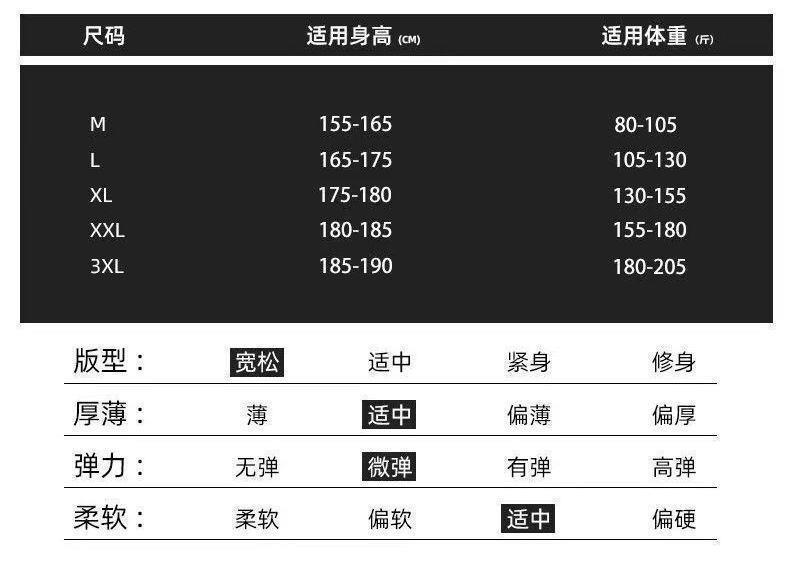 | 3xl recommended 90.00 kg-102.50 kg(3XL 建议180-205斤) | USD $10.8 | 999999 piece available |