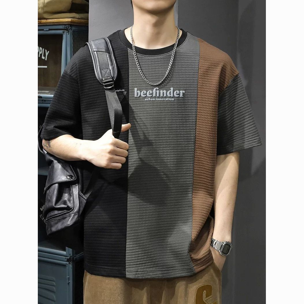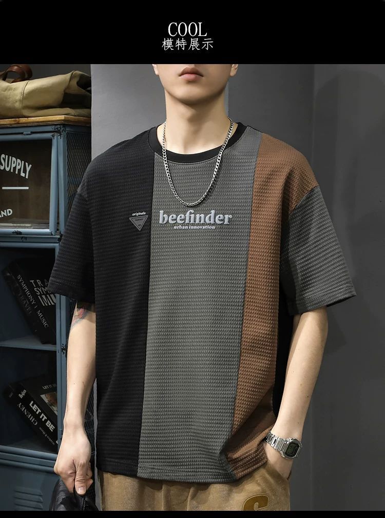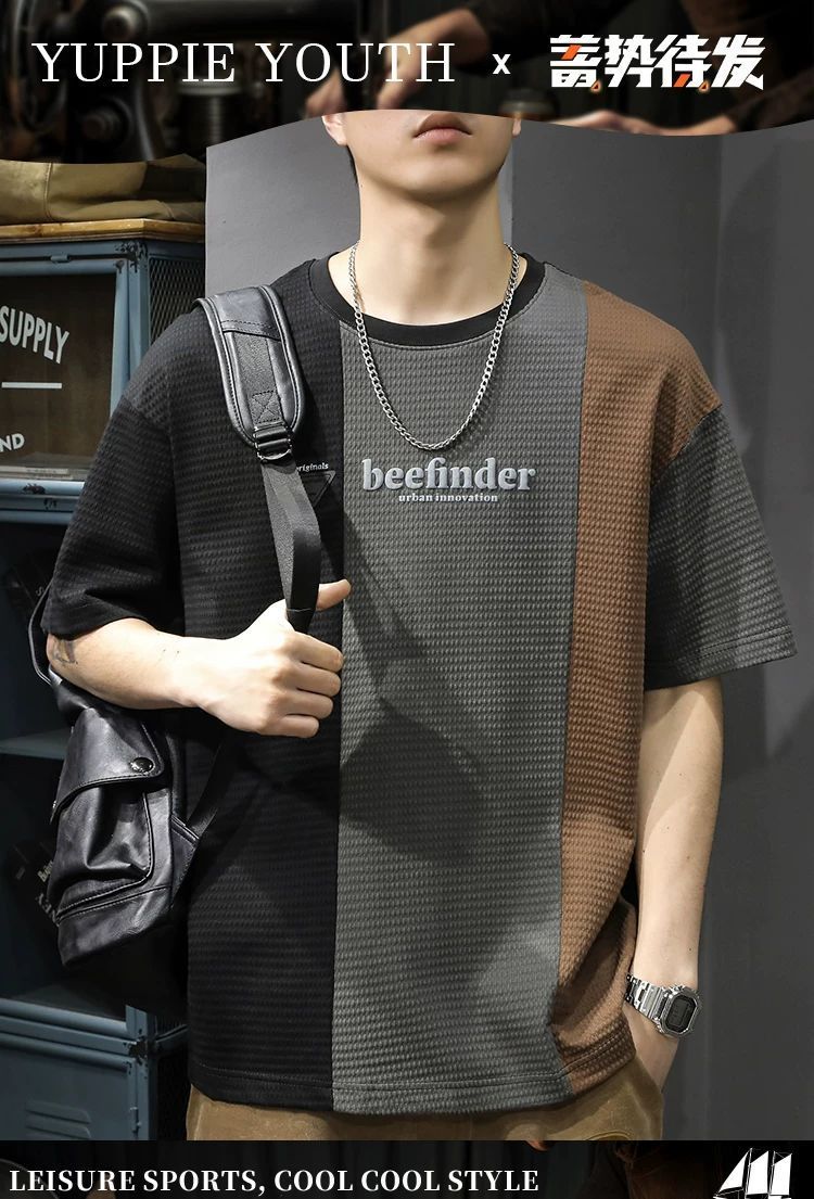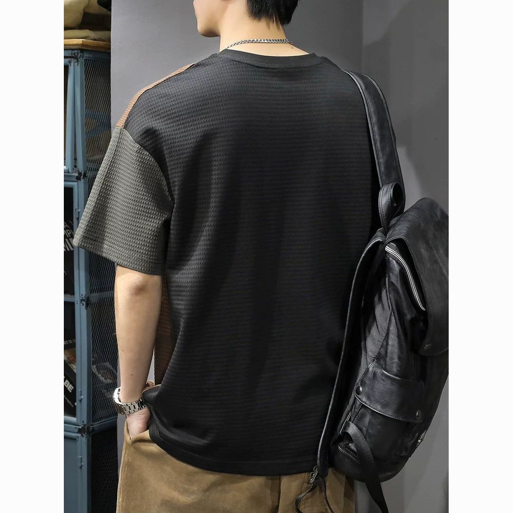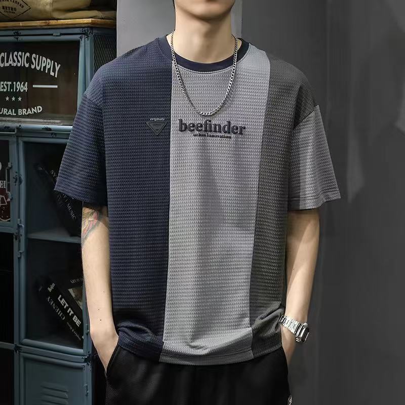 夏季新款华夫格拼色短袖t恤男帅气宽松大码休闲圆运动透气半袖衫