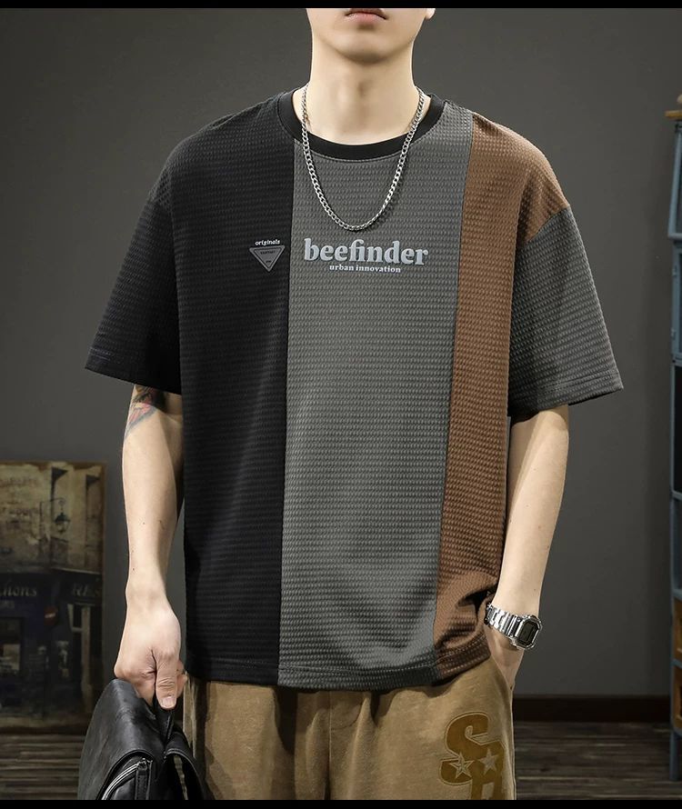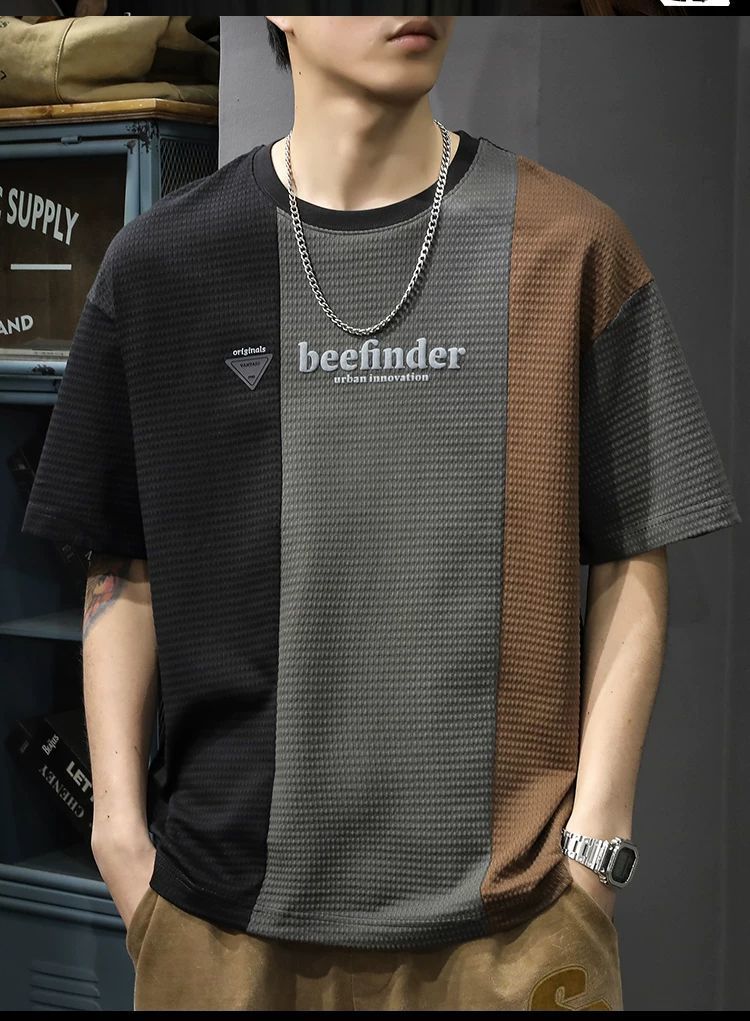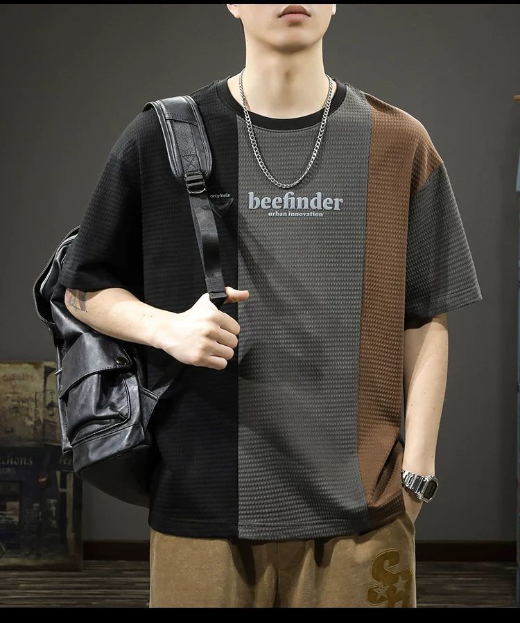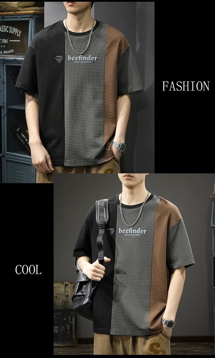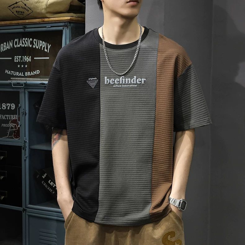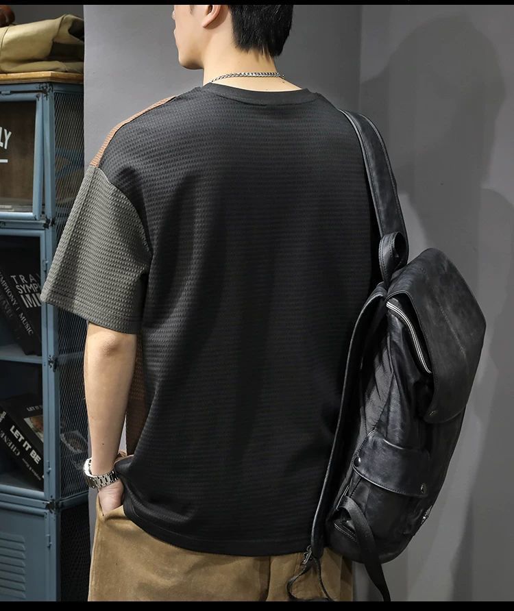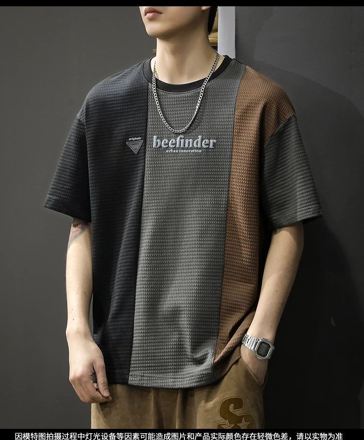 夏季新款华夫格拼色短袖t恤男帅气宽松大码休闲圆运动透气半袖衫