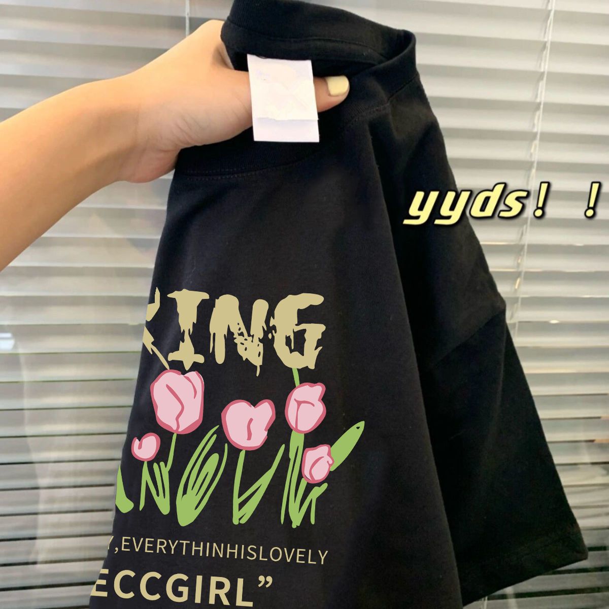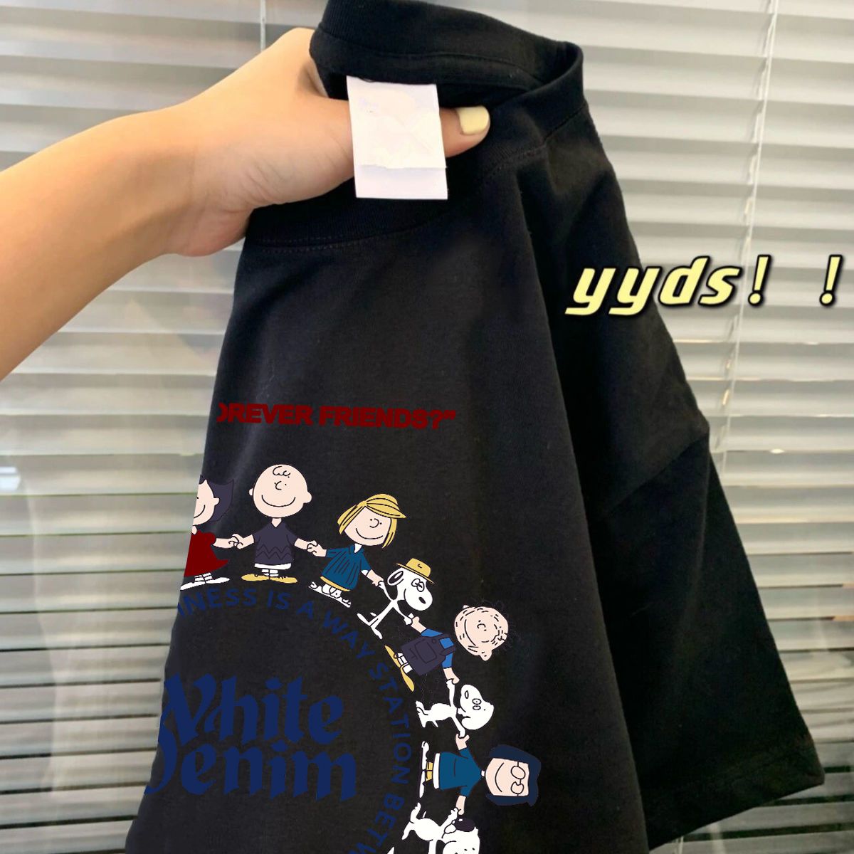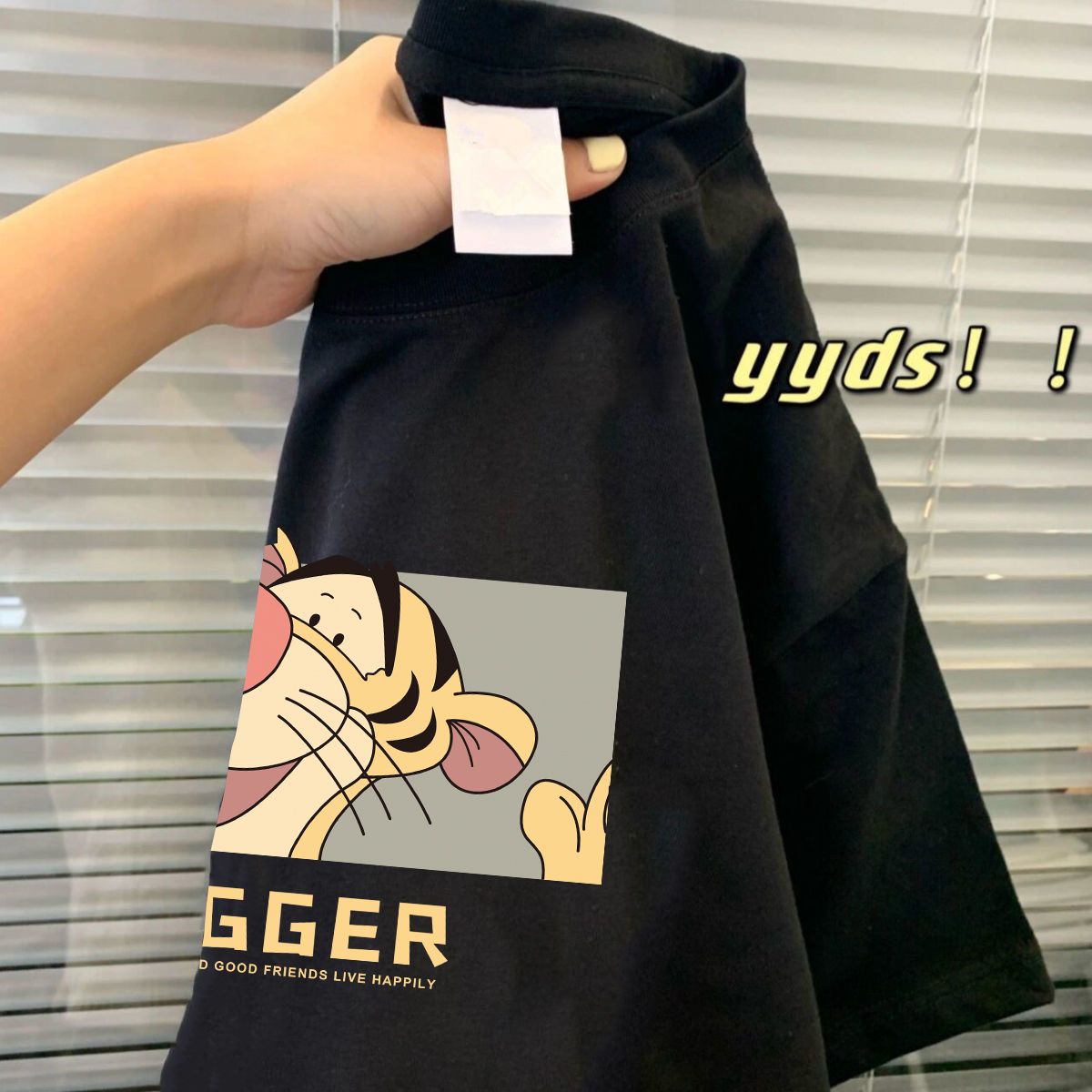 显瘦黑色冰丝港风ins草莓熊印花体恤衫圆领短袖T恤男女同款情侣装