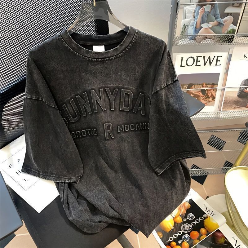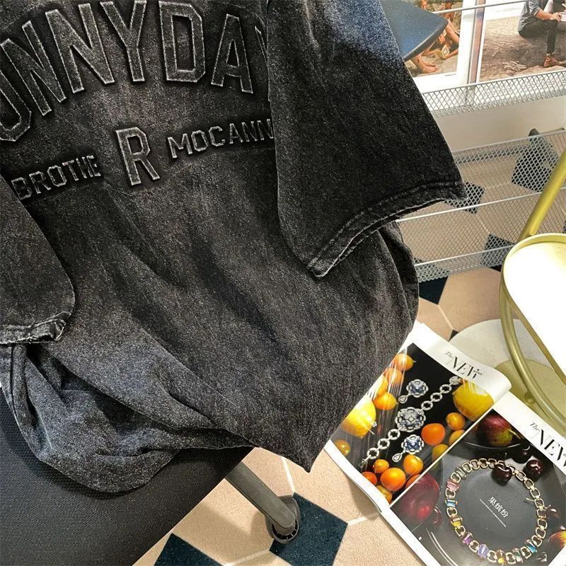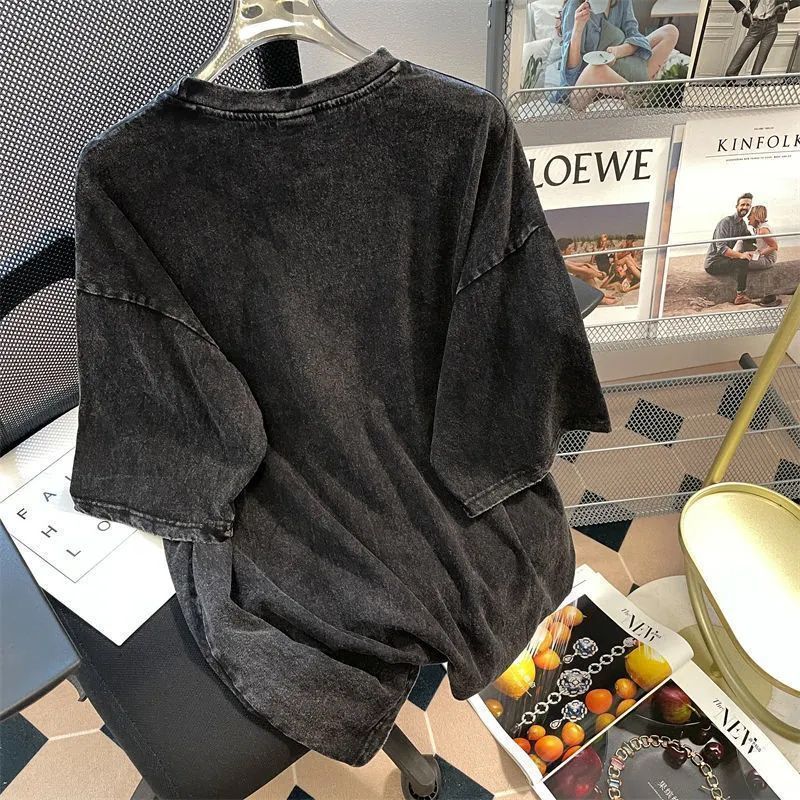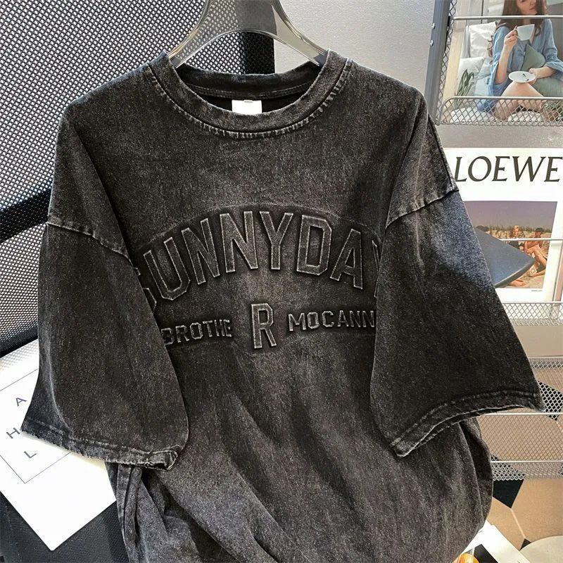 100%抗起球水洗做旧美式重工印花字母T恤男女宽松