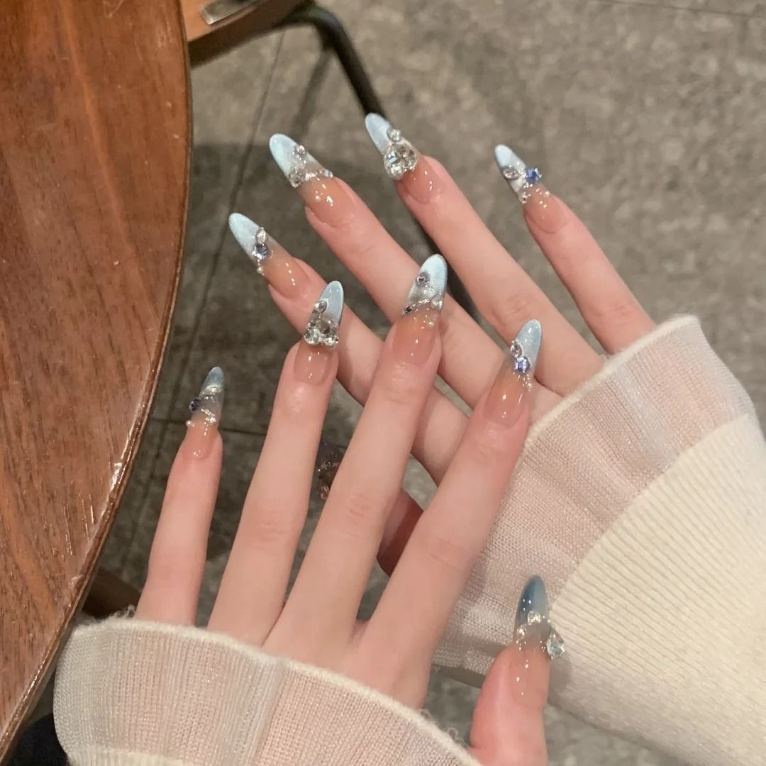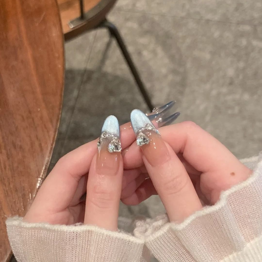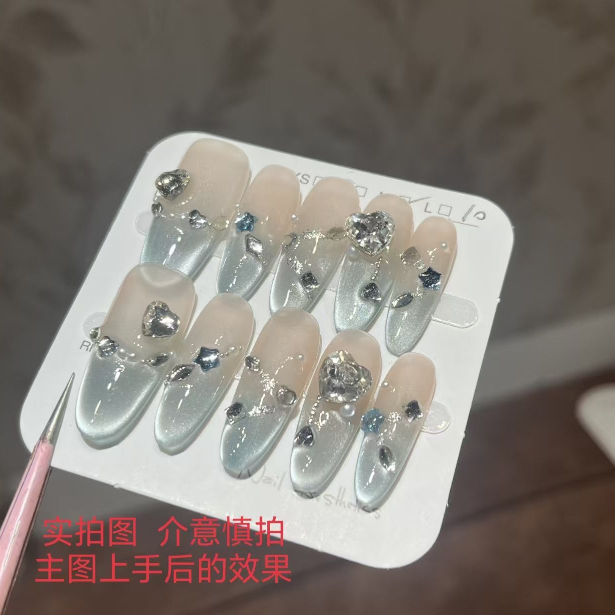 手工美甲穿戴甲水光感法式蓝色猫眼满钻少女心氛围感ins辣妹学生