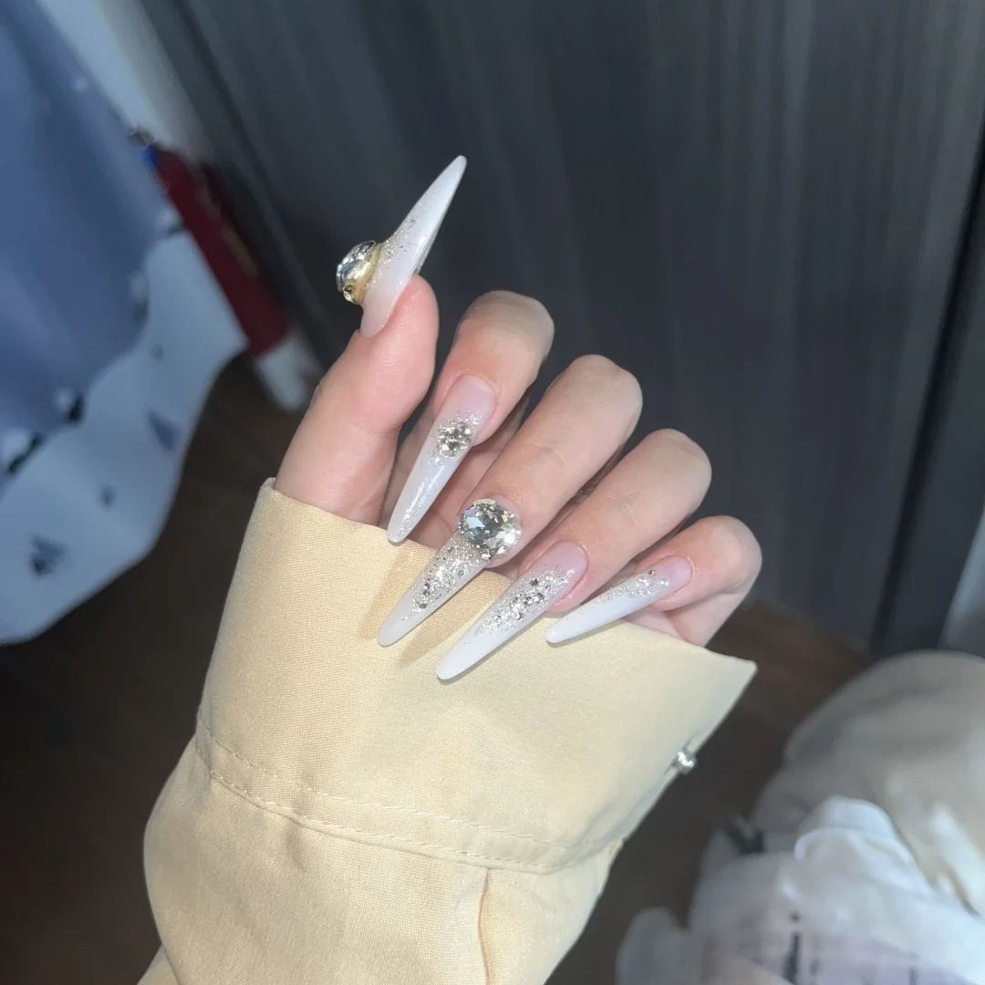 气质女神爆闪纯欲风千金乳白渐变纯手工穿戴爆闪堆钻轻奢氛围美甲