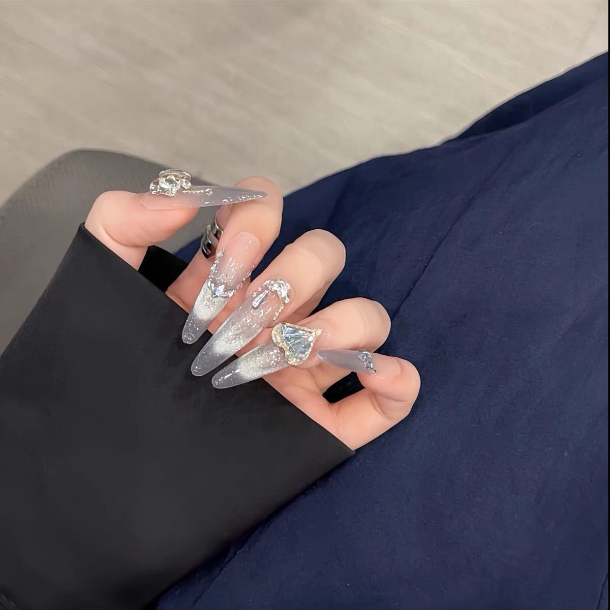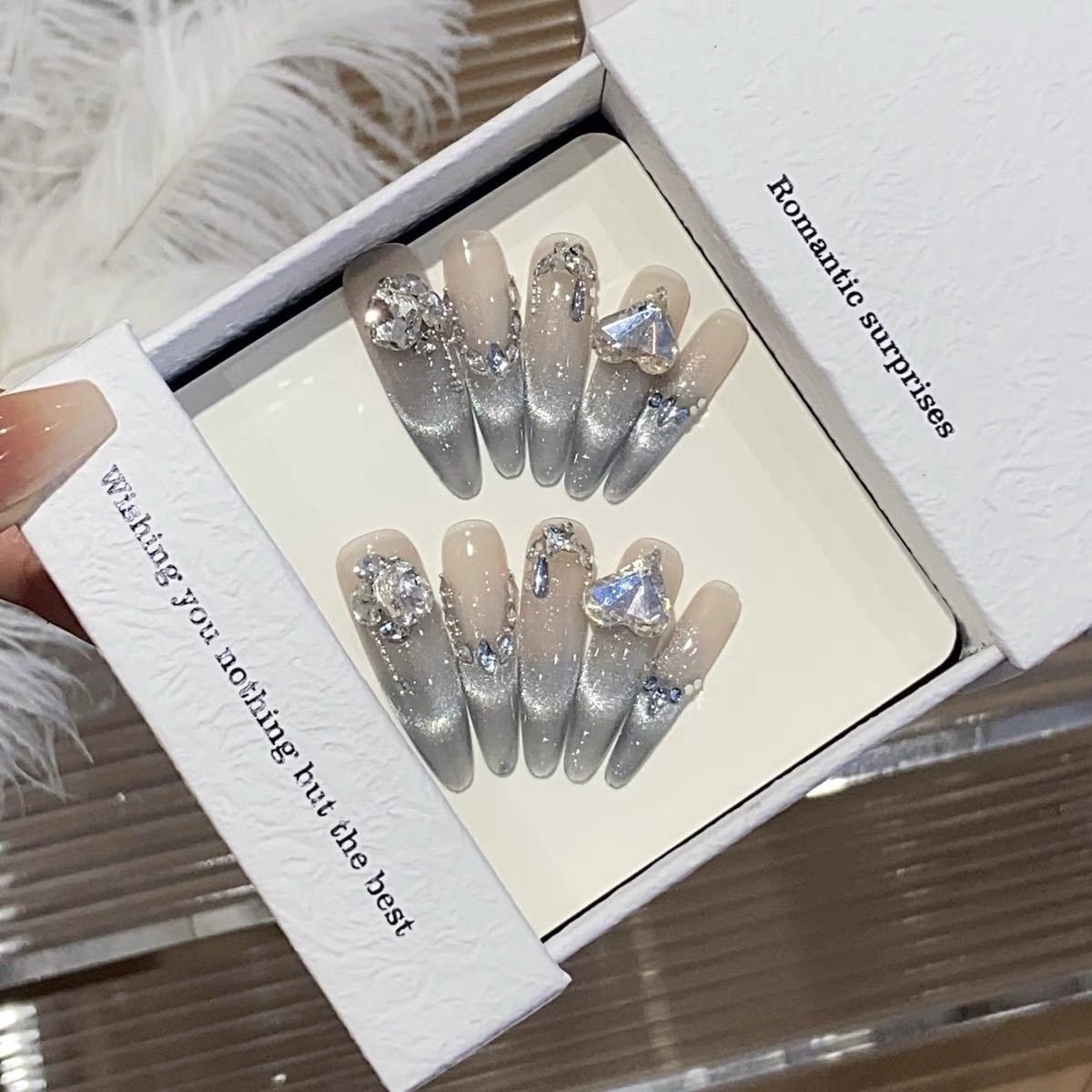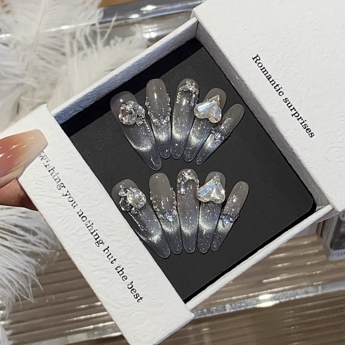 穿戴甲细狗穿戴轻奢高级氛围璀璨歪心微笑法式猫眼欧美美甲纯手工