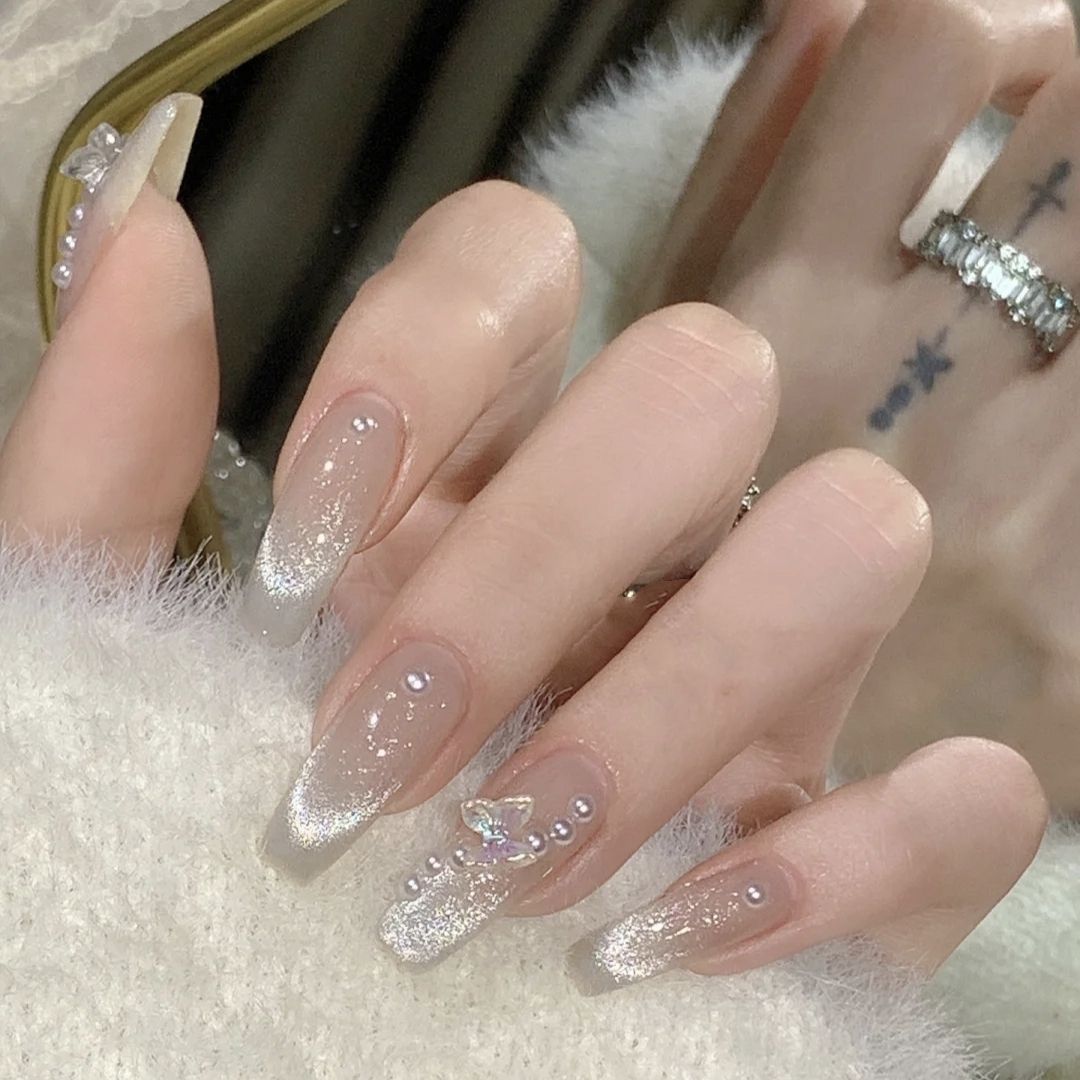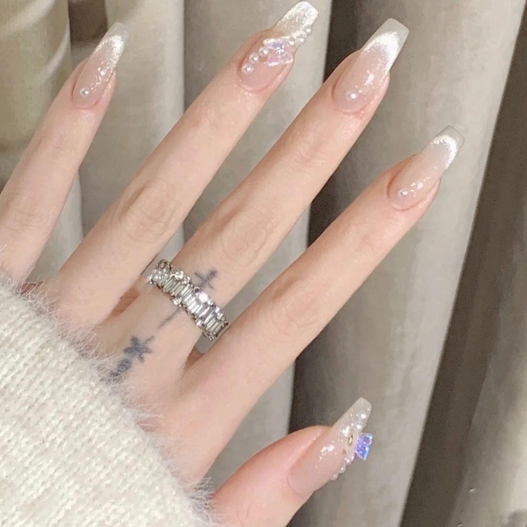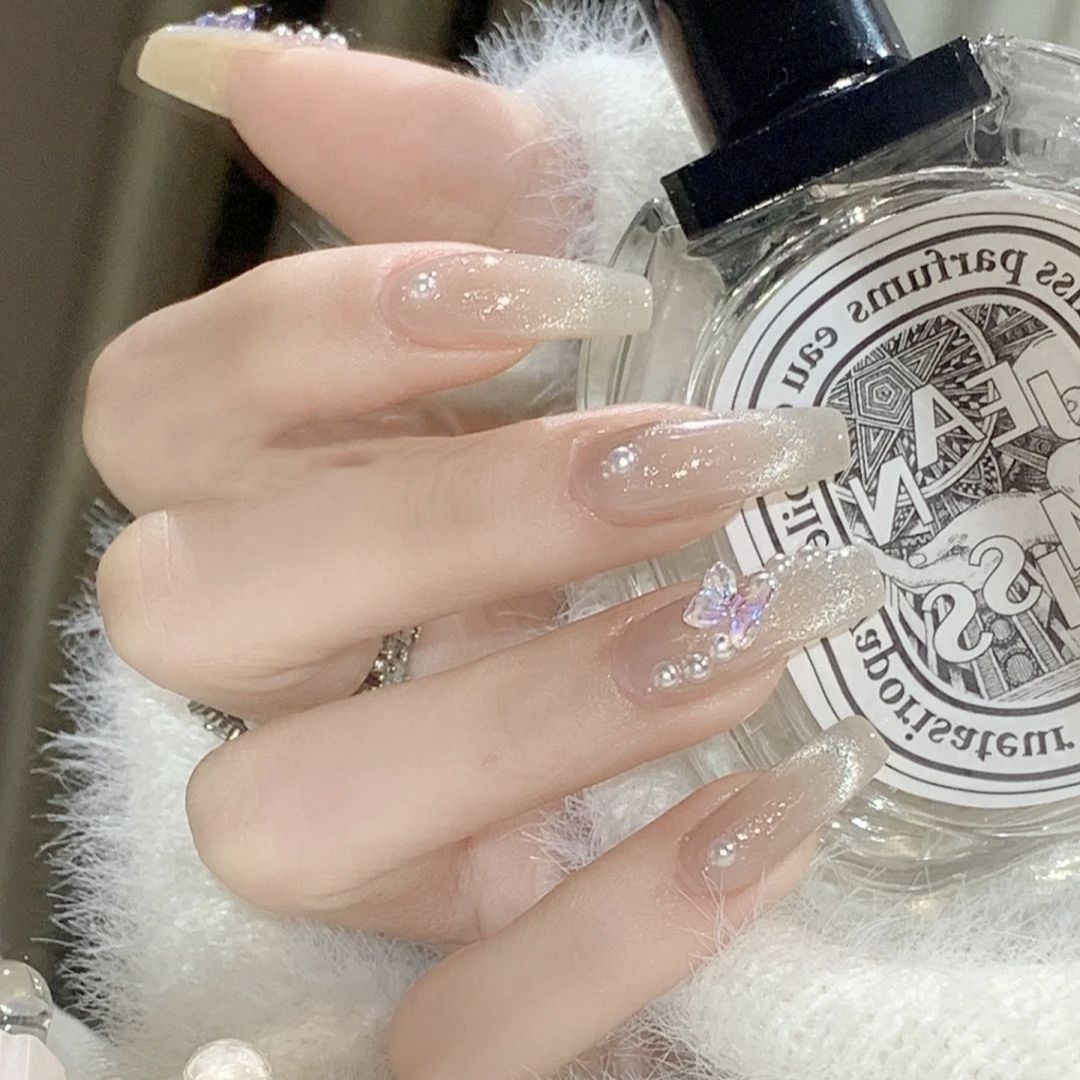 纯手工穿戴甲美甲贴成品猫眼珍珠立体蝴蝶气质显白假指甲贴成品