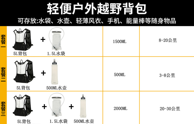 | 背包+白色1.5L软水袋+500ml水壶 | USD $13.4 | 3233 piece available |