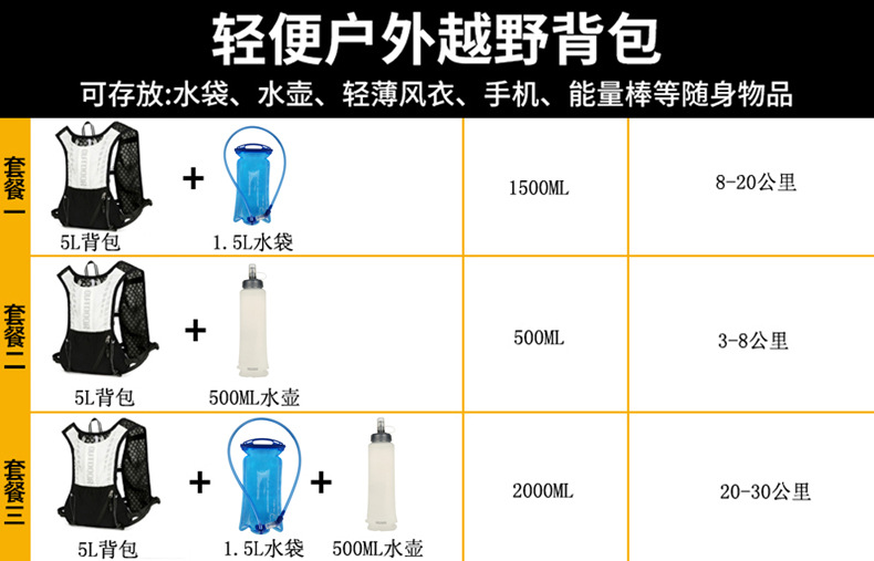| 背包+白色1.5L软水袋+500ml水壶 | USD $13.4 | 3244 piece available |