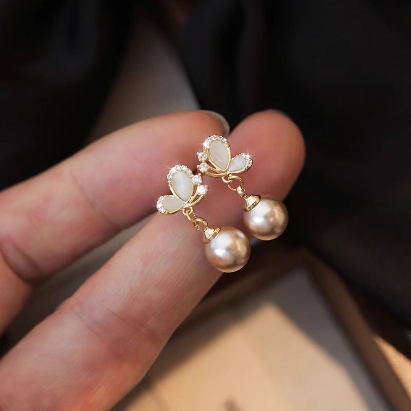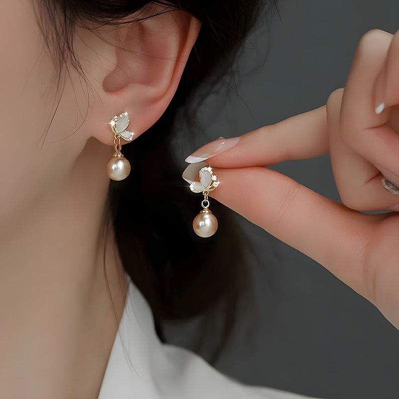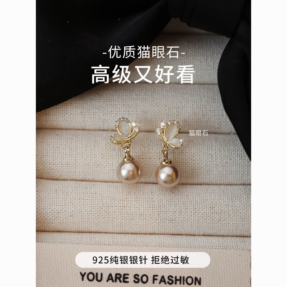 纯银耳钉蝴蝶香槟色珍珠耳环2025新款爆款高级感耳钉小众气质耳饰