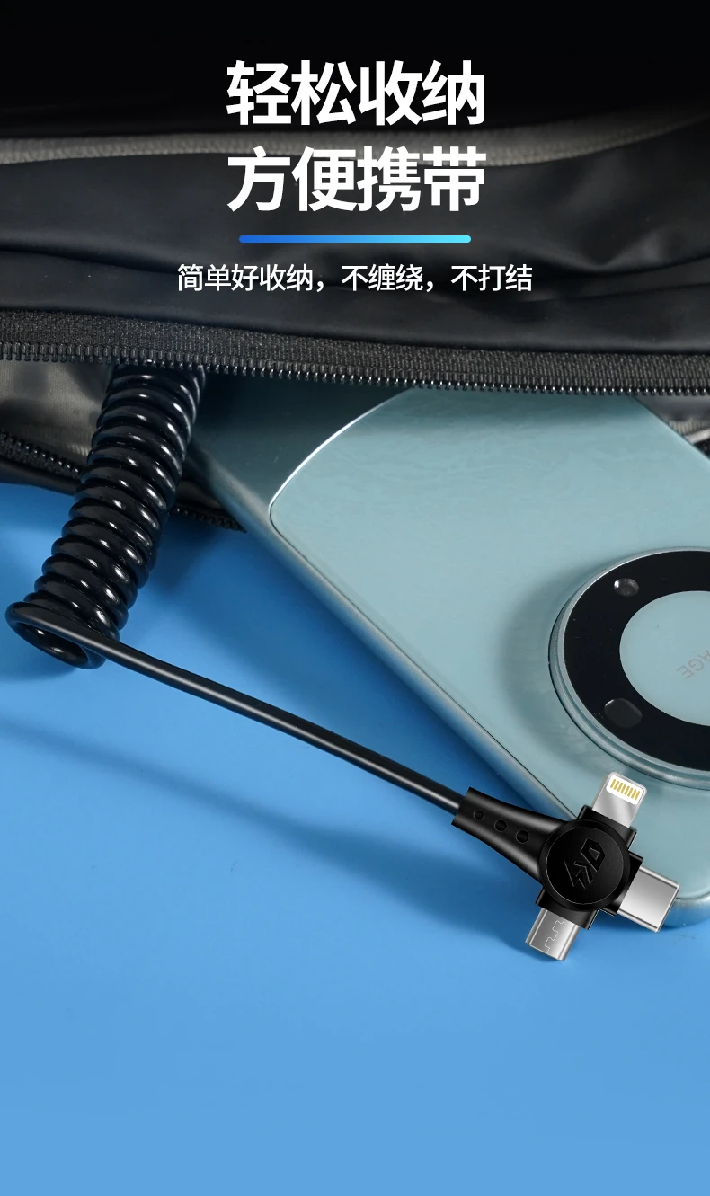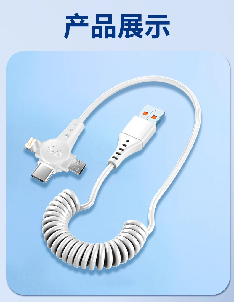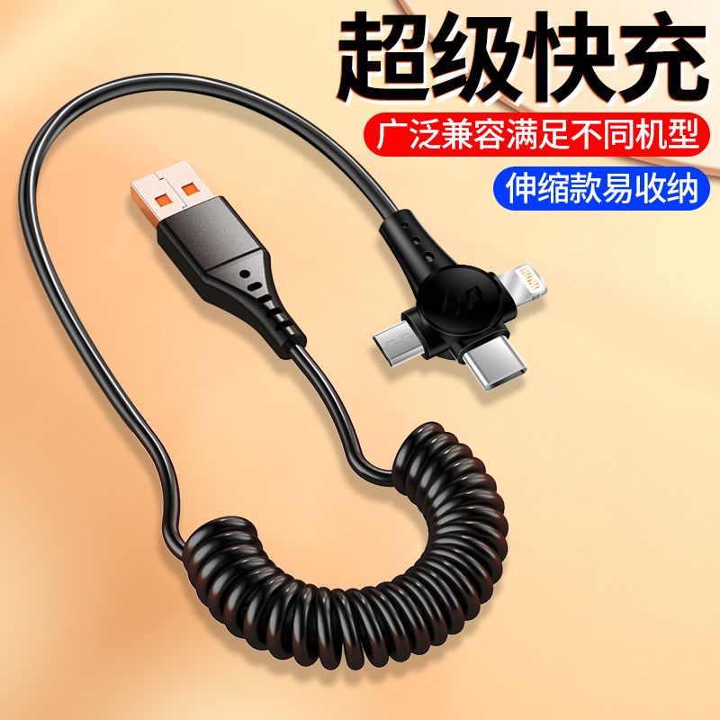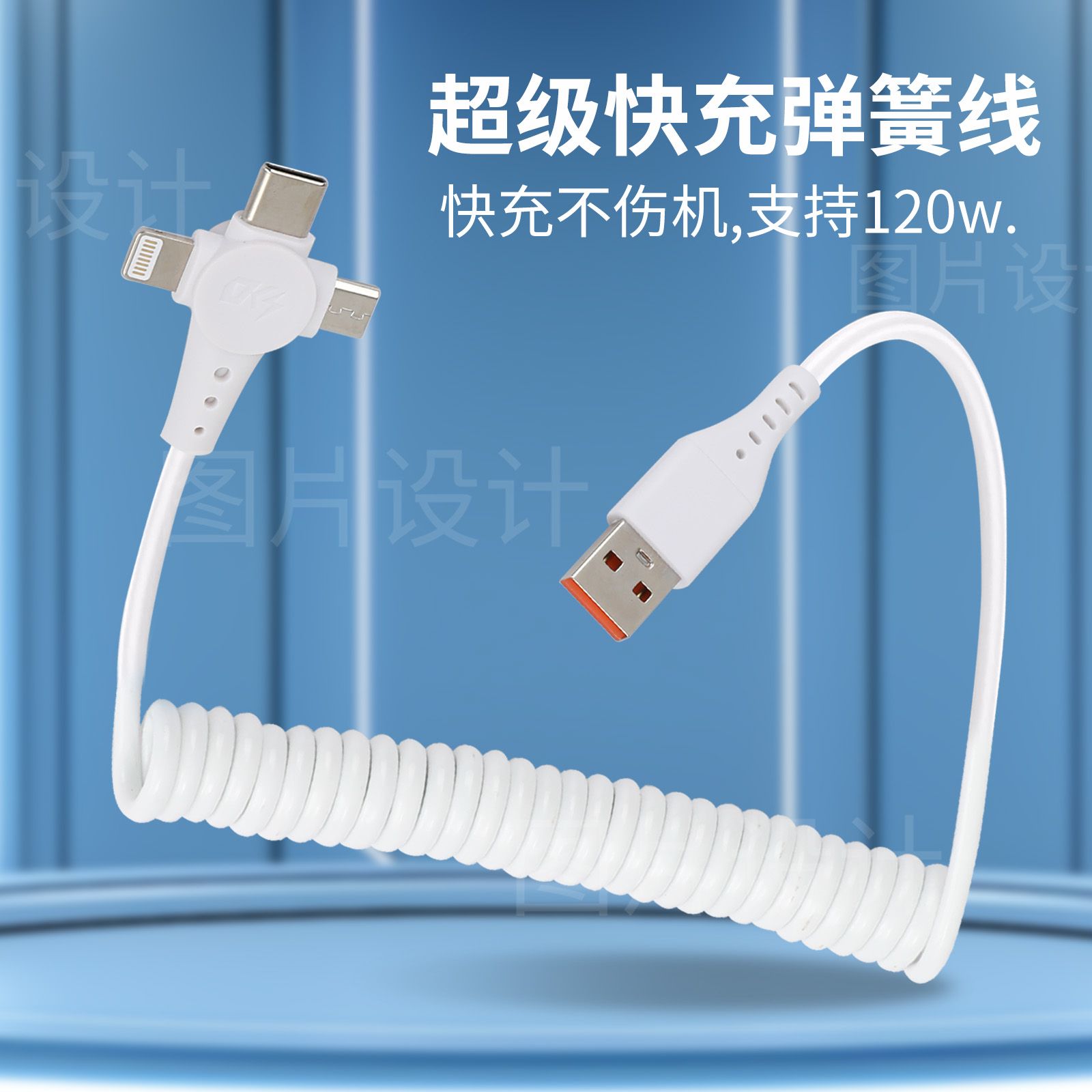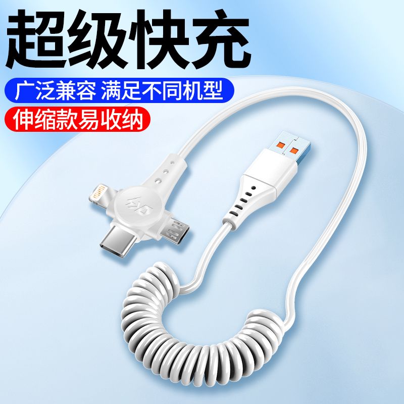 弹簧三合一超级快充数据线适用华为小米vivo苹果充电车载