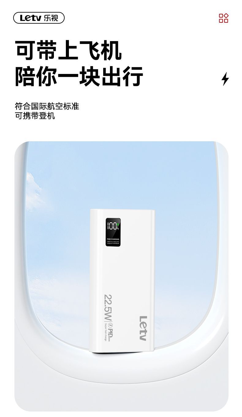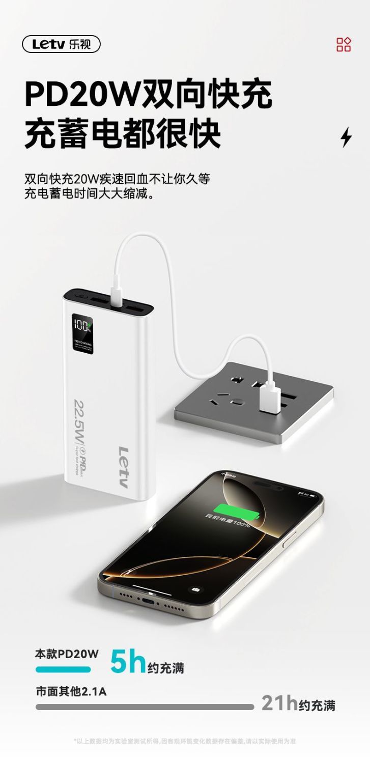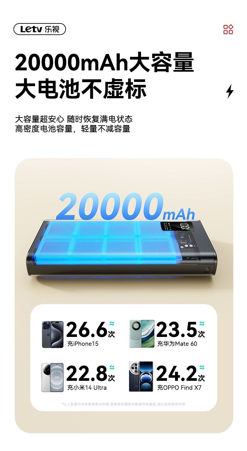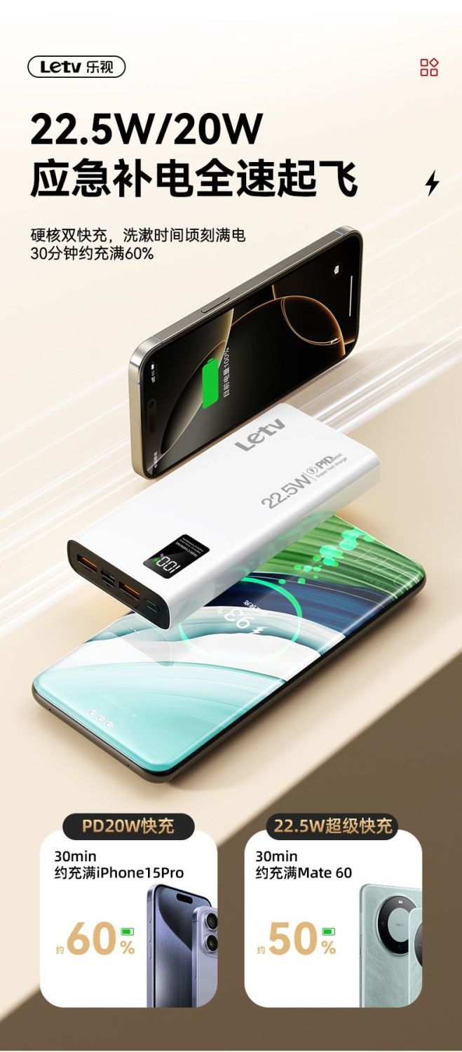 乐视大容量充电宝20000毫安22.5超级快充手机通用便携移动电源