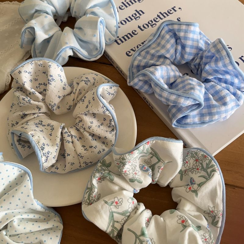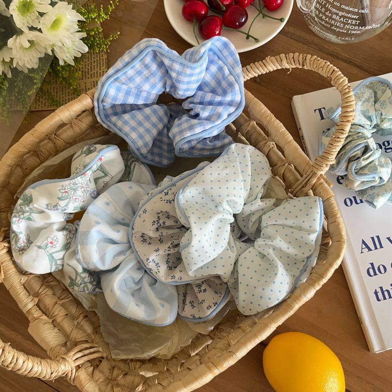 海盐蓝色系波点格纹碎花大肠发圈头绳甜美百搭布艺扎发皮筋发饰品