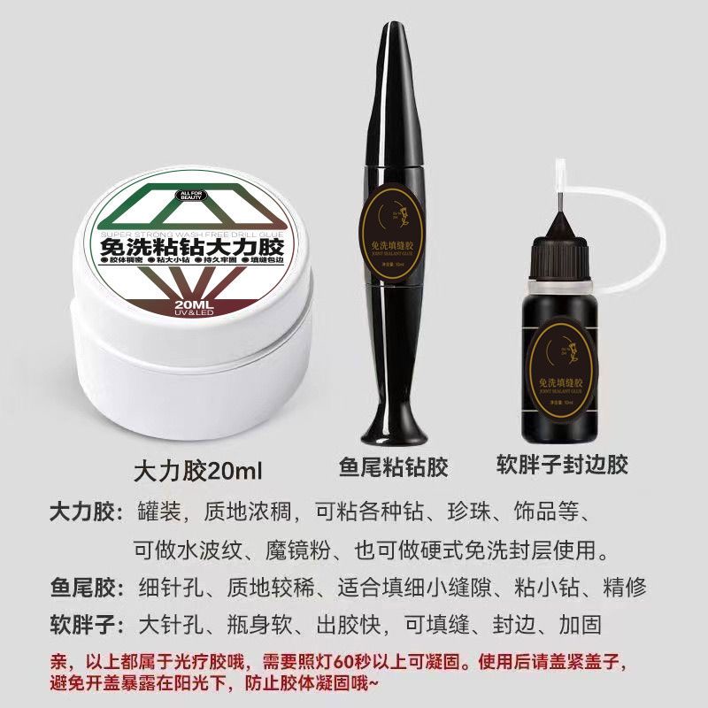 | vigorously glue gel 20ml + soft fat caulking glue + uv pen(大力贴钻胶20ml+软胖子填缝胶+光疗笔) | USD $2.55 | 999999 piece available |
