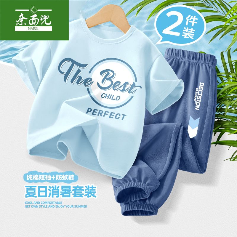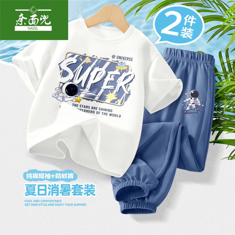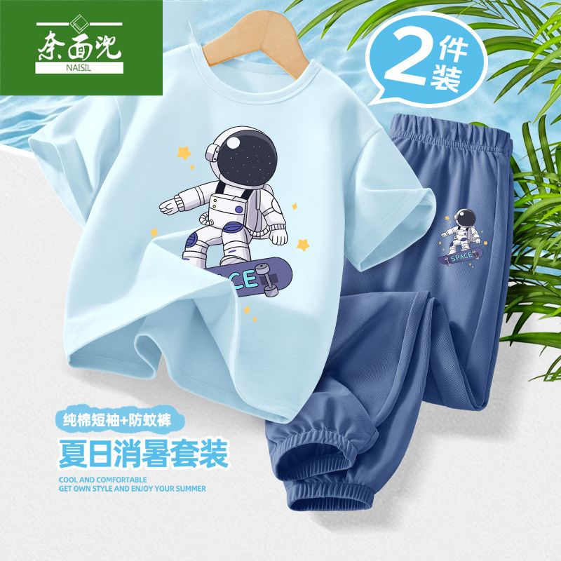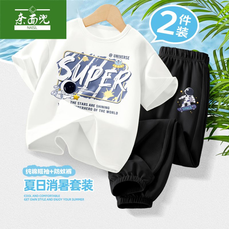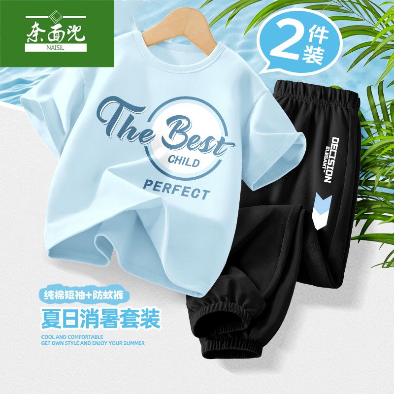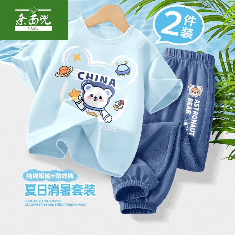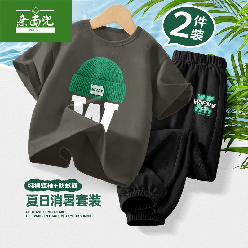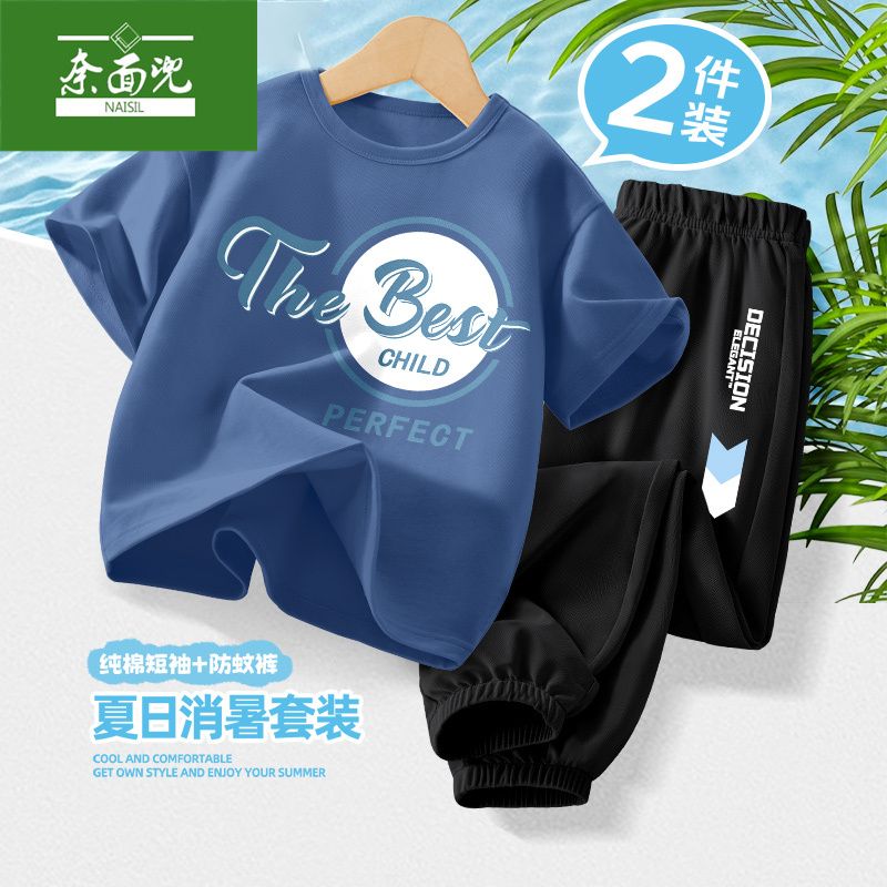 男童短袖t恤纯棉2024新款夏装中大童半袖上衣儿童夏季防蚊裤套装