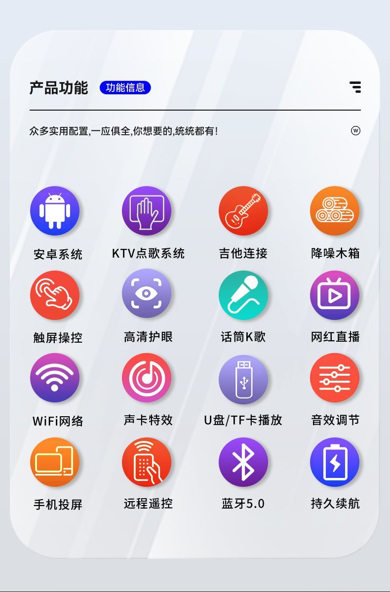 | 8 speaker voice touch screen version +1 rechargeable microphone +64g usb flash drive(8喇叭语音触屏版+1支充电话筒+64G优盘) | USD $287.54 | 999999 piece available |