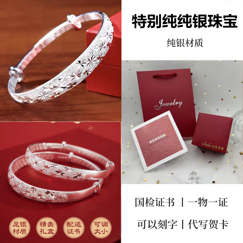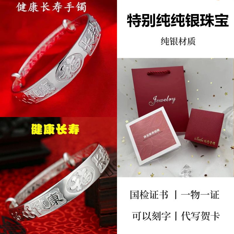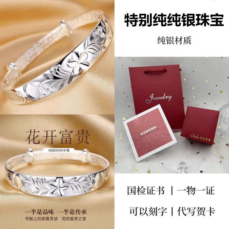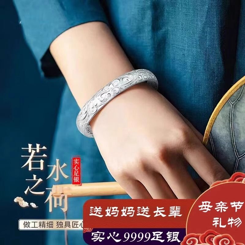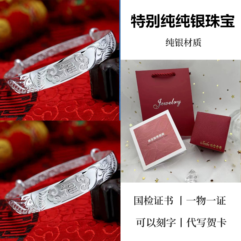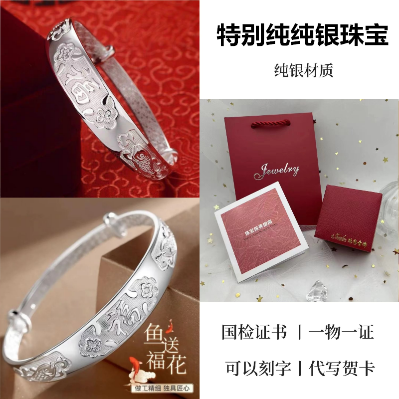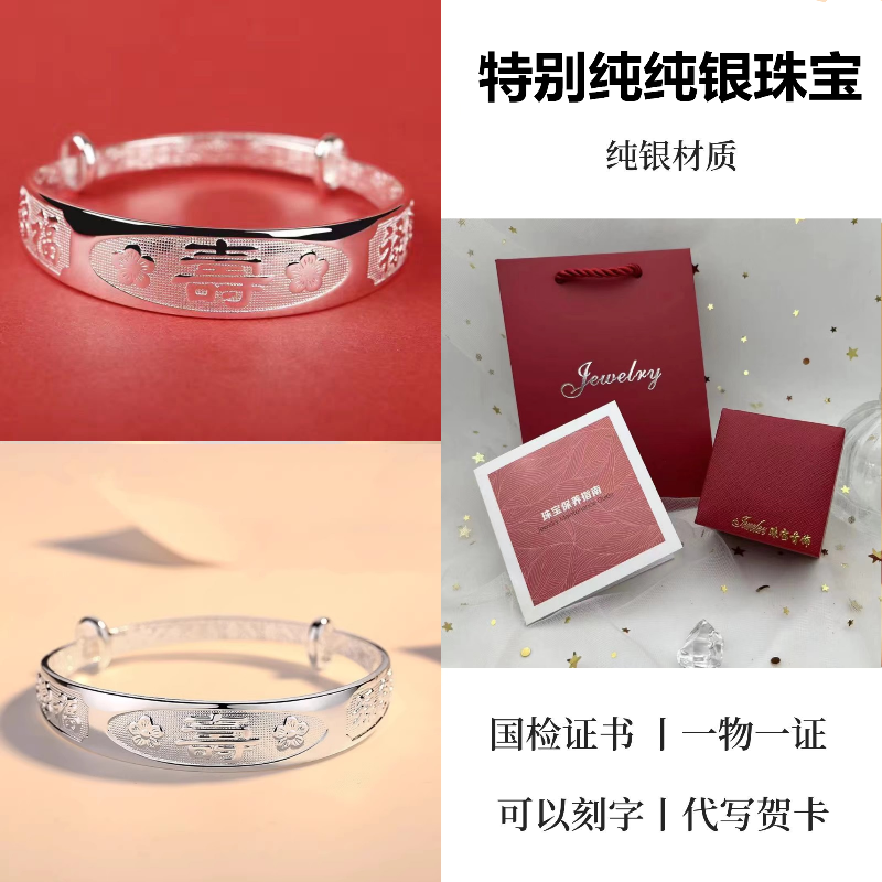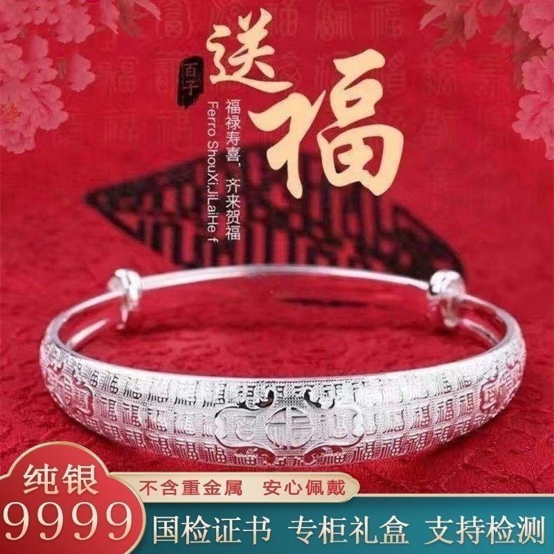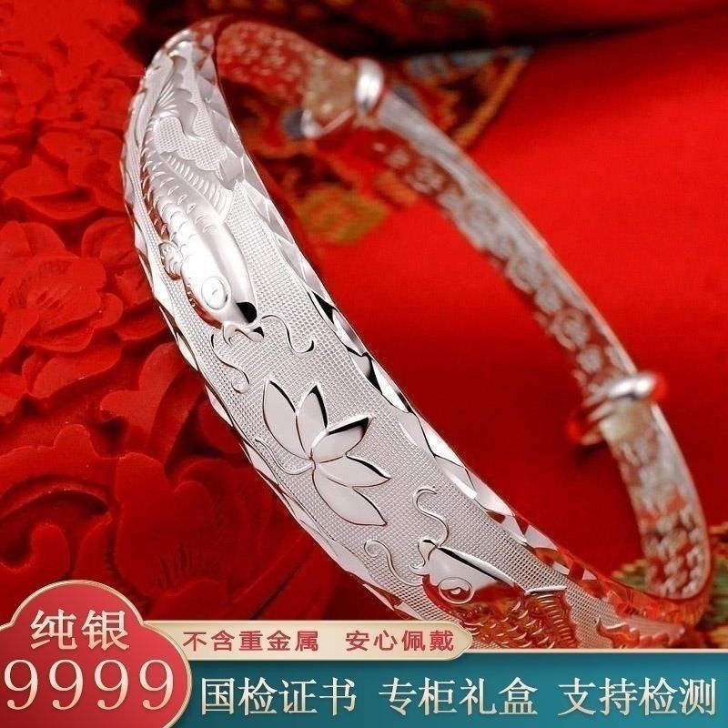 9999纯银手镯女中老年人款足银镯子实心龙凤福字奶奶礼物送妈妈的