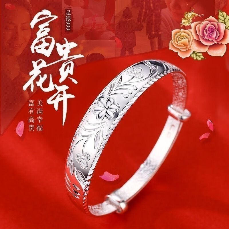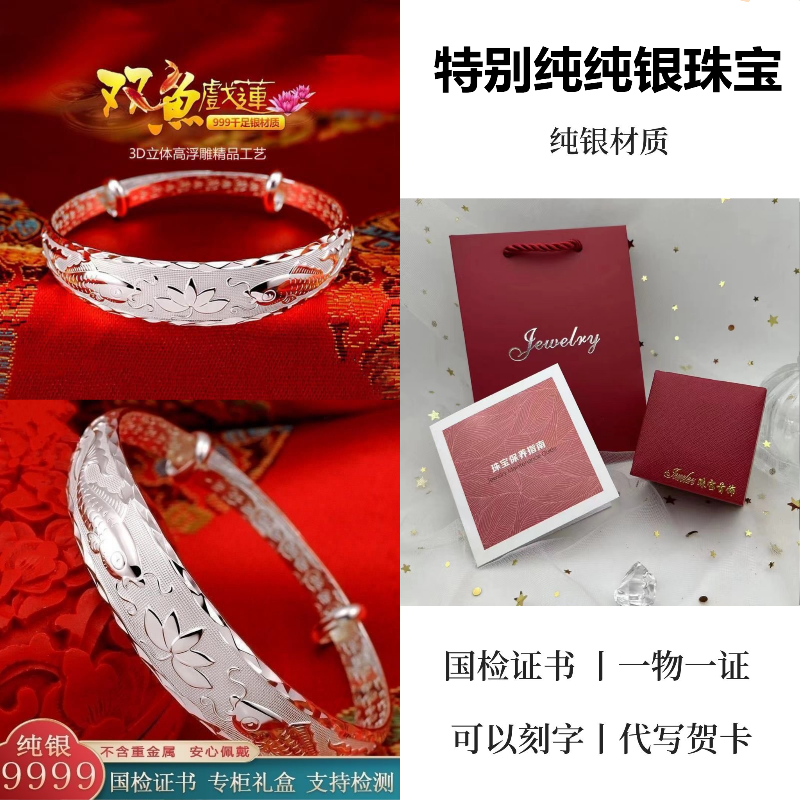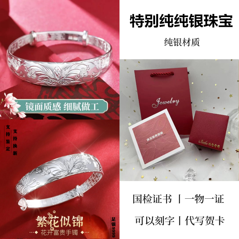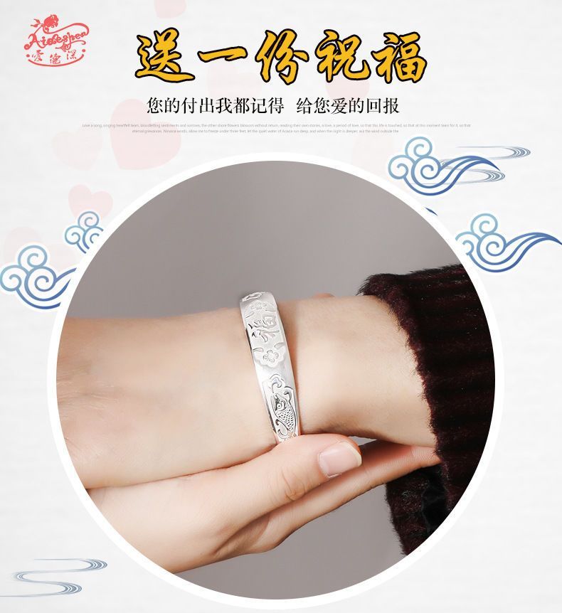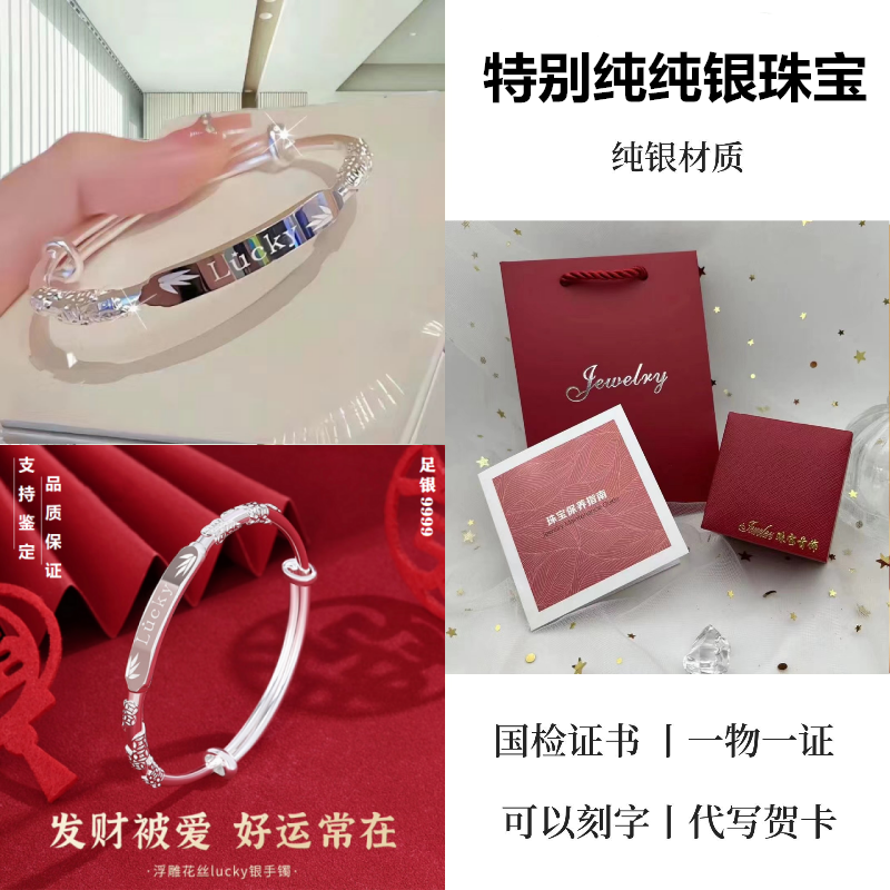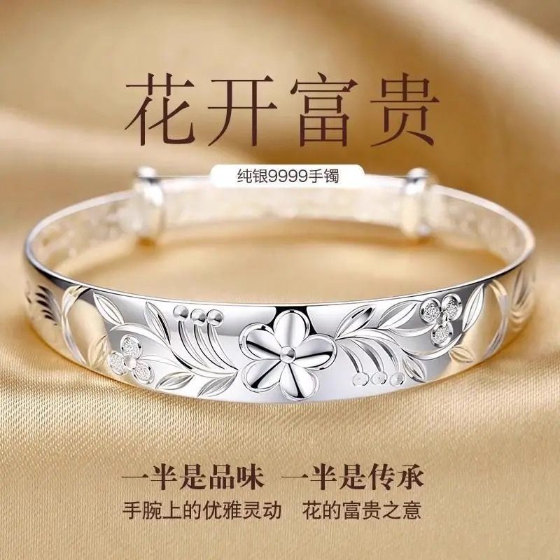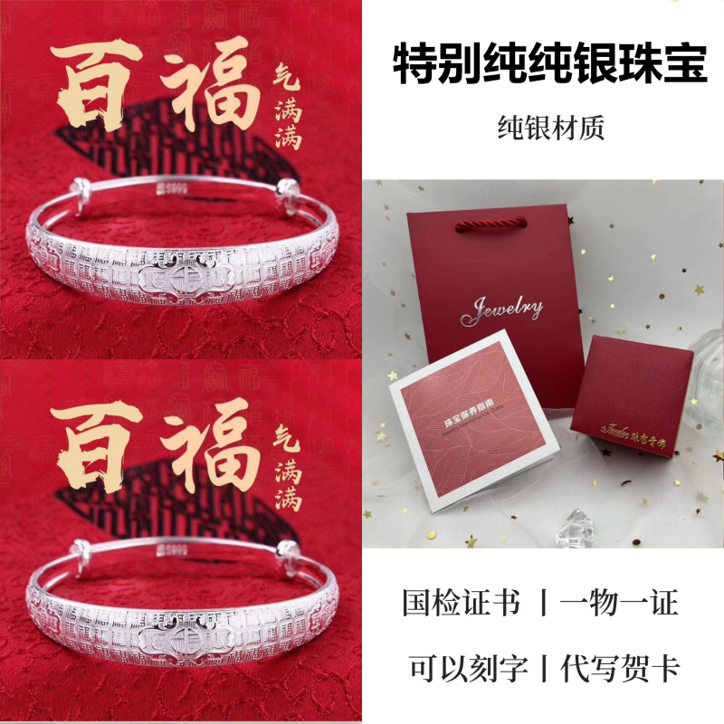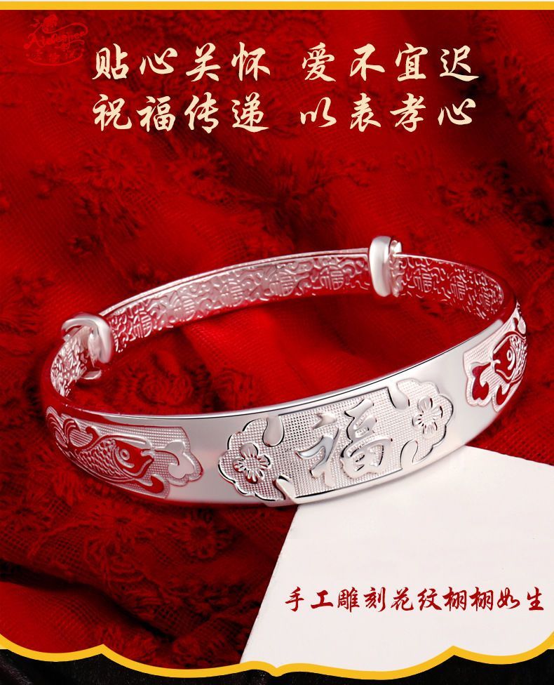 9999纯银手镯女中老年人款足银镯子实心龙凤福字奶奶礼物送妈妈的