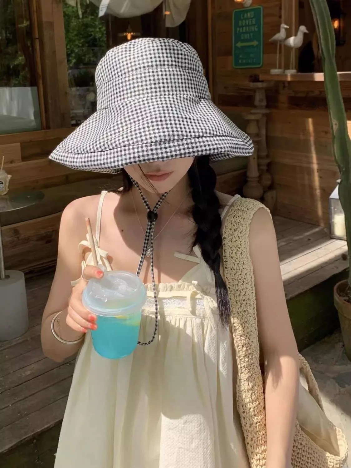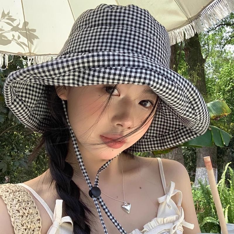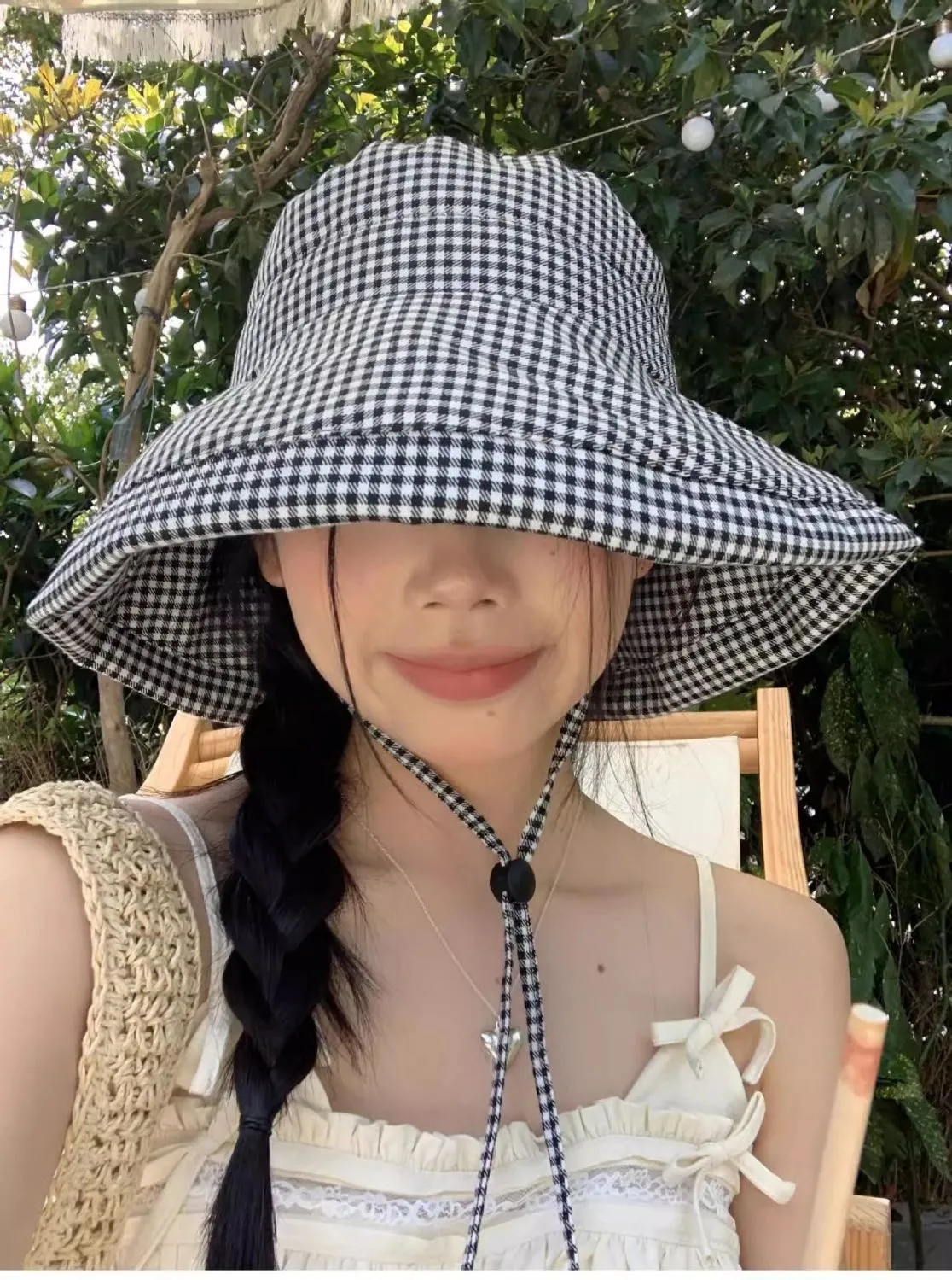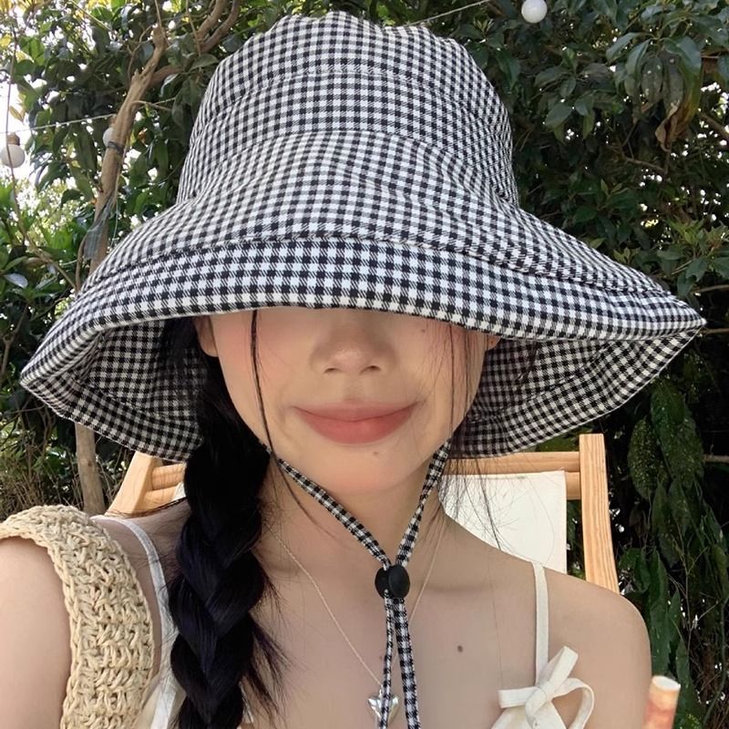 大檐夏季紫外线遮阳帽遮阳遮脸千鸟格子防晒帽檐渔夫帽太阳帽帽子