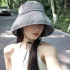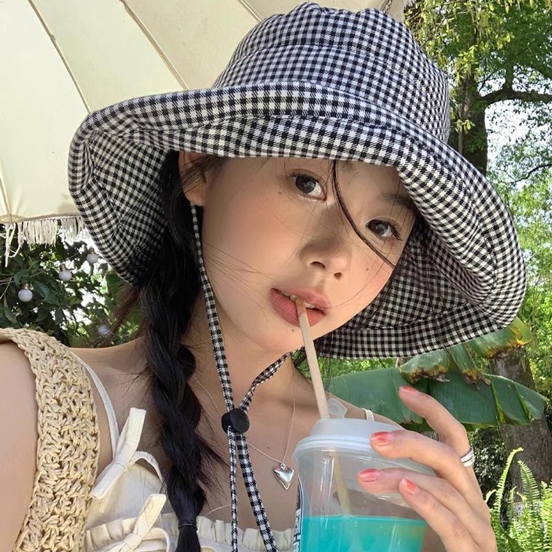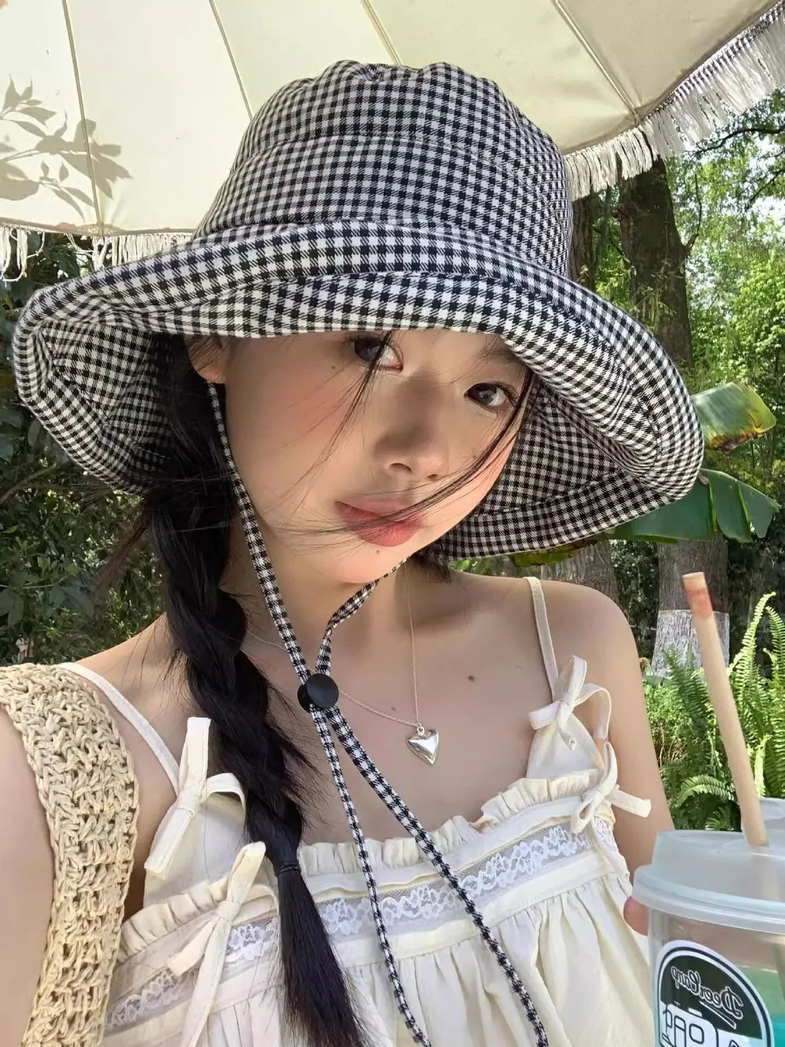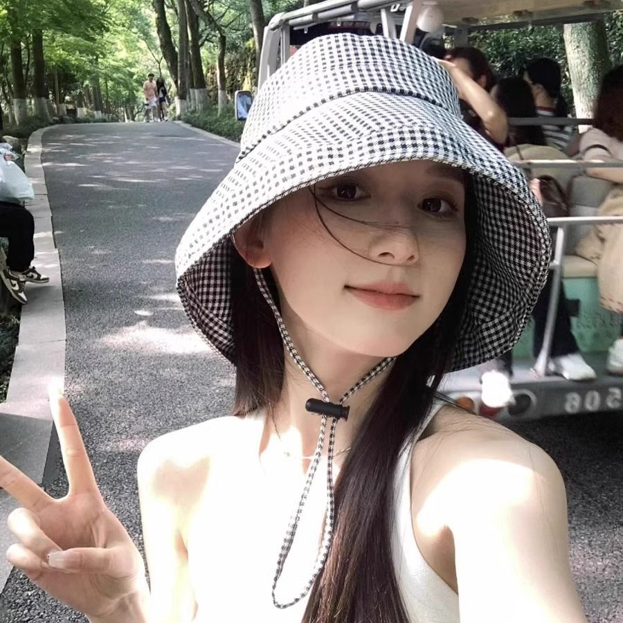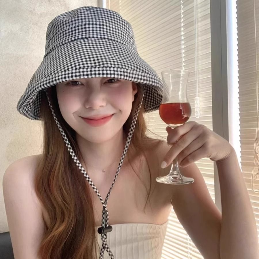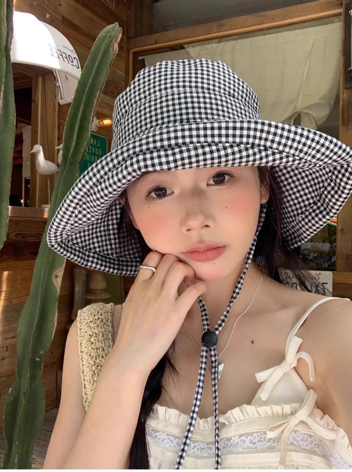 大檐夏季紫外线遮阳帽遮阳遮脸千鸟格子防晒帽檐渔夫帽太阳帽帽子