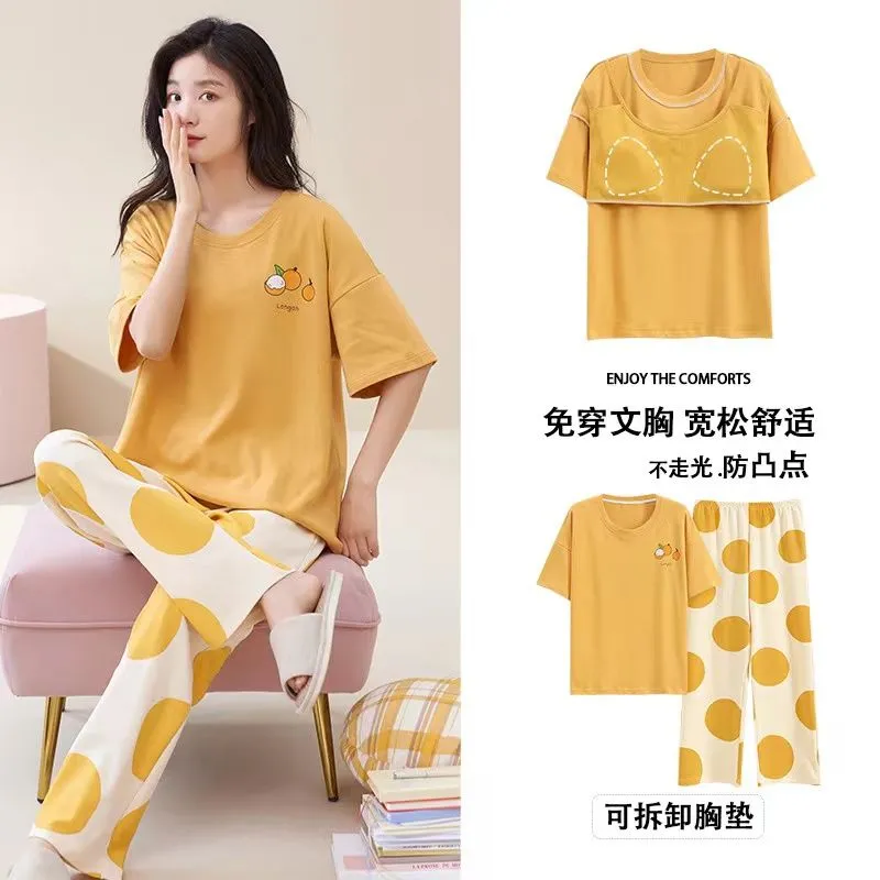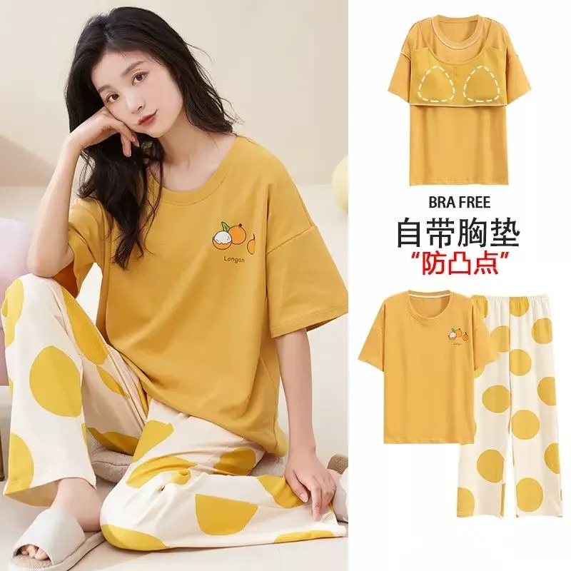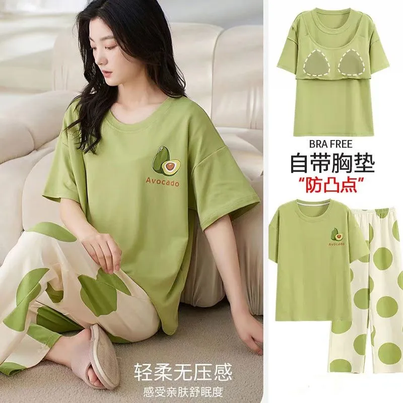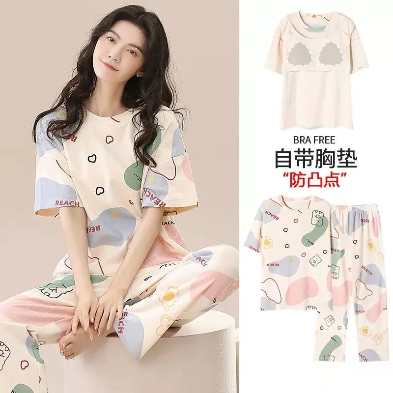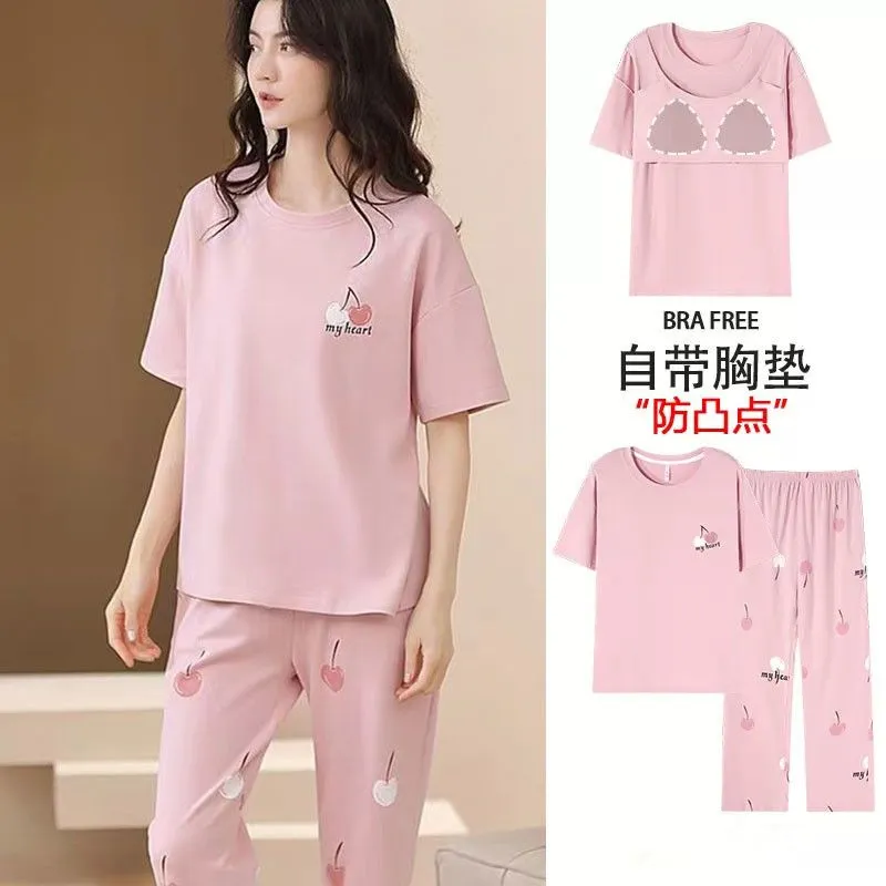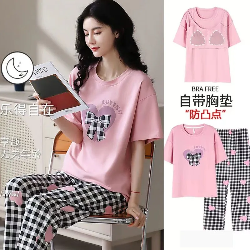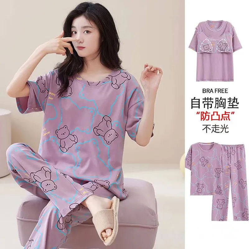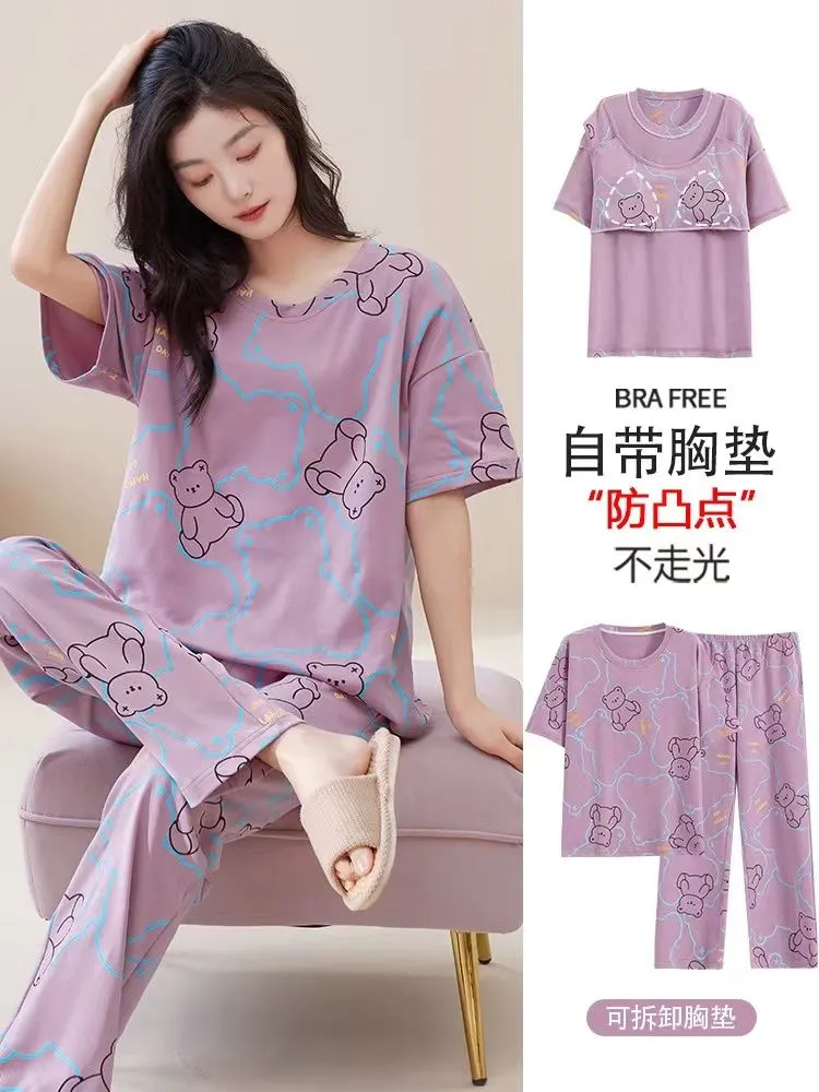 【买一送一】睡衣女夏防凸点两件套带胸垫大码卡通短袖长裤可外穿