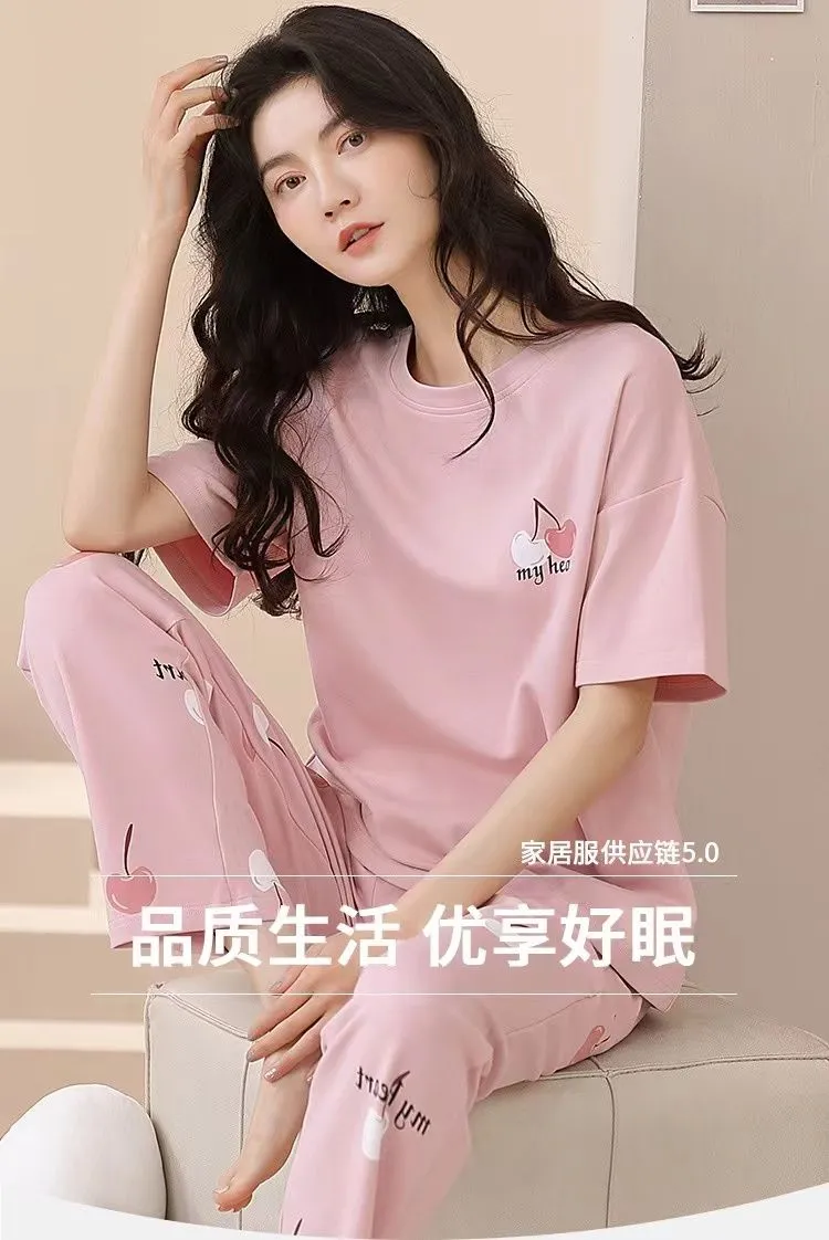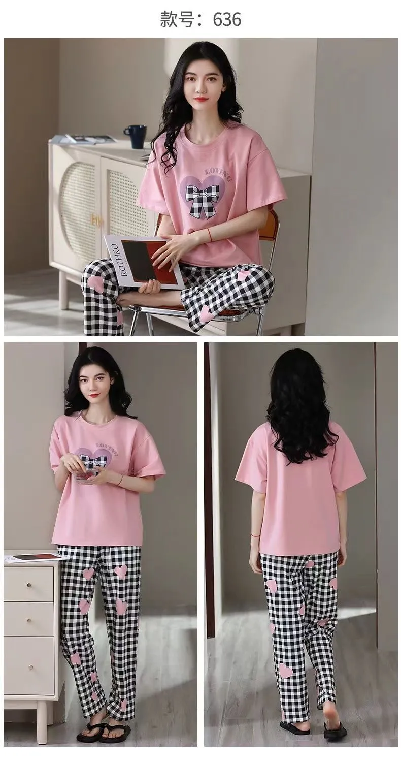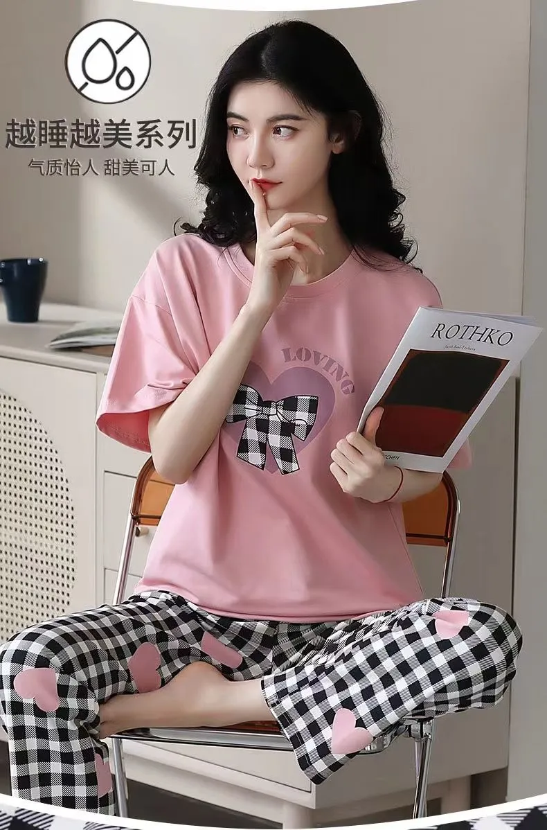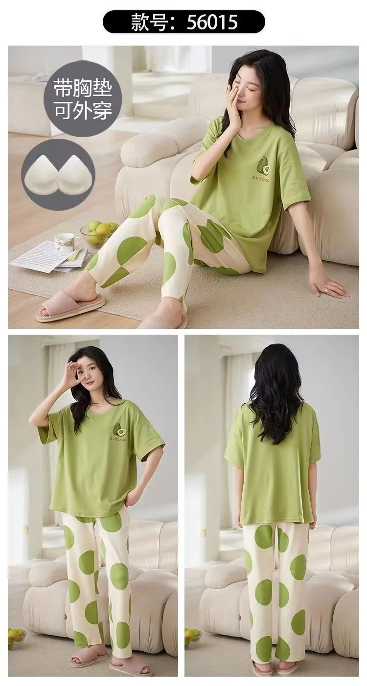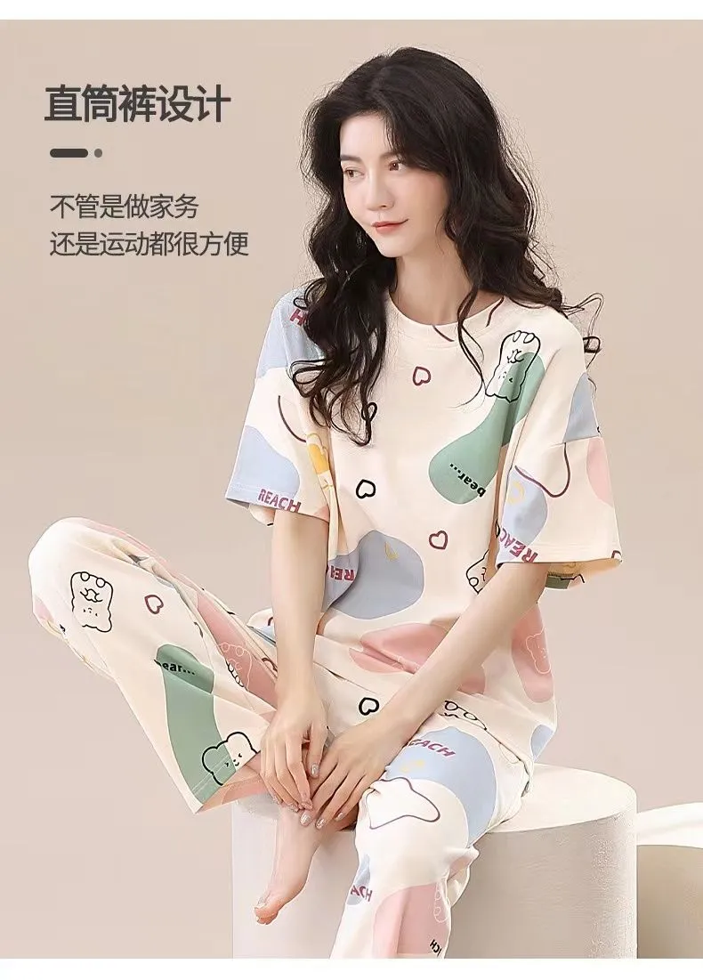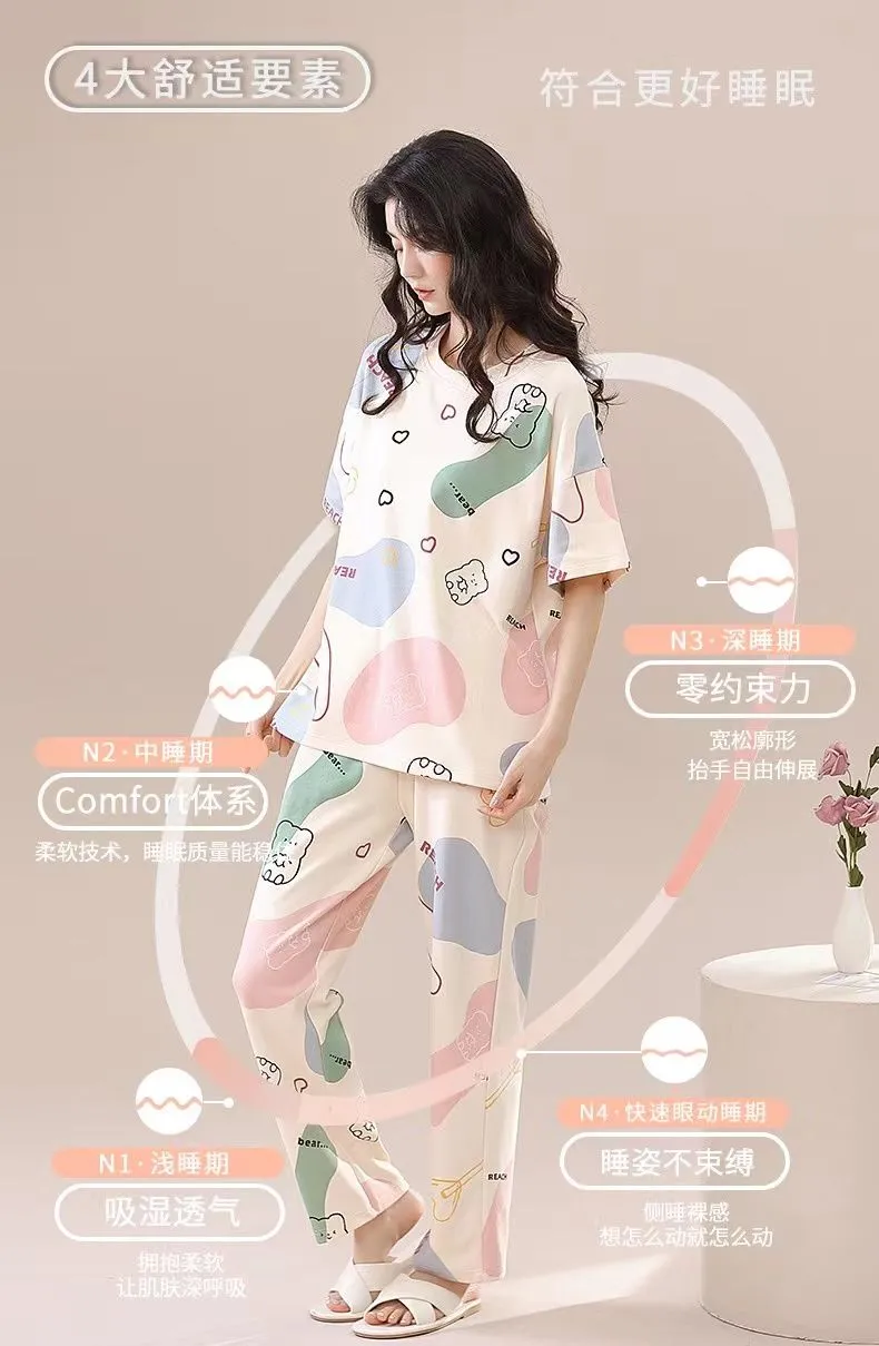 【买一送一】睡衣女夏防凸点两件套带胸垫大码卡通短袖长裤可外穿