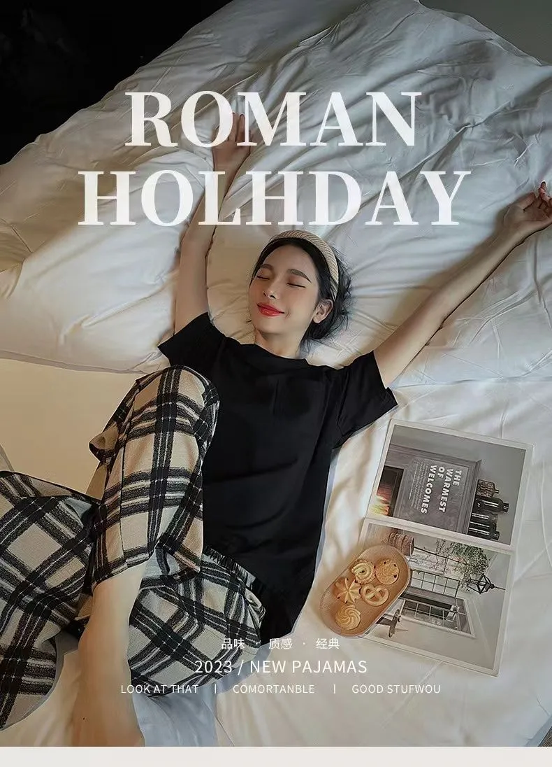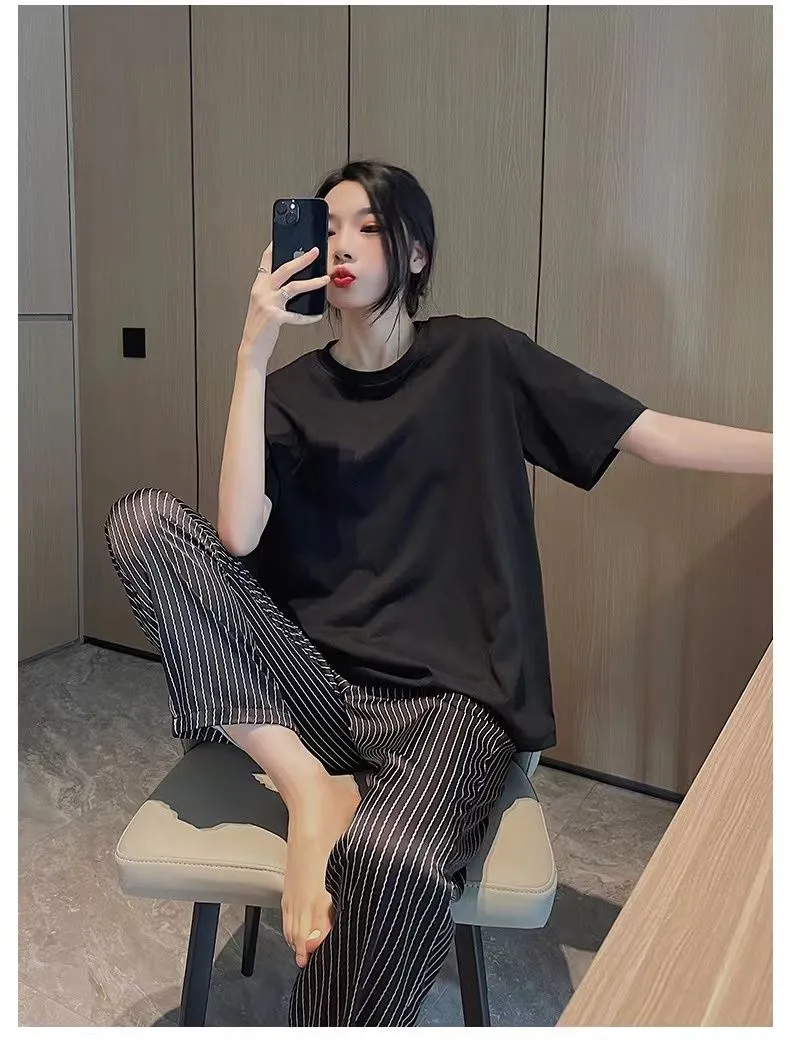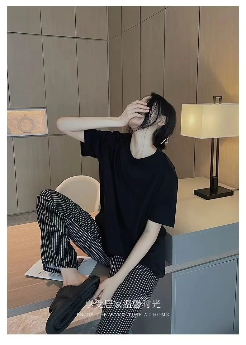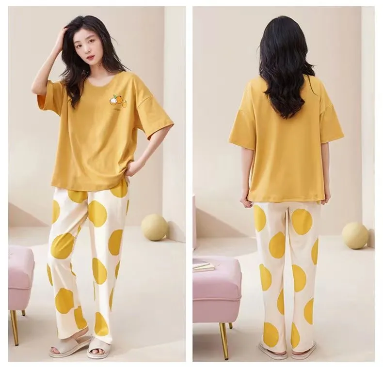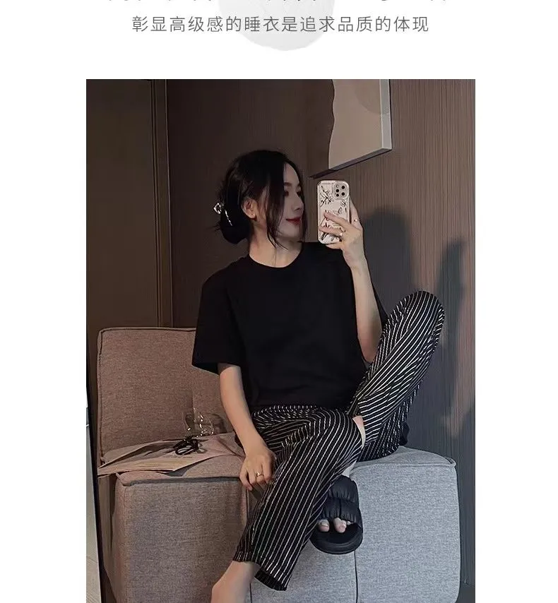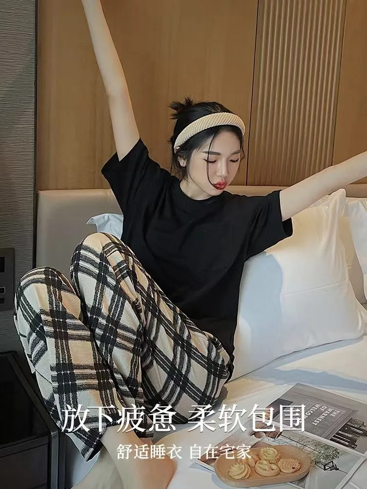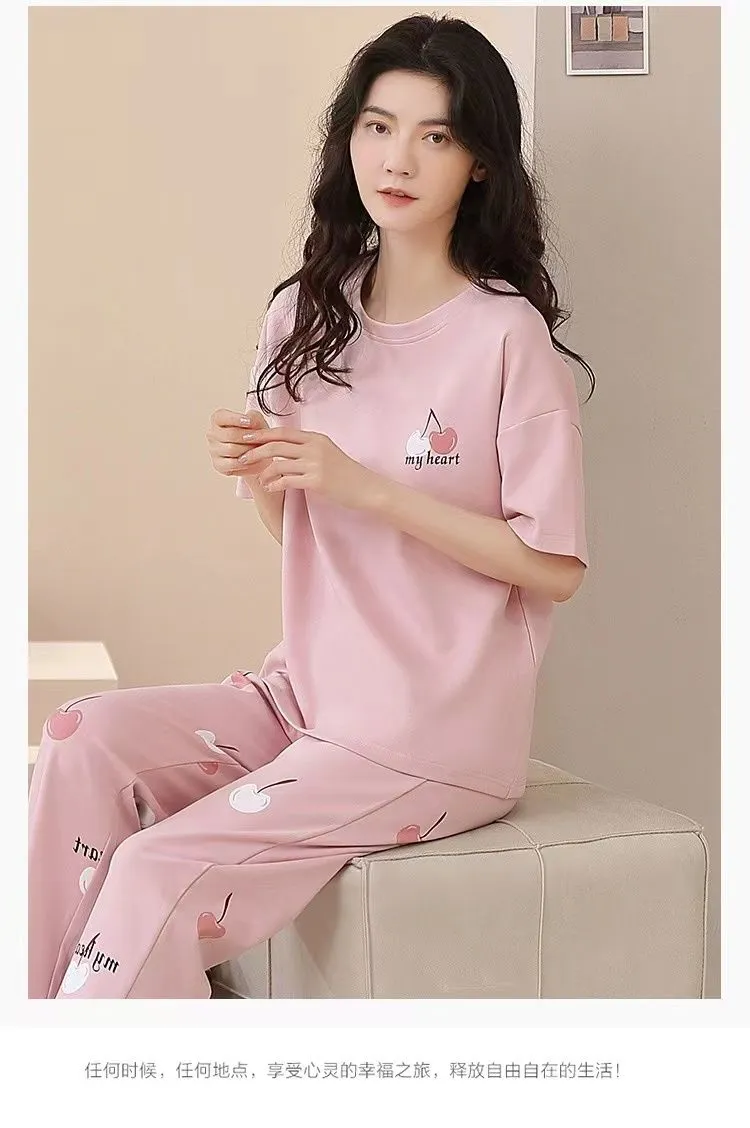 【买一送一】睡衣女夏防凸点两件套带胸垫大码卡通短袖长裤可外穿