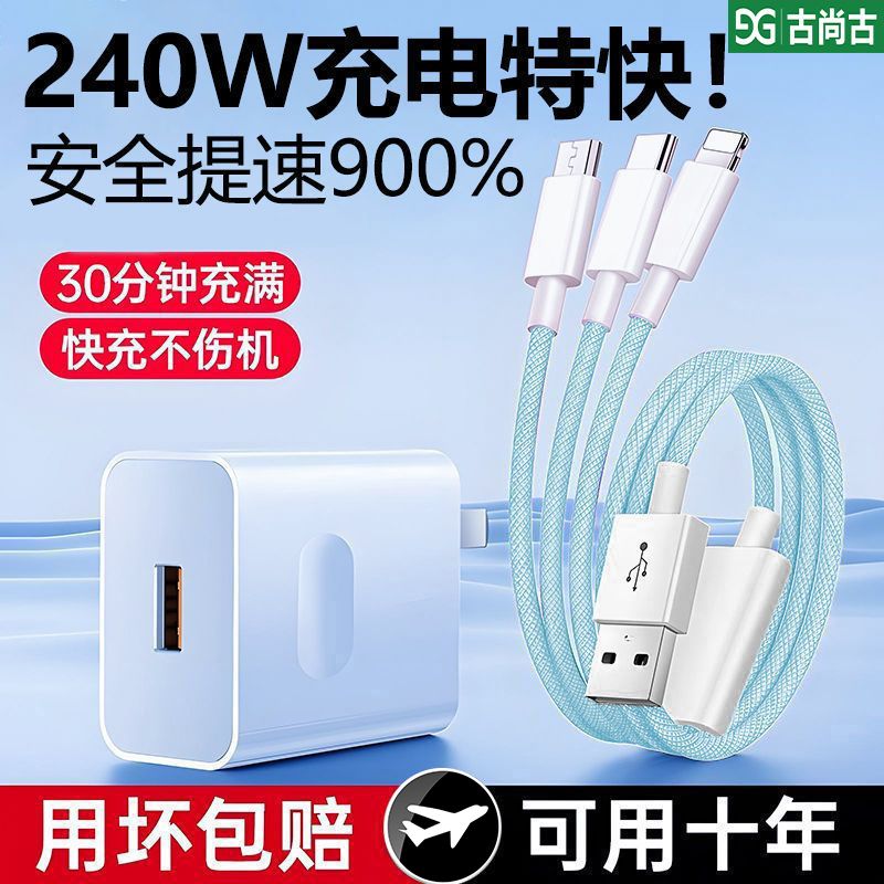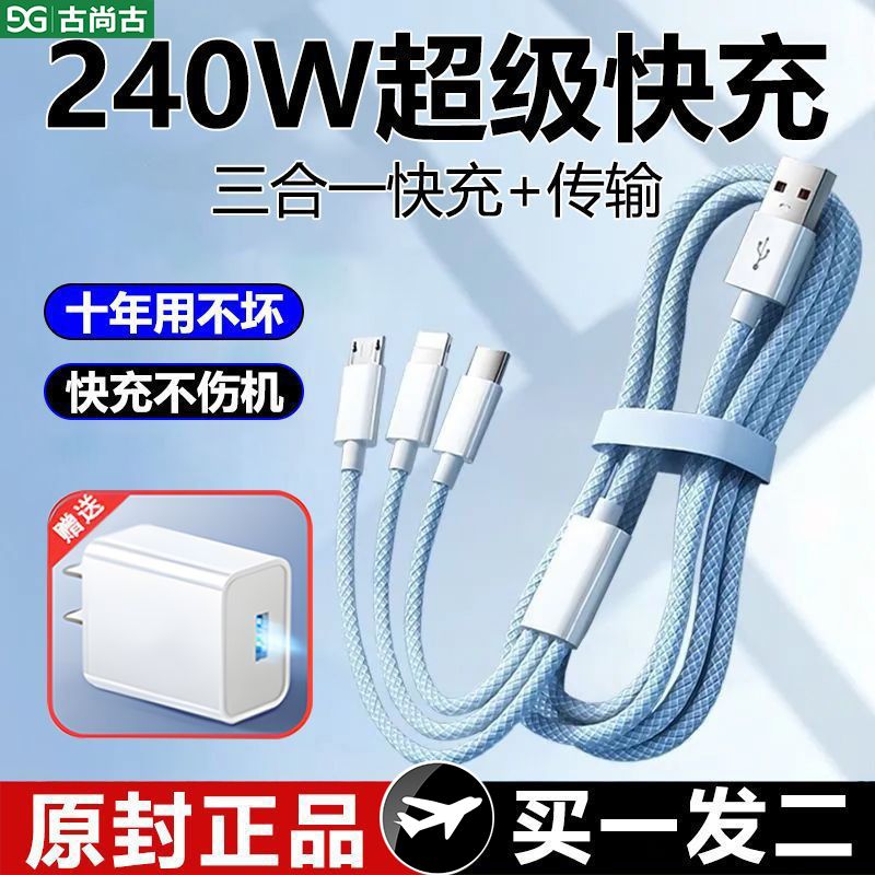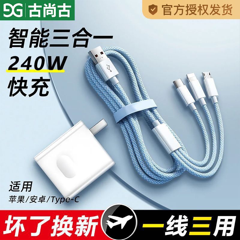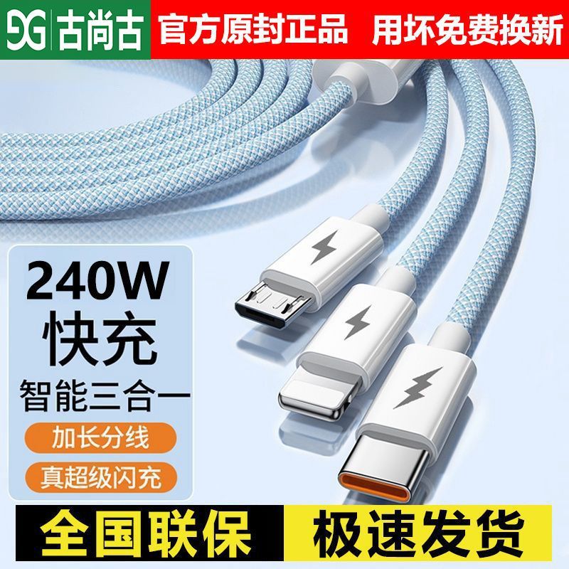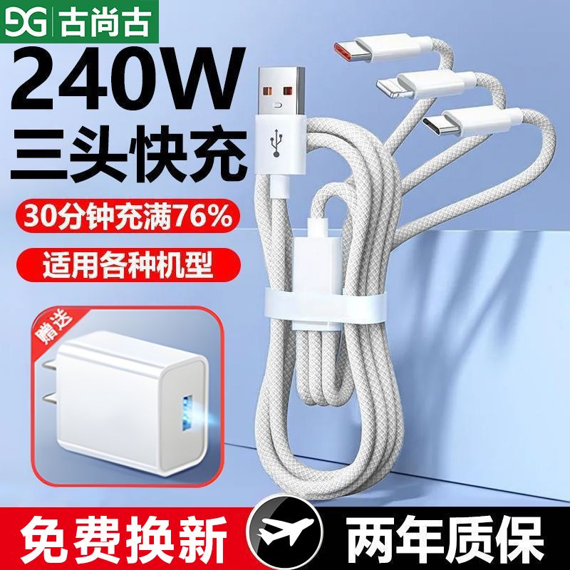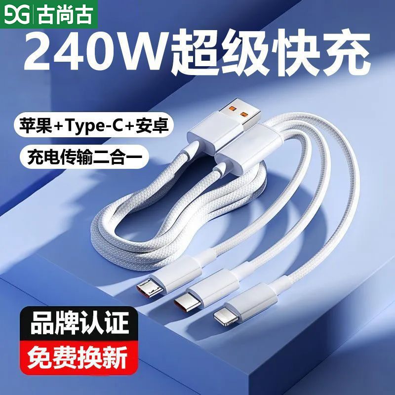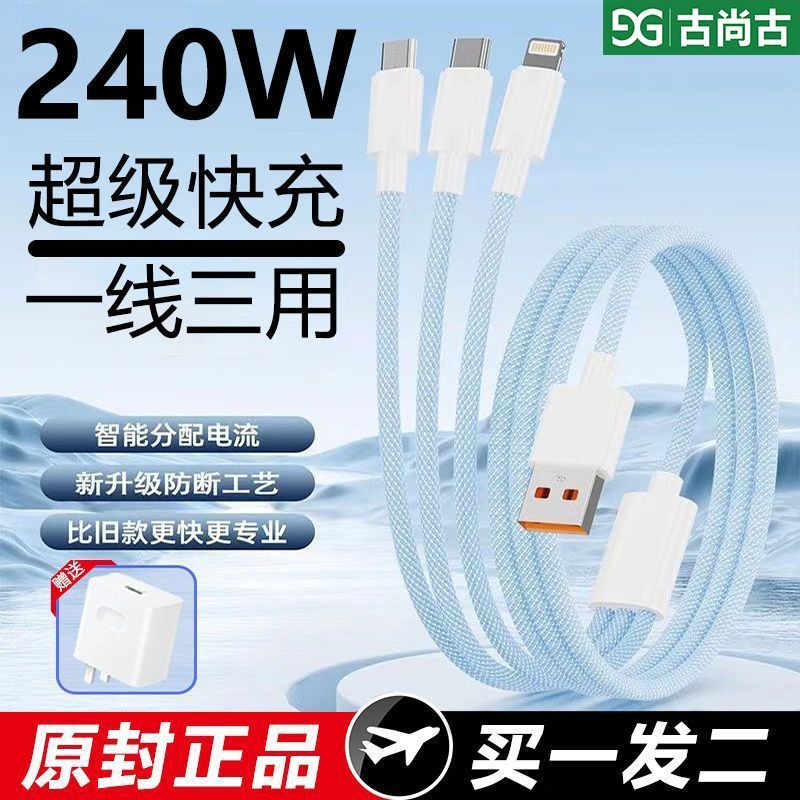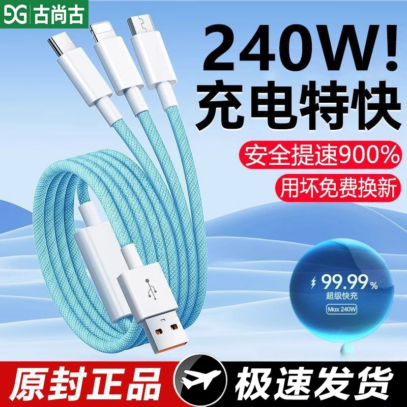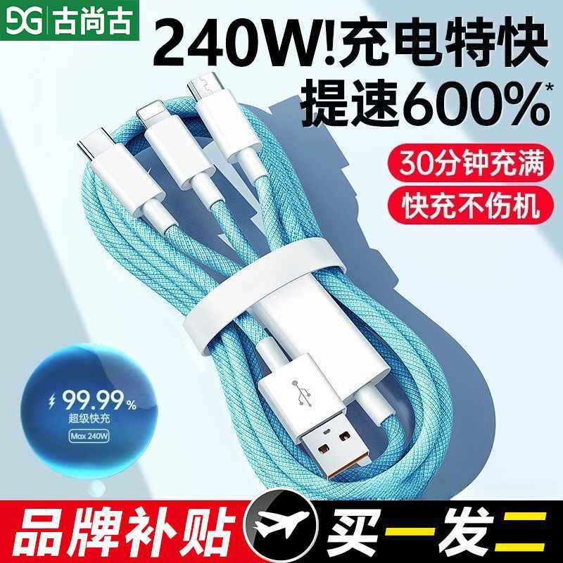 古尚古【赠快充头】240W超级快充一拖三编织数据线适用华为三合一