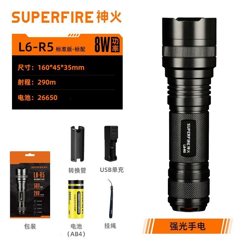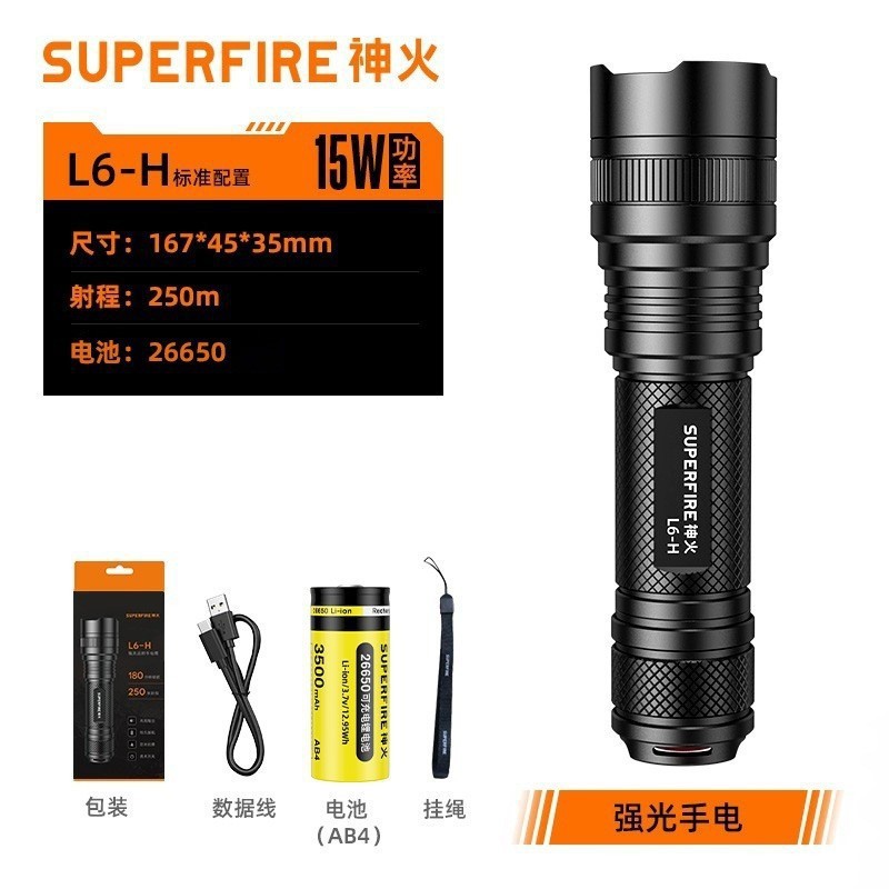 神火手电筒强光手握式电筒充电家用露营宾馆工作长续航爆亮手电L6