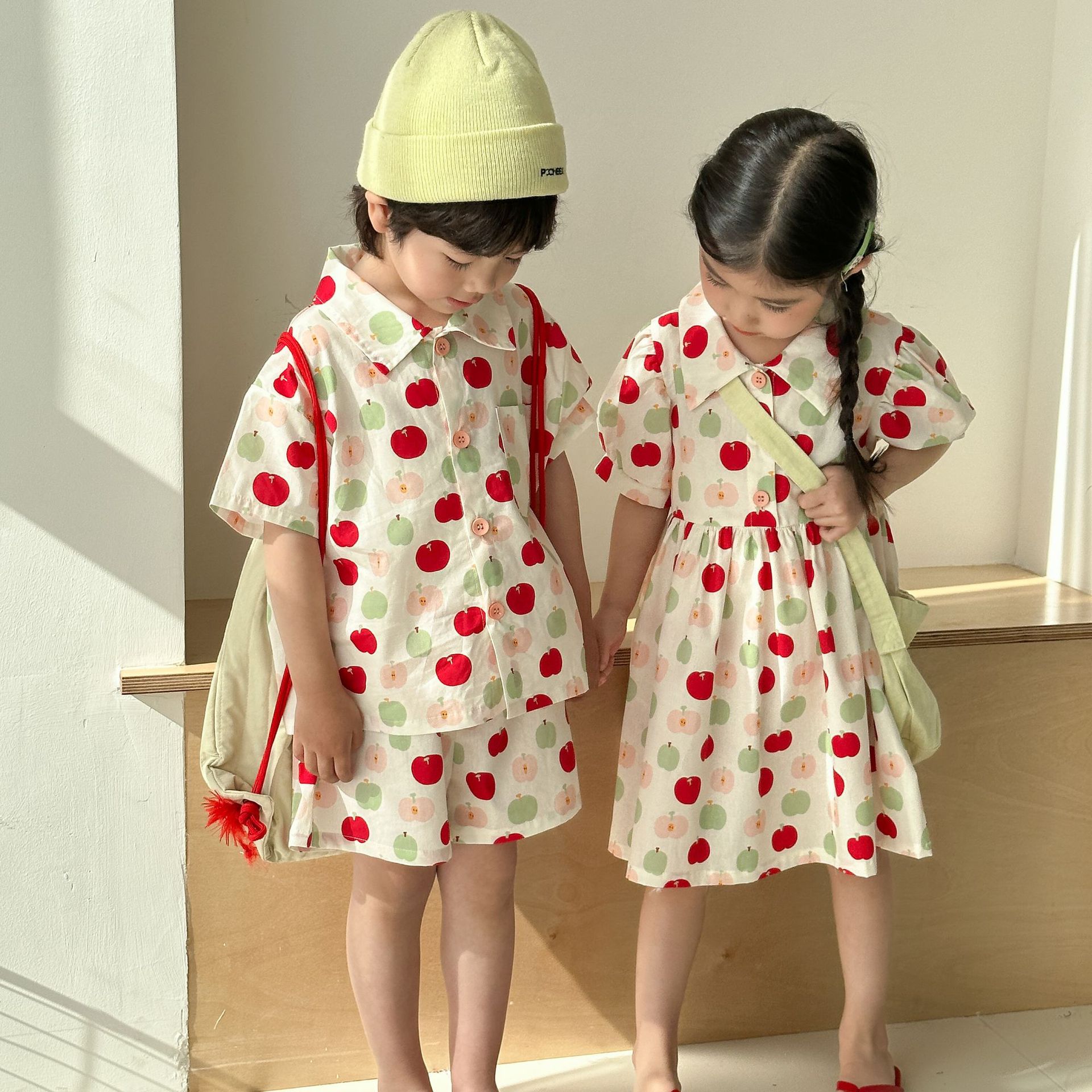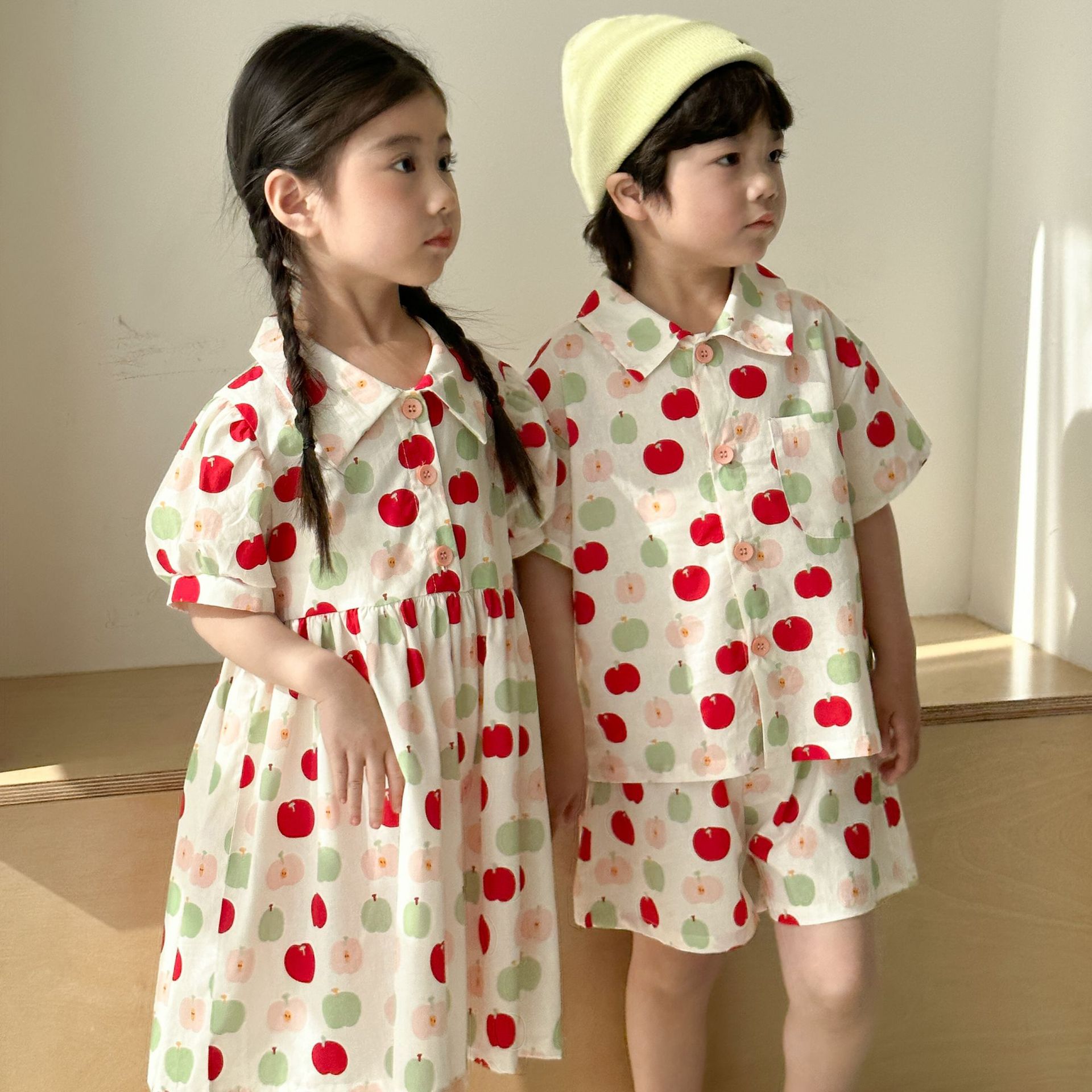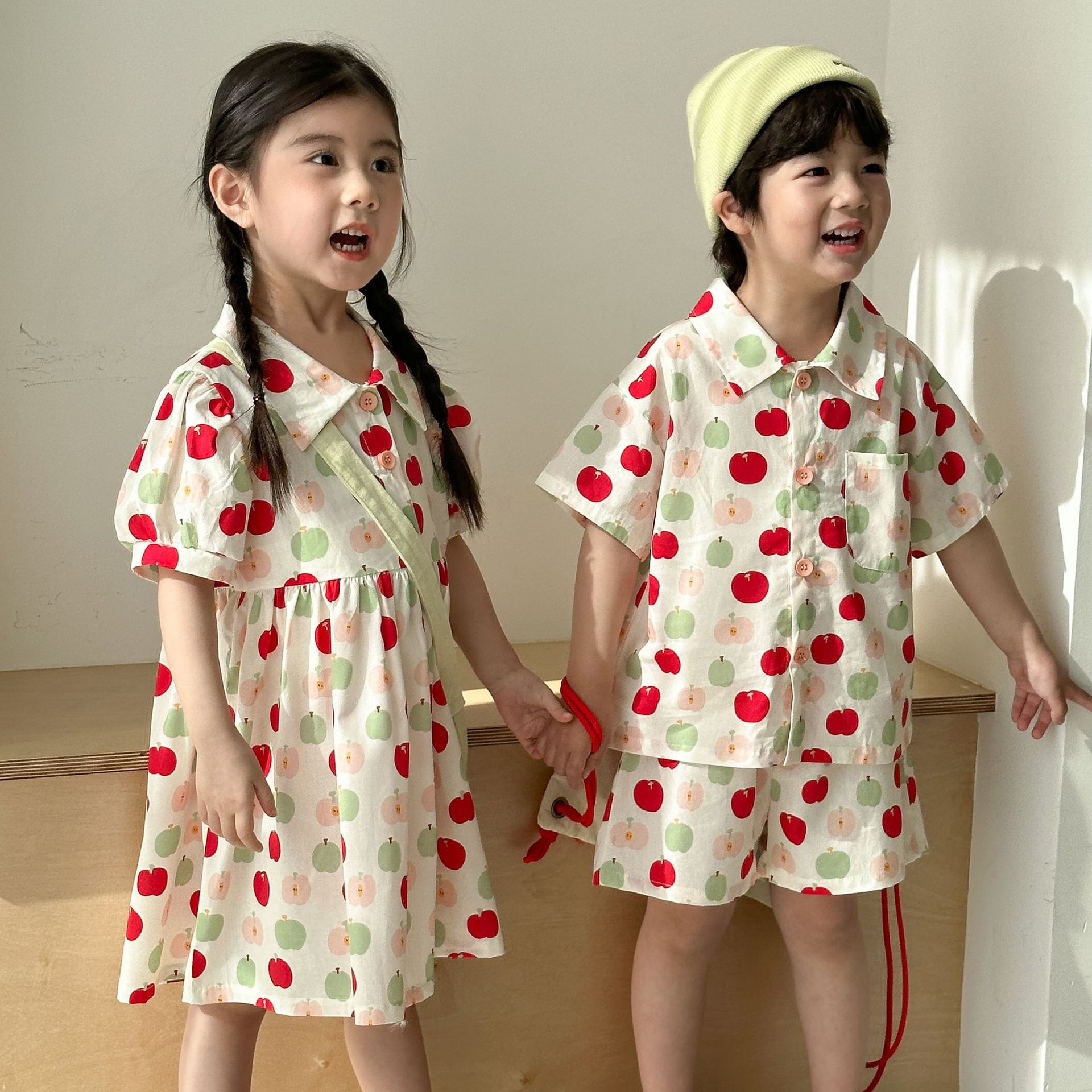 儿童夏季衬衫套装洋气纯棉男童2025新款宝宝女童短袖连衣裙兄妹装