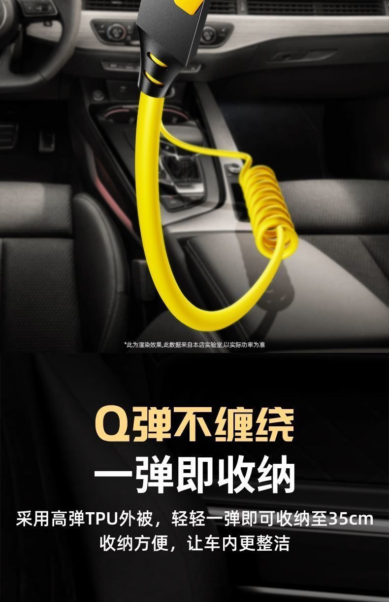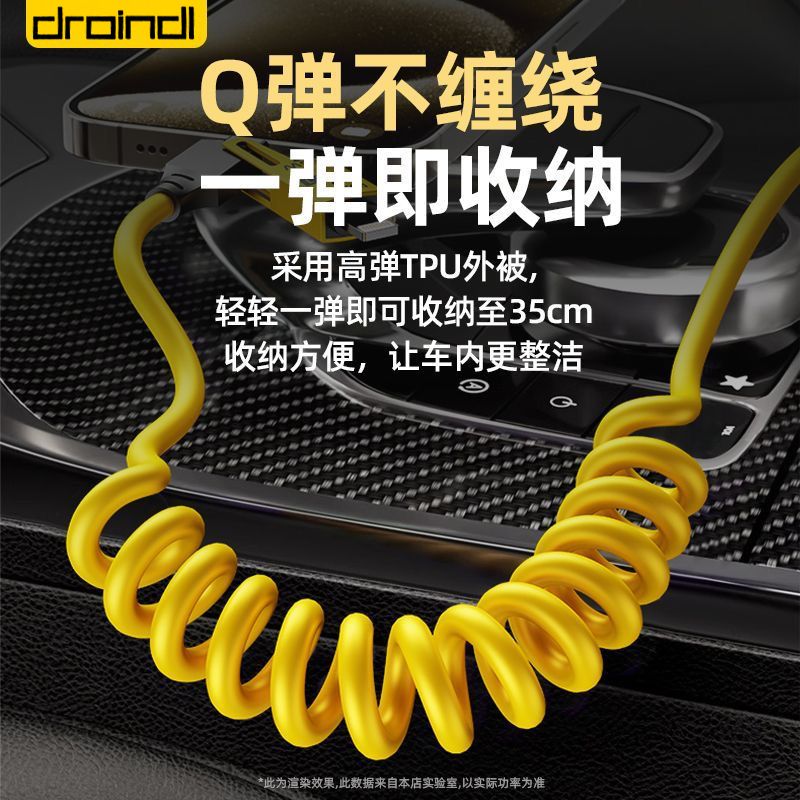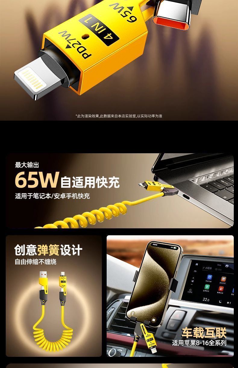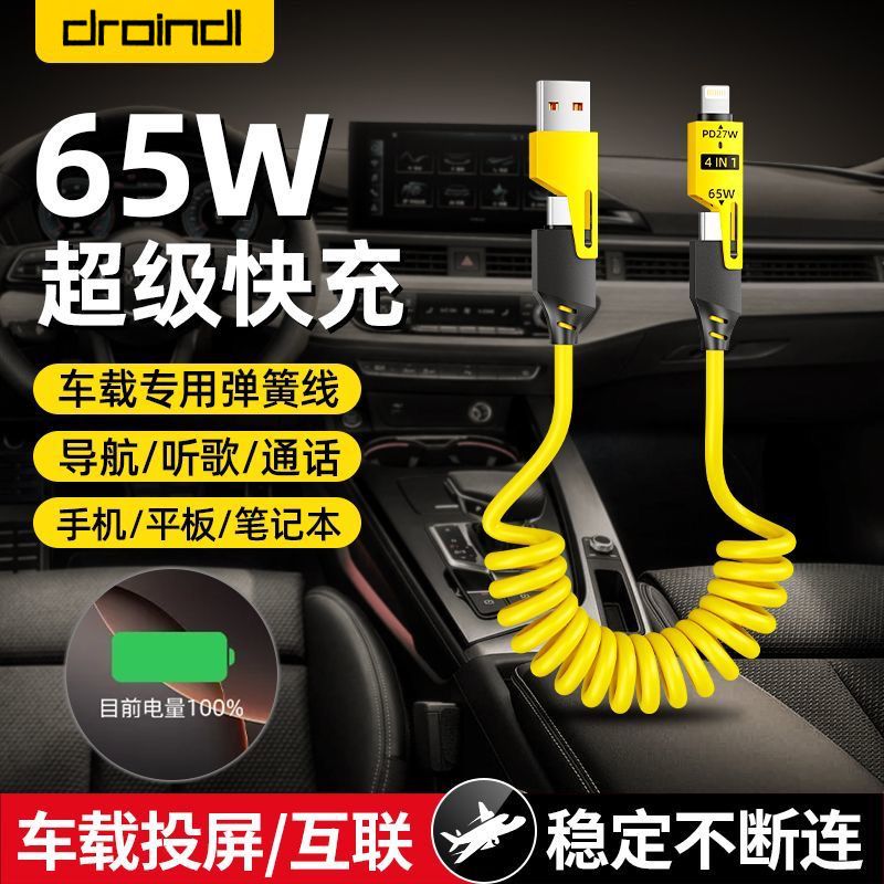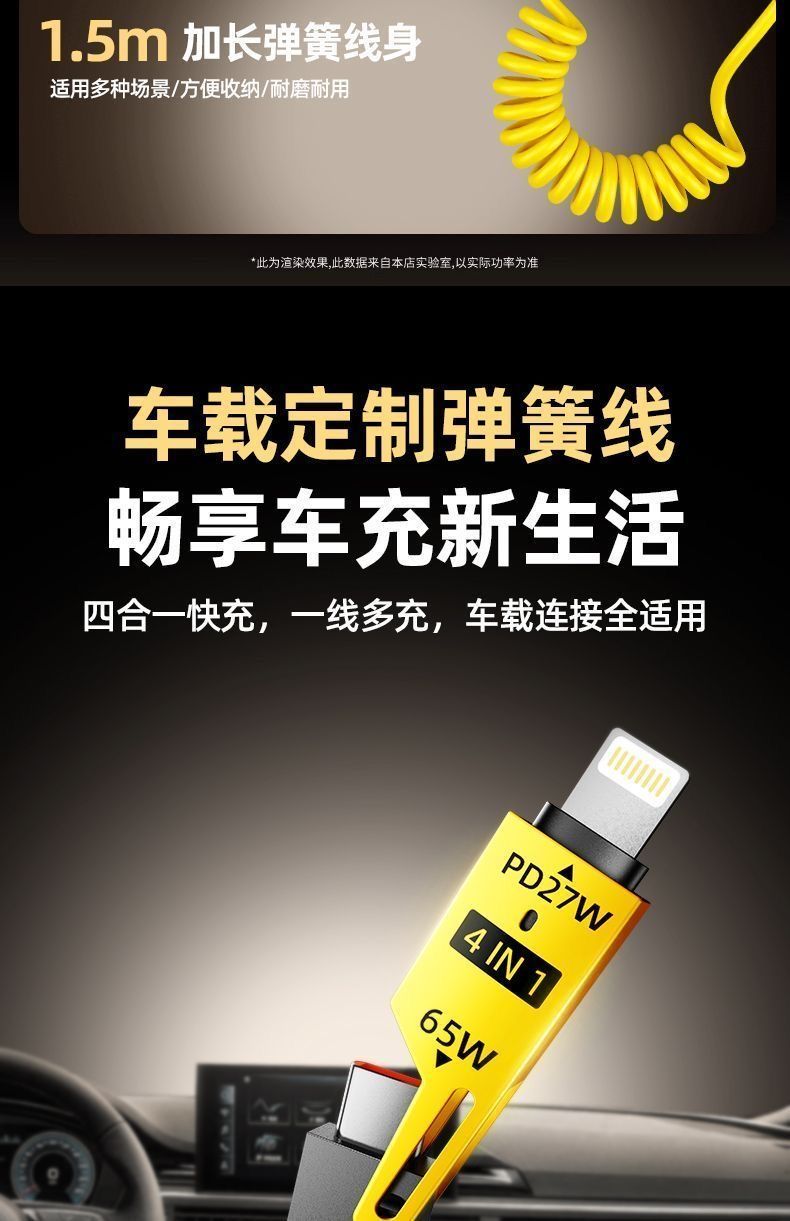 65W车载弹簧四合一超级快充数据线PD27适用苹果华为OPPO小米typec