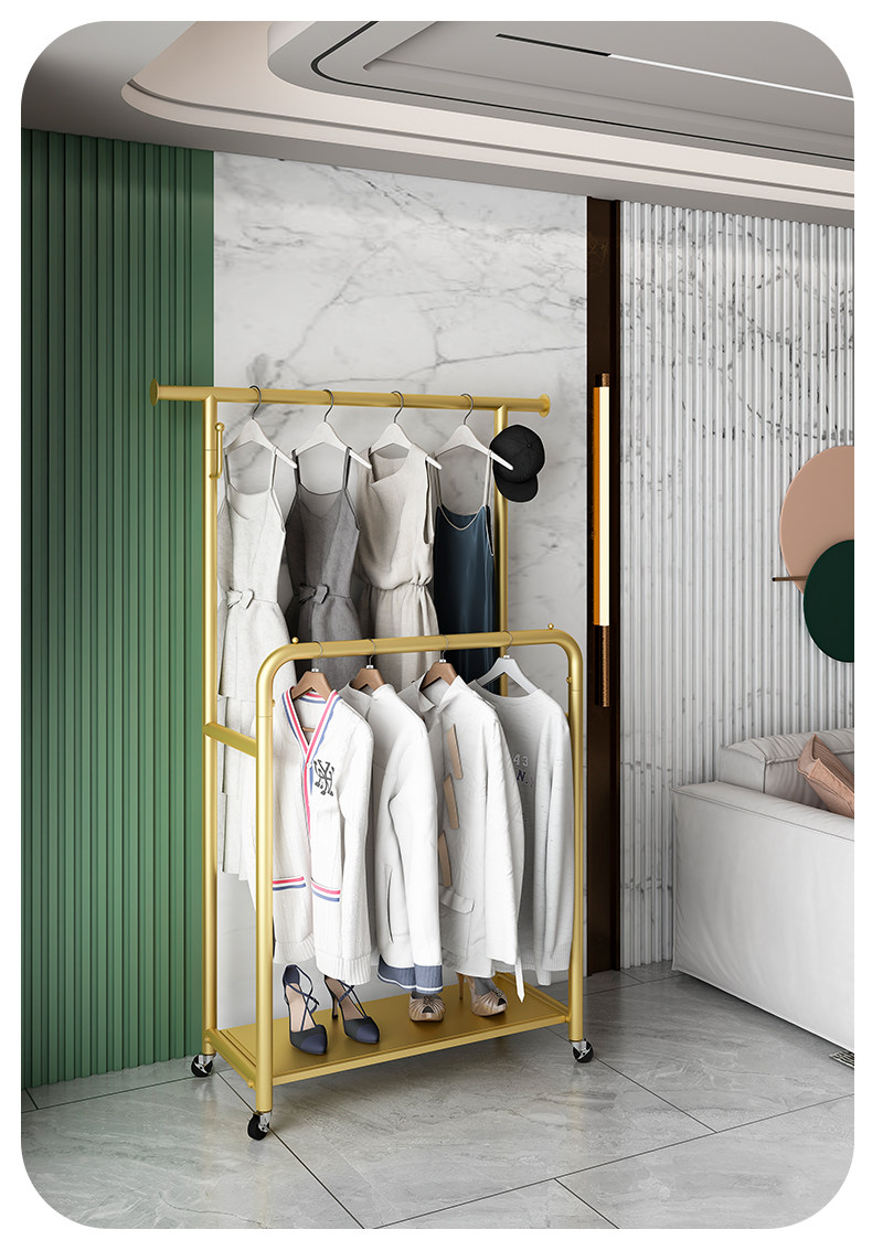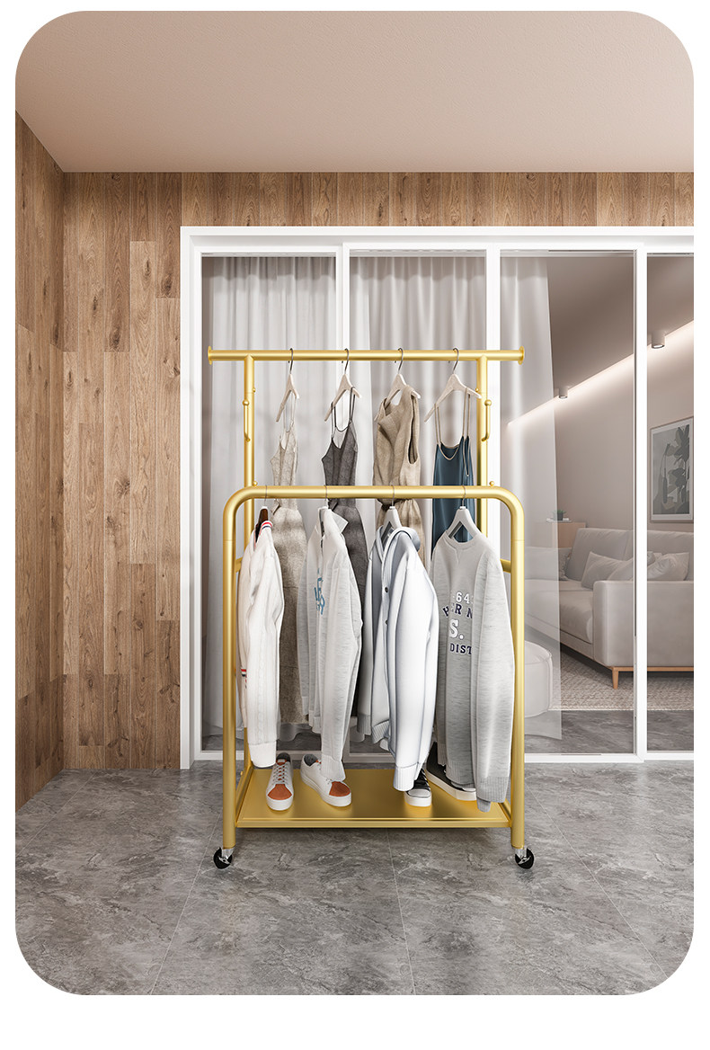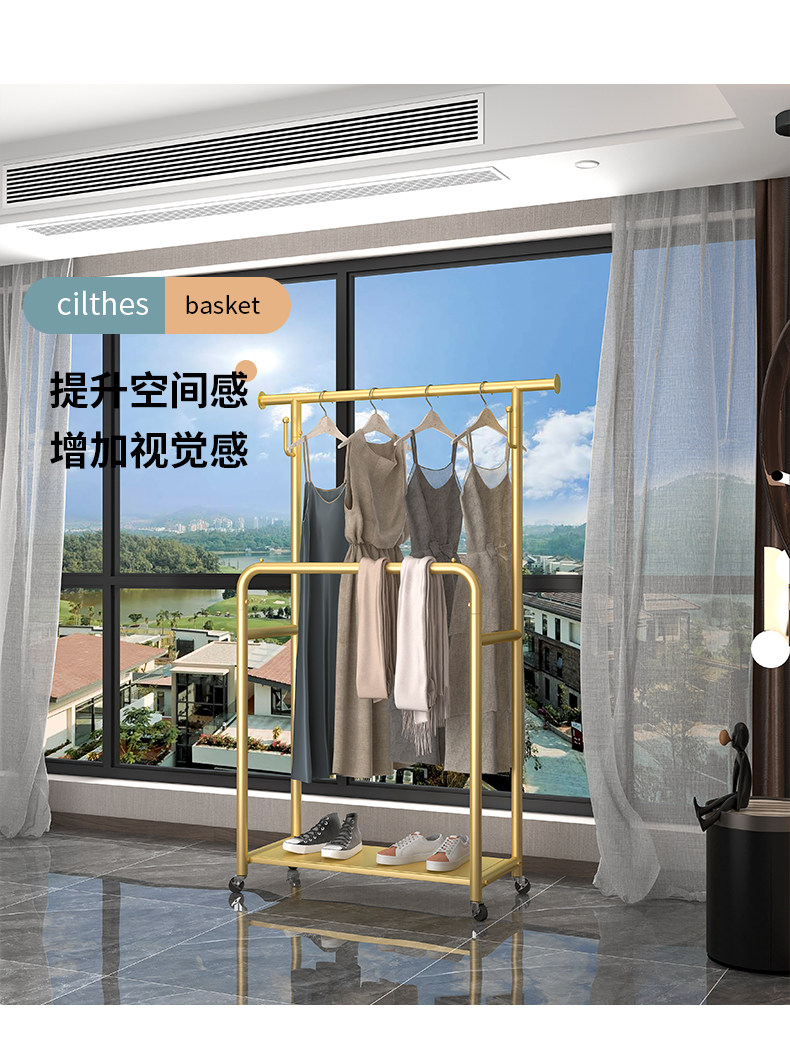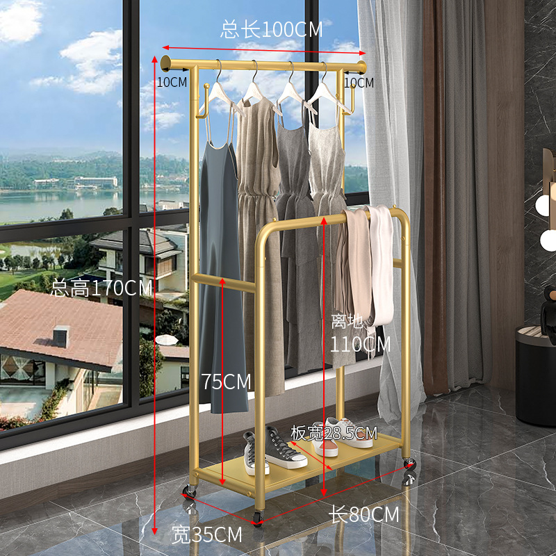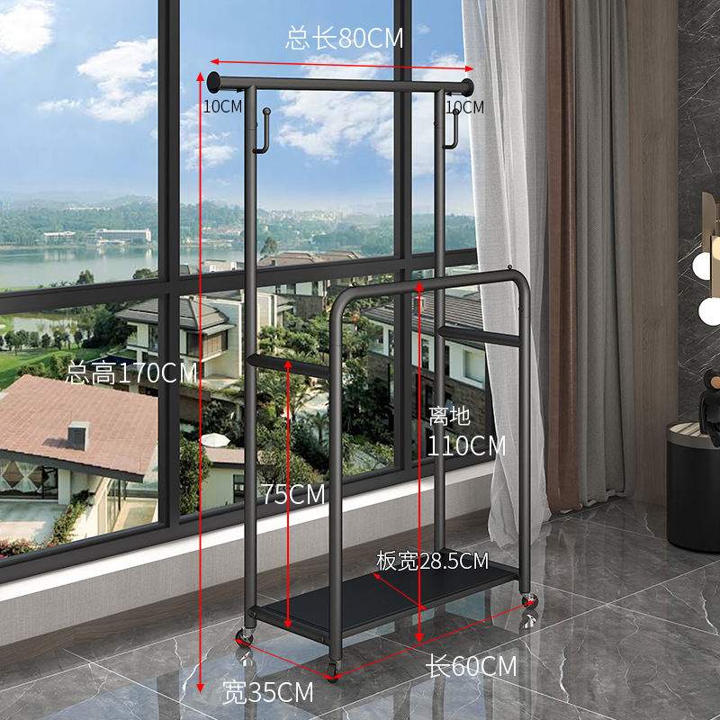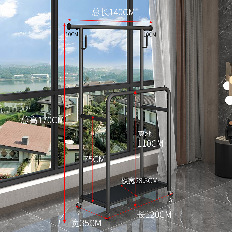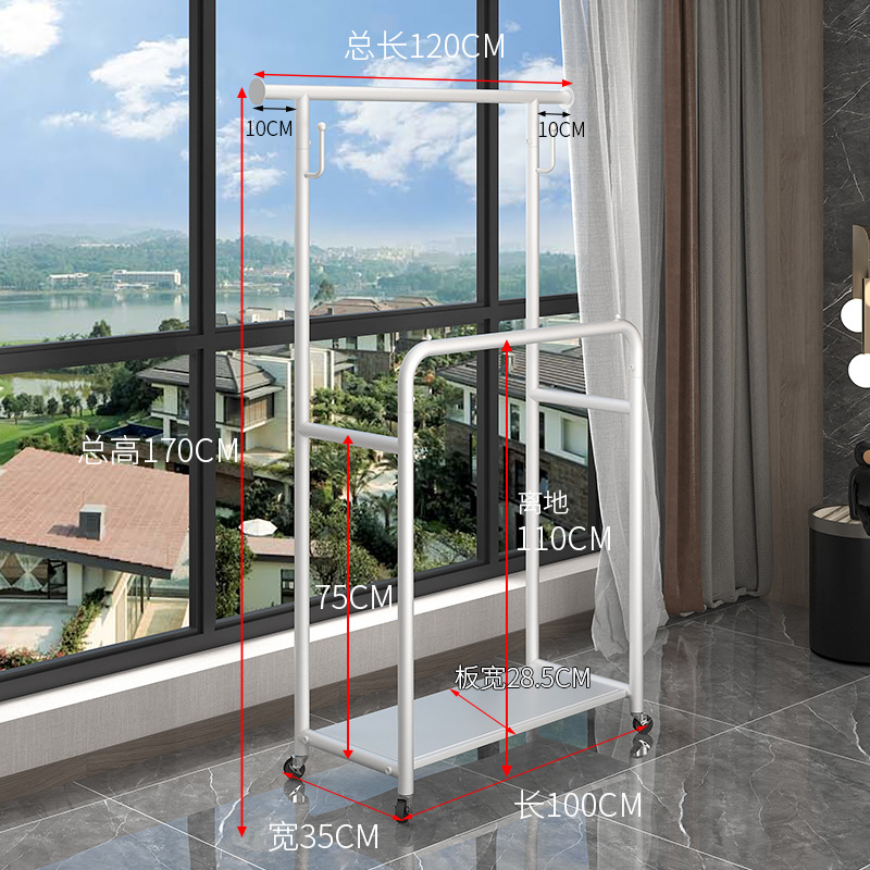北欧双层带板移动晾衣架落地式卧室衣帽架家用阳台鞋包挂衣架带轮