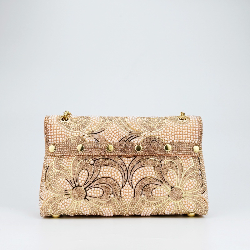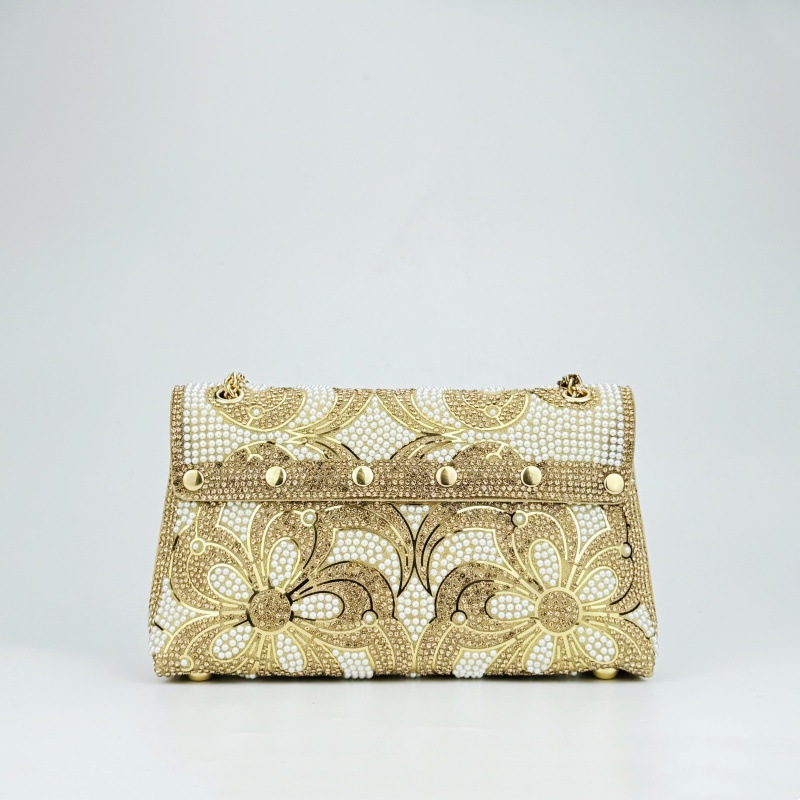 2024跨境新欧美复古晚礼服名媛珍珠闪亮太阳花腋下手拿包链条旗袍