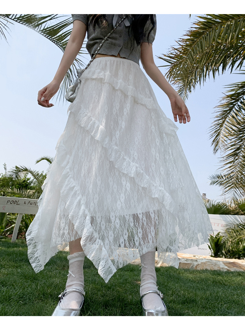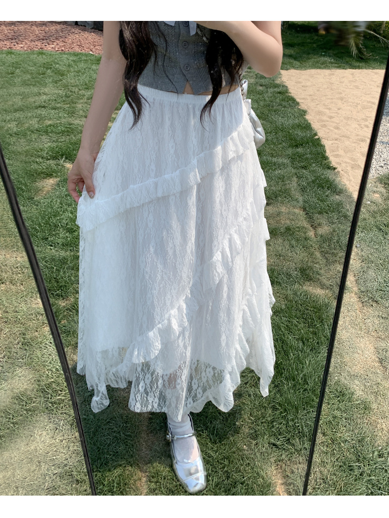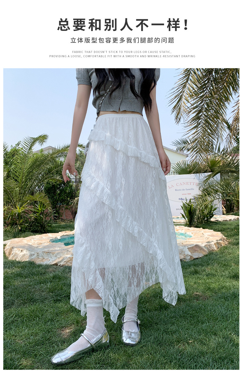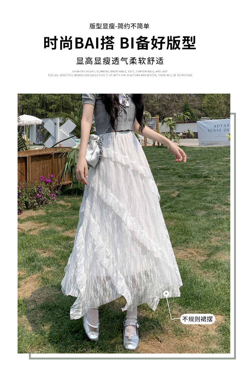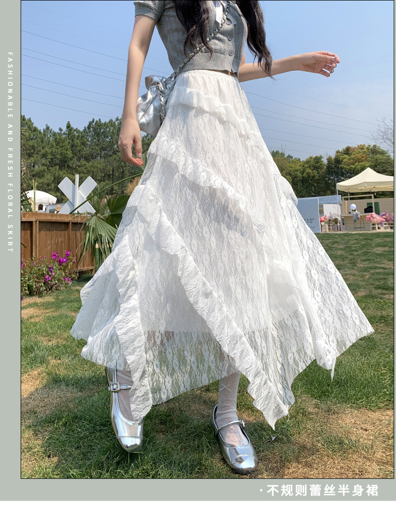白色拼接复古蕾丝不规则半身裙女夏季新款设计感网纱A字蛋糕长裙