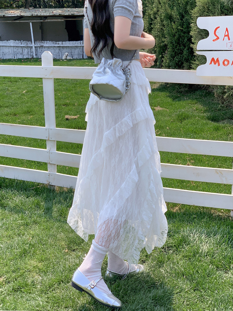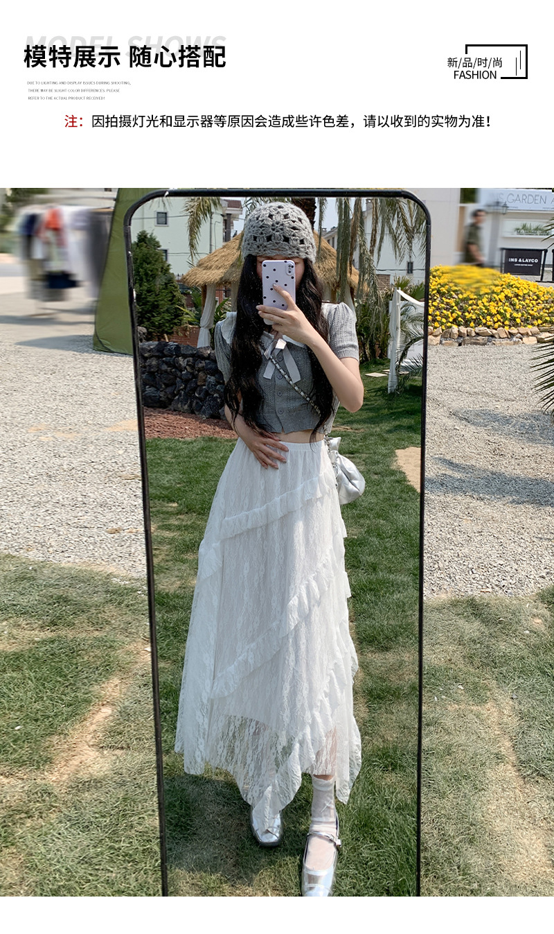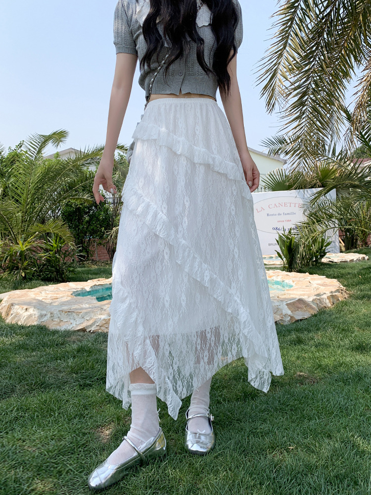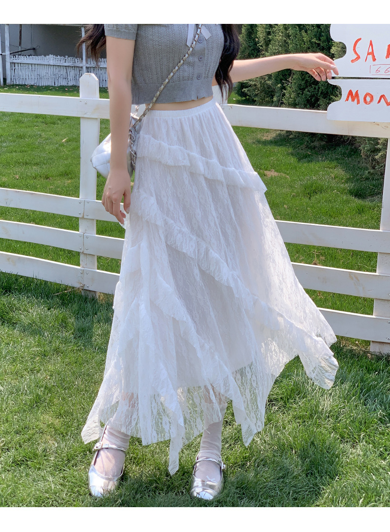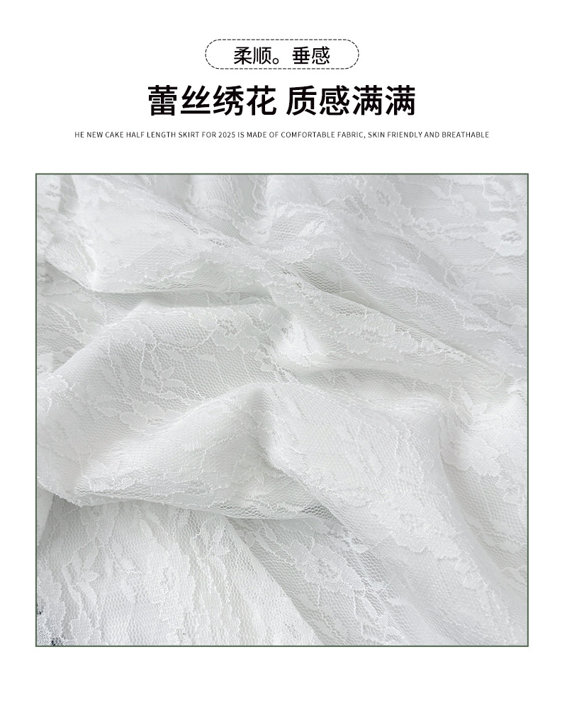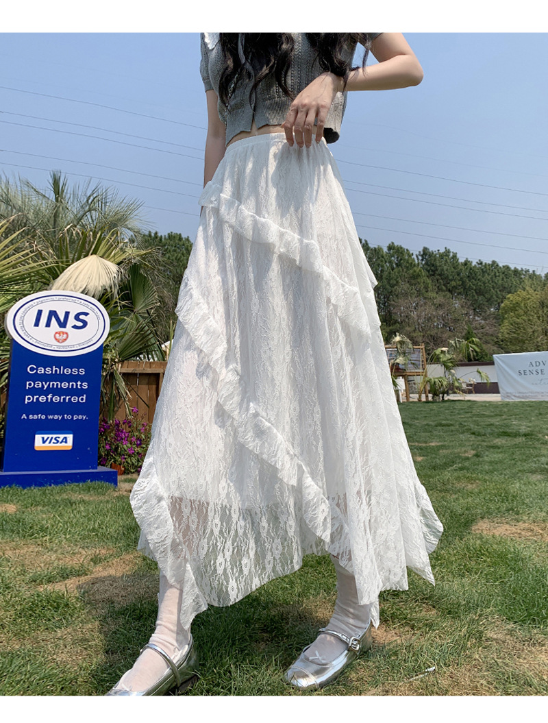 白色拼接复古蕾丝不规则半身裙女夏季新款设计感网纱A字蛋糕长裙