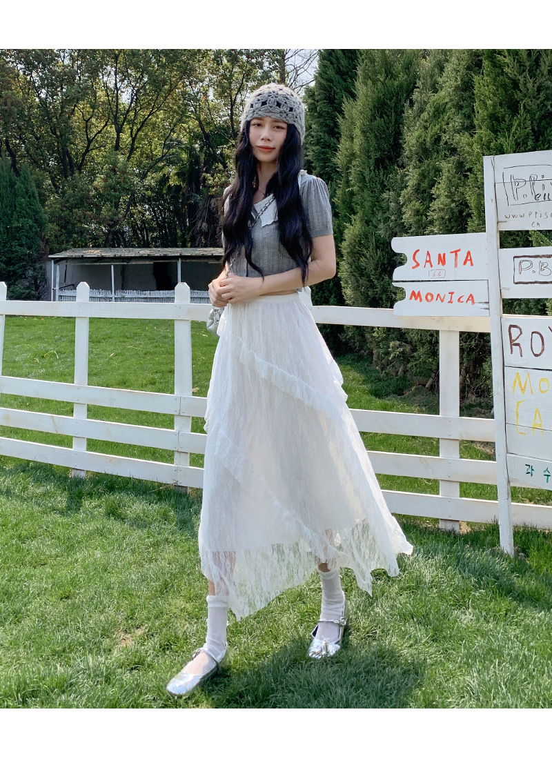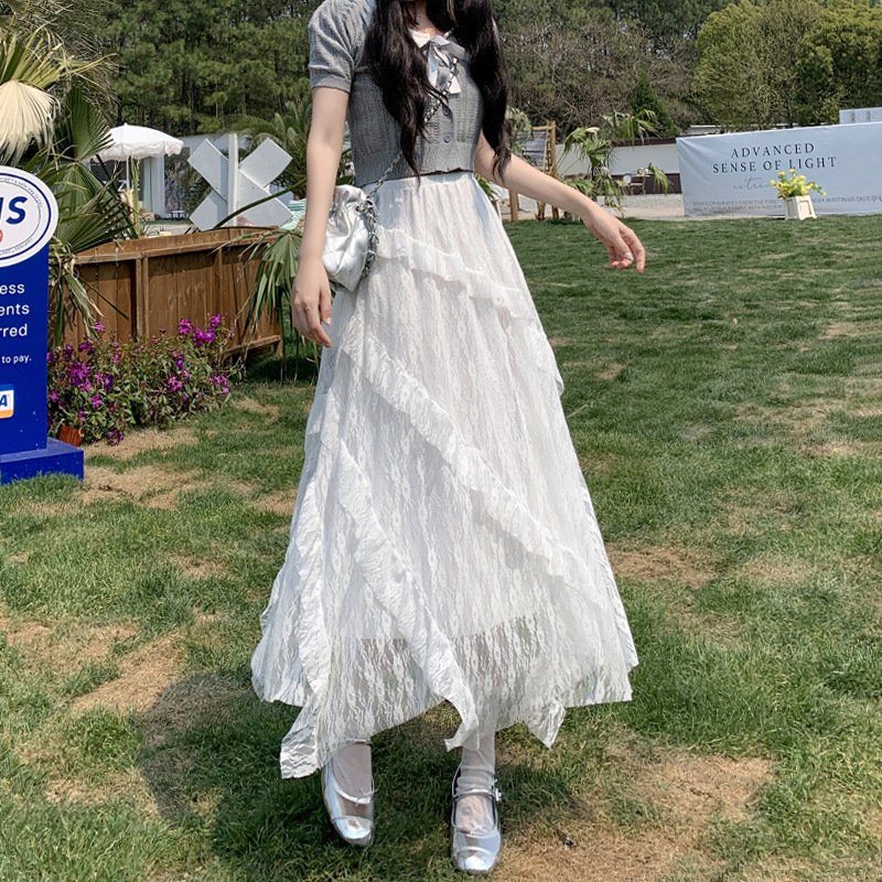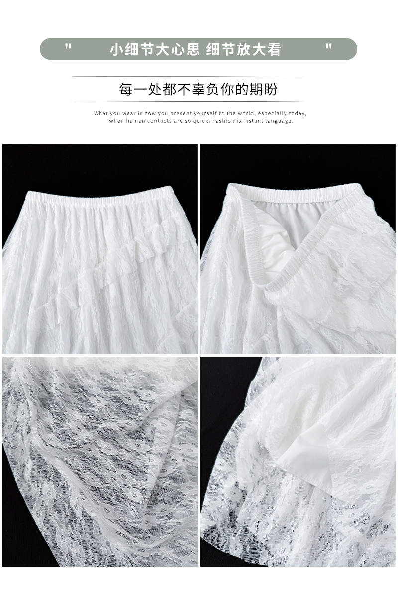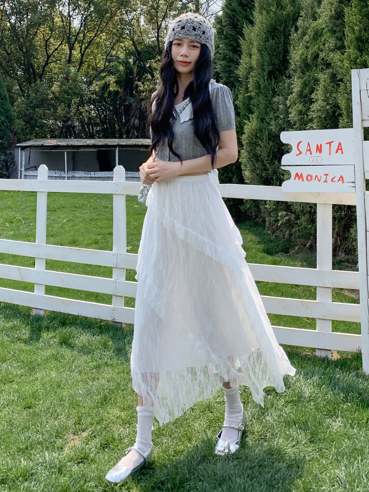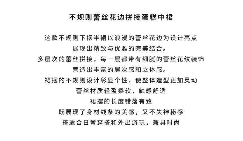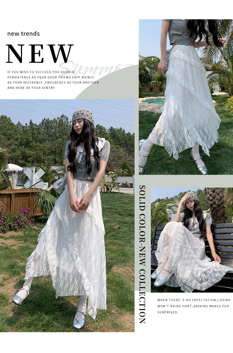 白色拼接复古蕾丝不规则半身裙女夏季新款设计感网纱A字蛋糕长裙