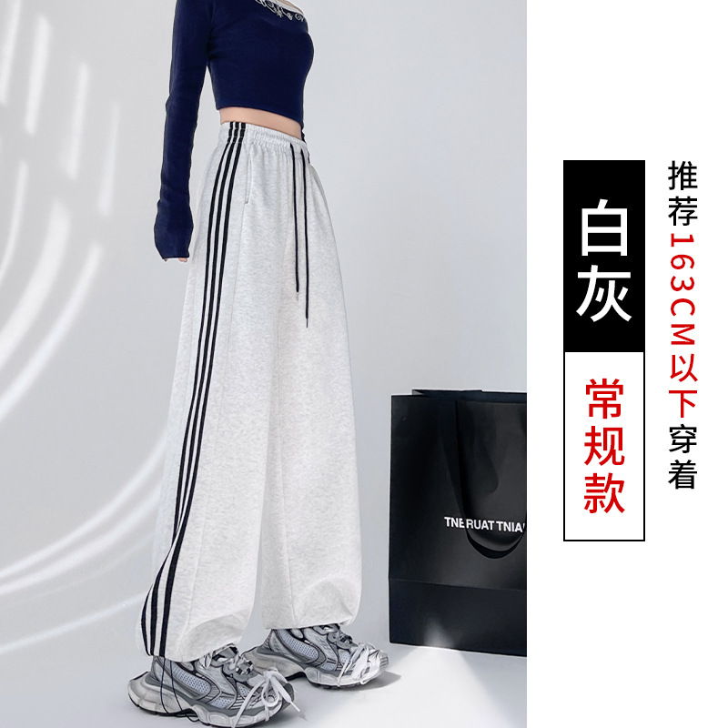 美式高腰侧三杠卫裤春秋女宽松直筒休闲阔腿裤两穿束脚条纹运动裤