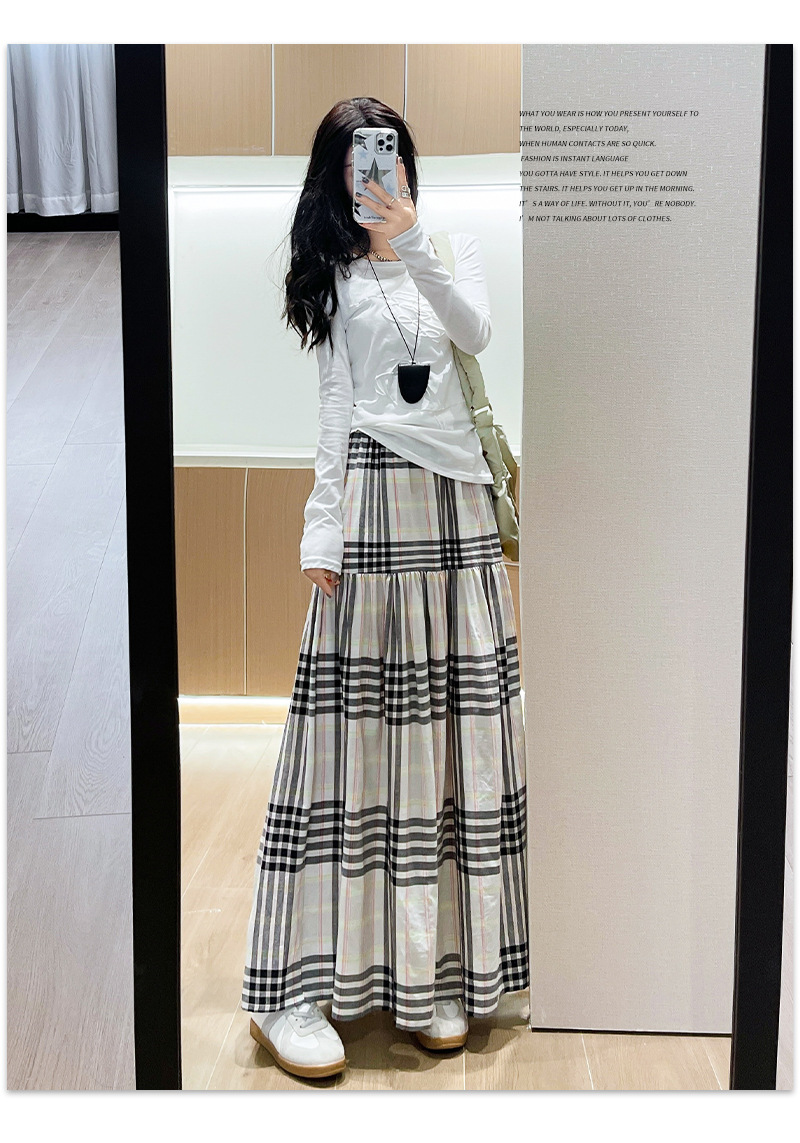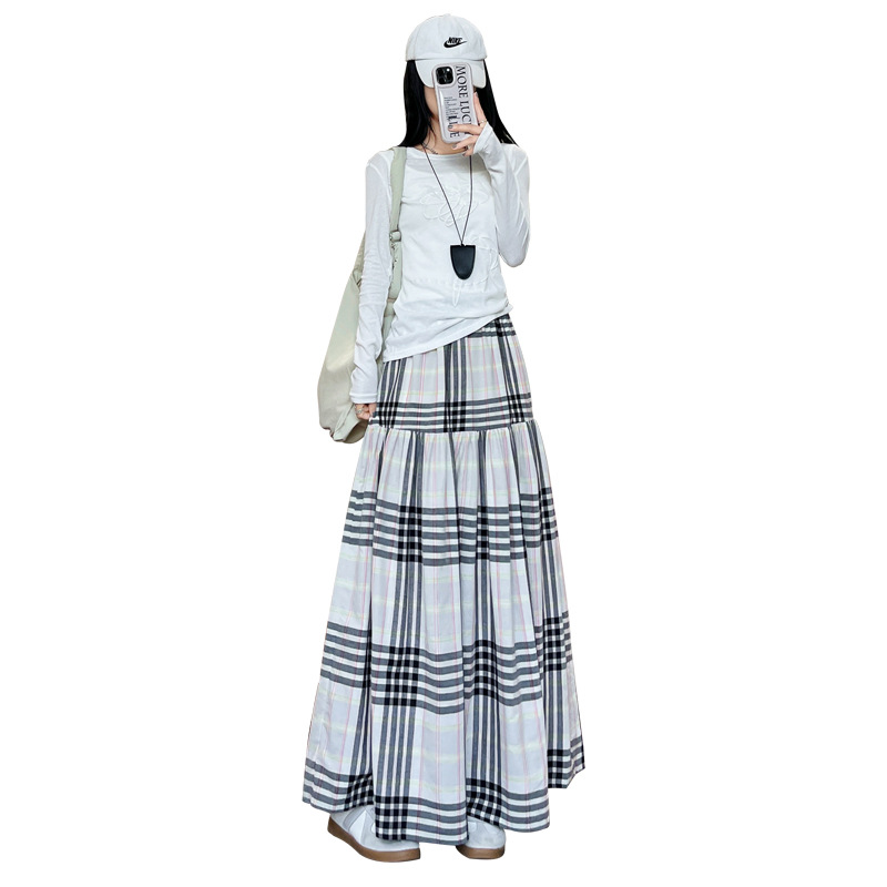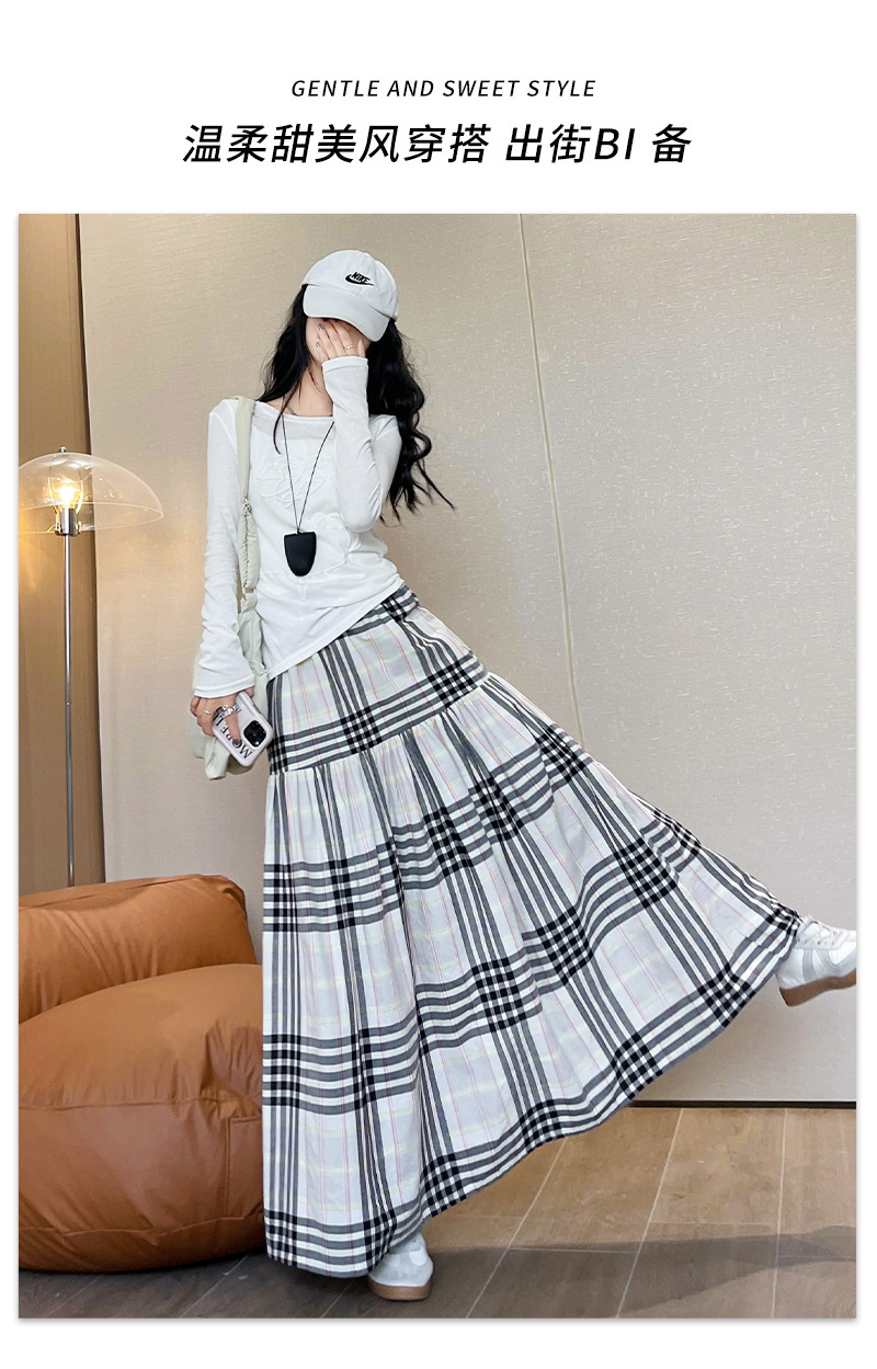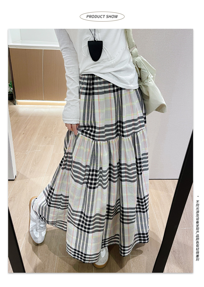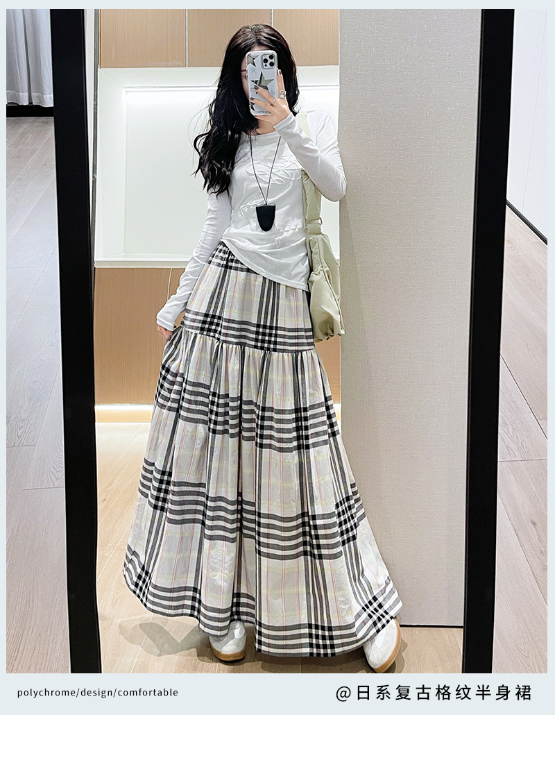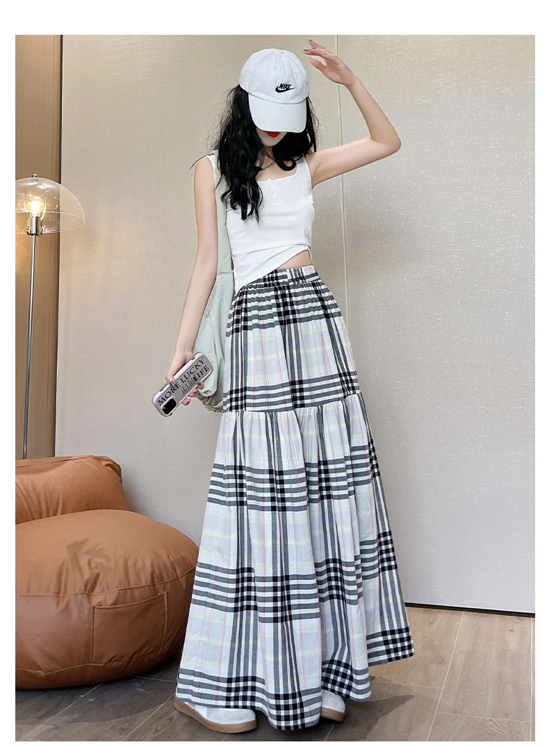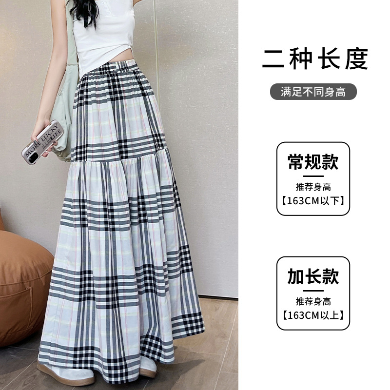 马德拉斯格纹宽摆长裙子女夏季高腰大裙摆A字遮肉文艺复古半身裙