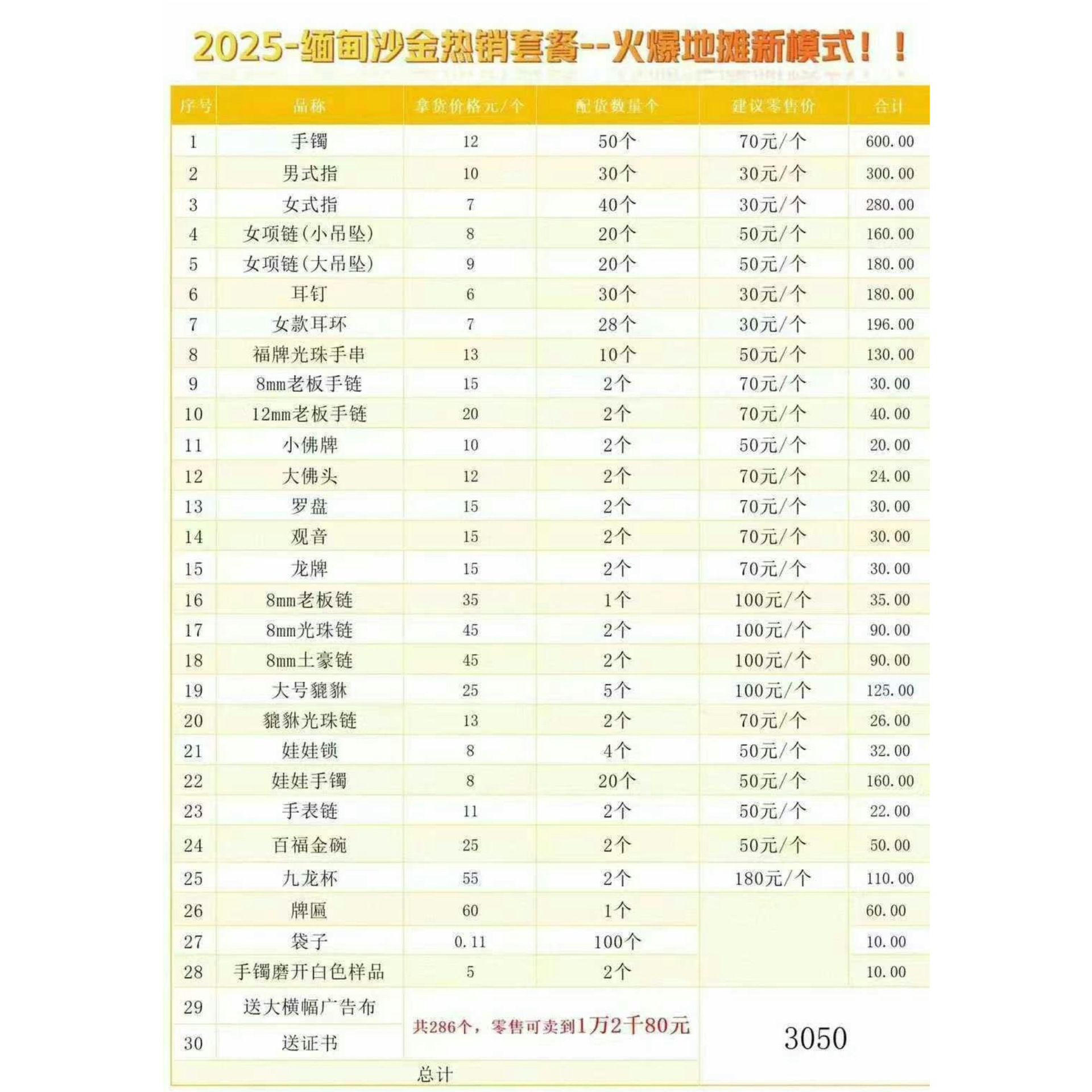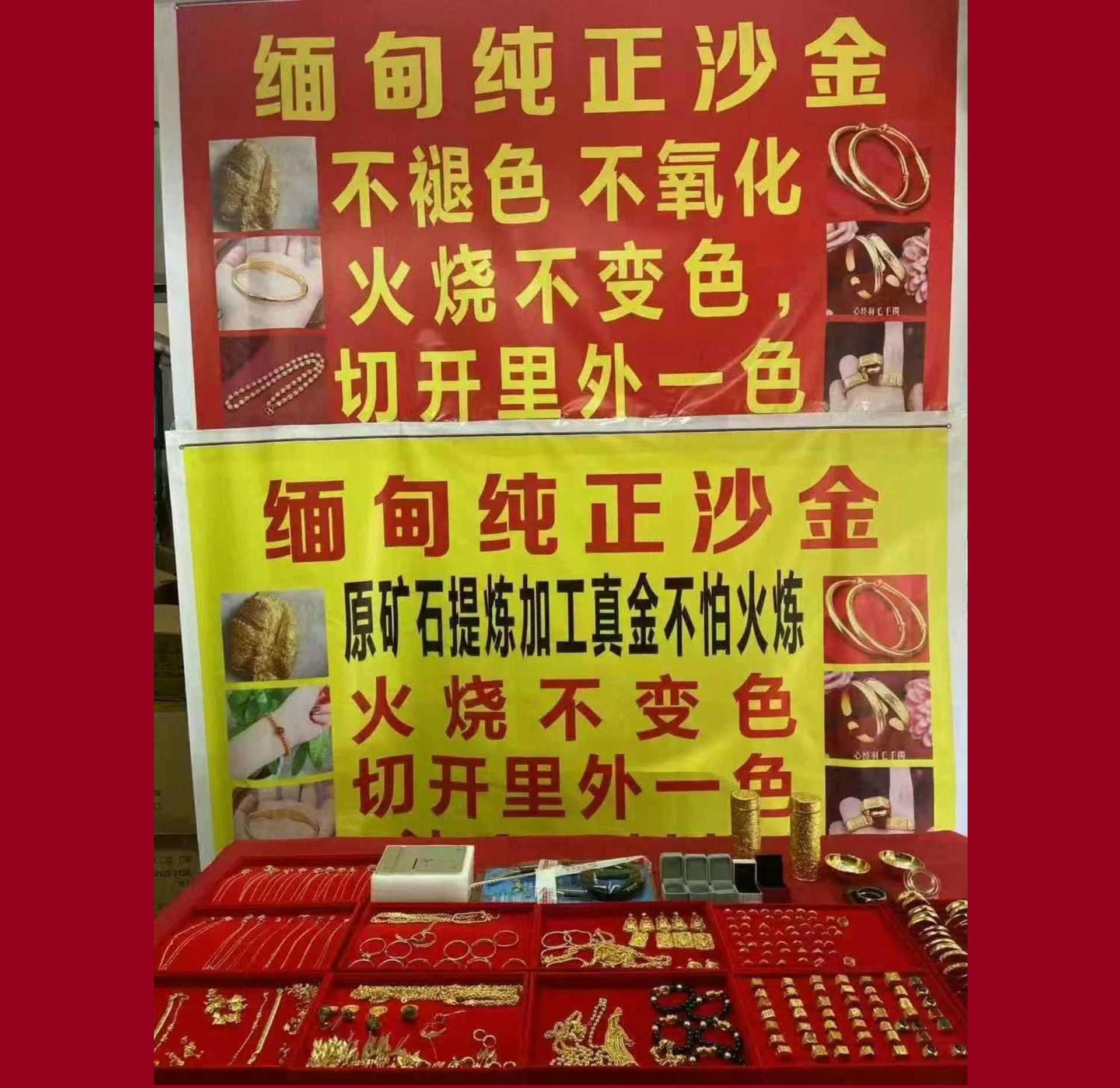 沙金上市了,有戒子手镯项链手链耳环耳钉,九龙杯,百福碗。缅甸沙金不掉色,不痒化,切开里外都是一个颜色,火烧变回原色,很受青眯,十分畅销,是一款真正利润丰厚的一款地摊产品。拿货286个,3160元,可卖到18380元,试地菜市场一个早上就可卖到3千多元,机会不可错过。下单送广告横幅。