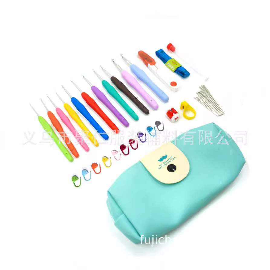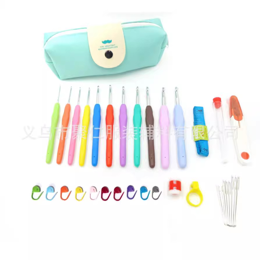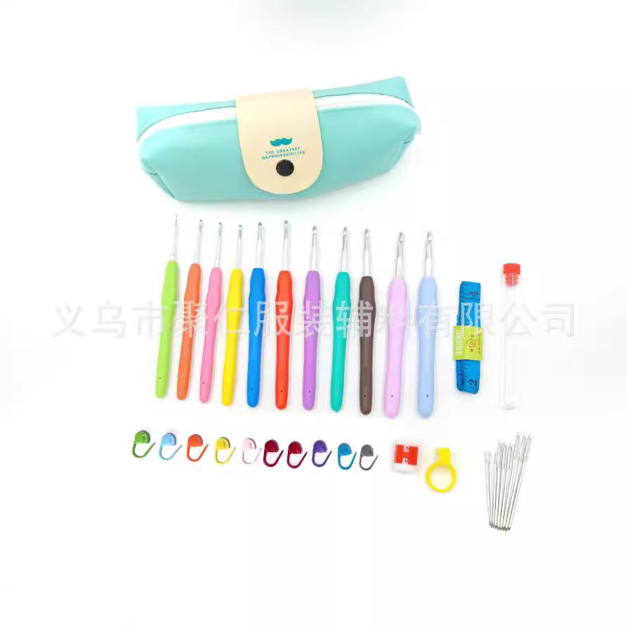 毛线编织工具11支彩虹钩针套装 彩色TPR软柄铝钩针毛线勾针包30PC