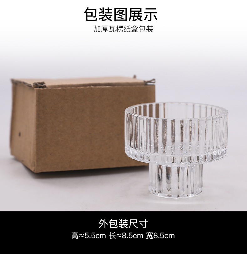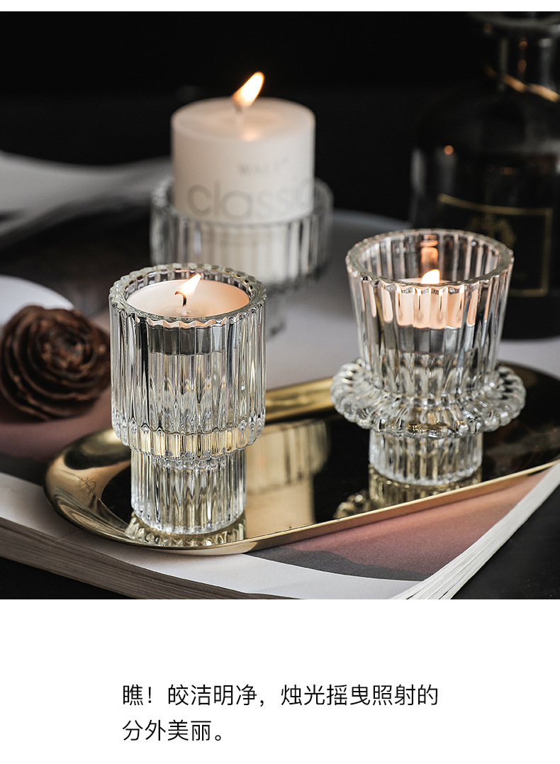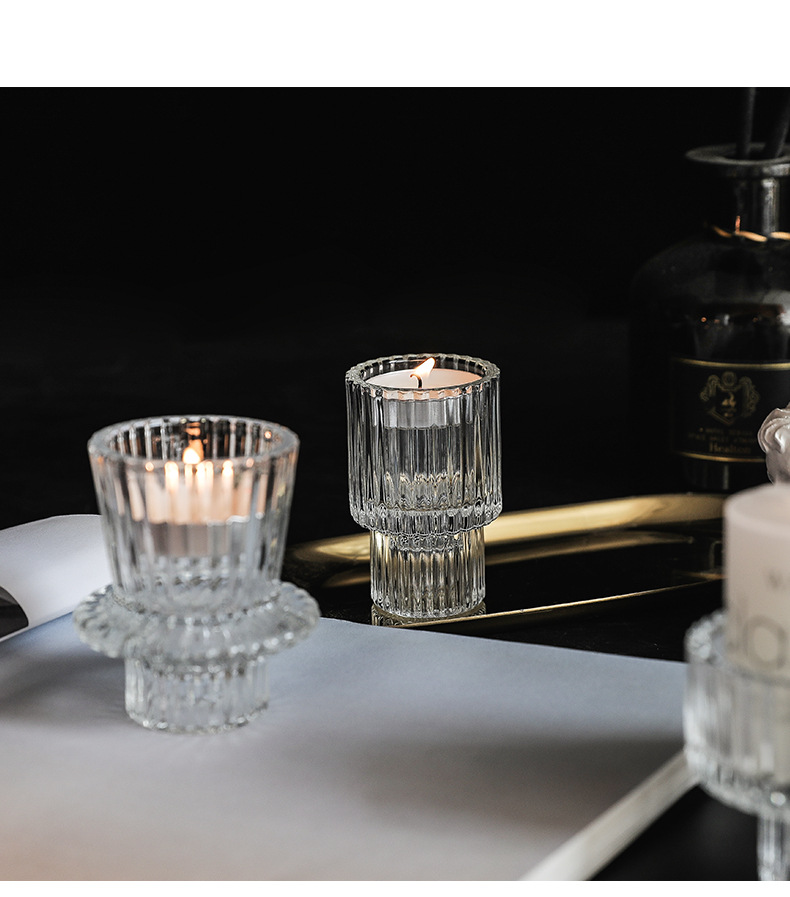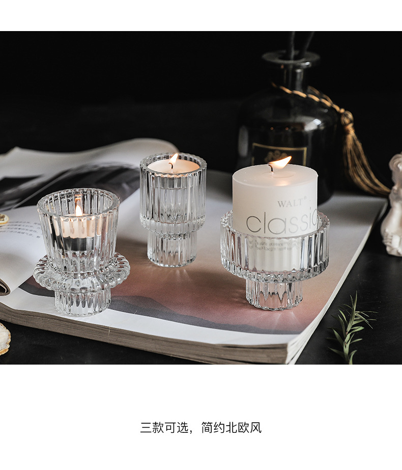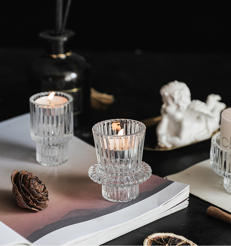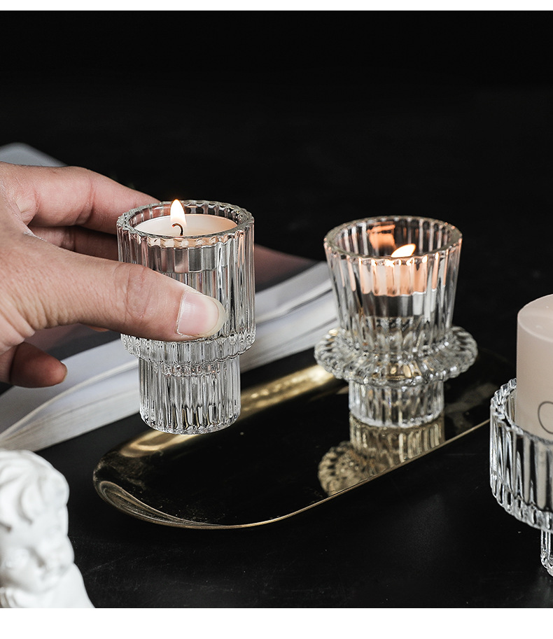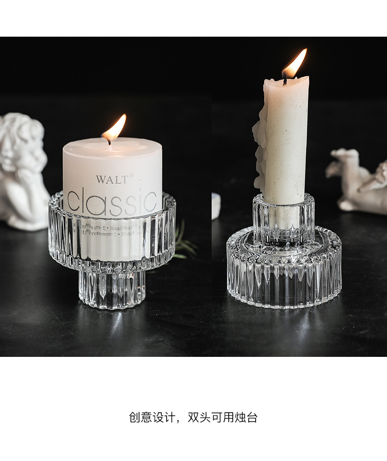 北欧竖条纹浮雕复古双头玻璃蜡烛台创意桌面浪漫餐厅桌面装饰摆件