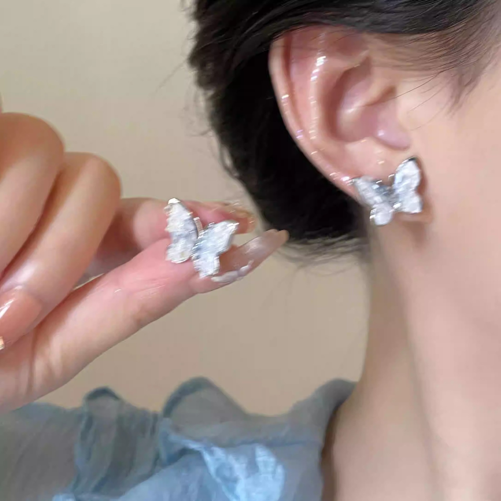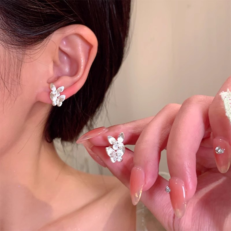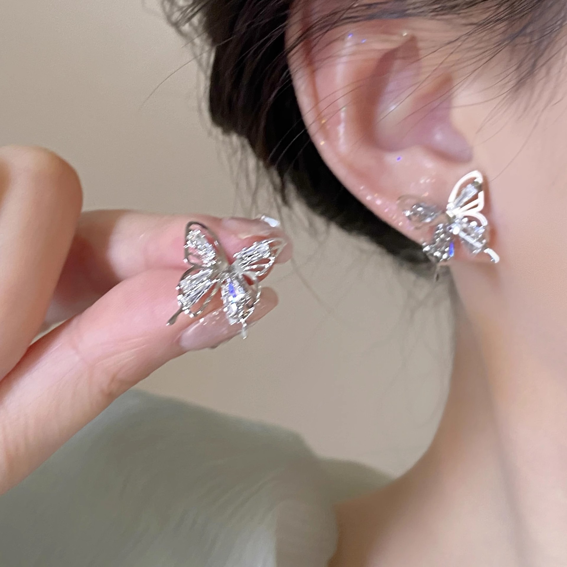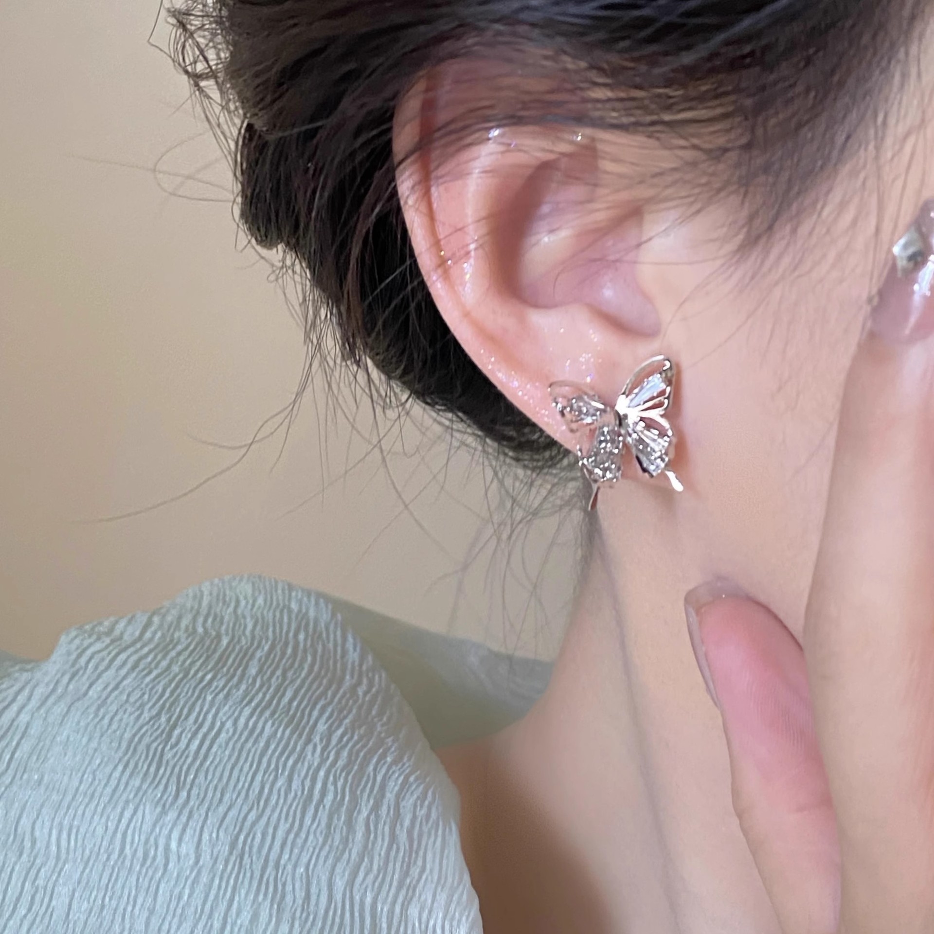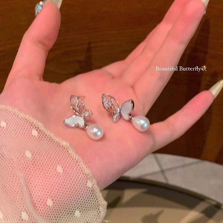925银针蝴蝶锆石珍珠耳钉女时尚感耳环小众独特耳饰品批发