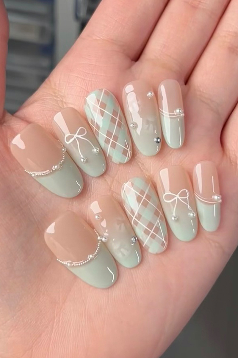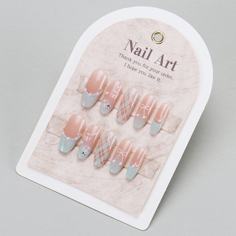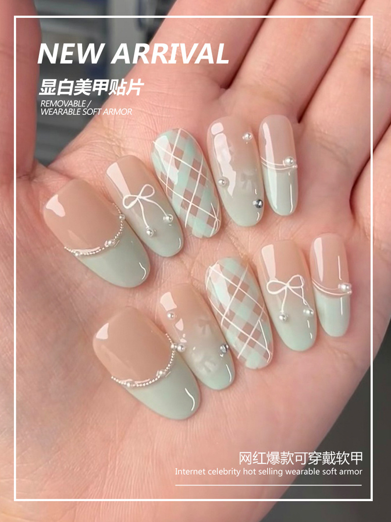 穿戴甲高级感夏季小清新手工美甲甲片法式珠链格纹甜妹假指甲贴片
