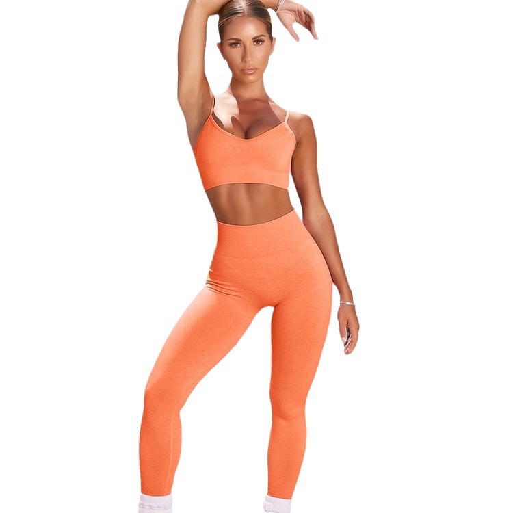 跨境新款无缝速干健身服吊带文胸长裤二件套跑步运动紧身瑜伽套装
