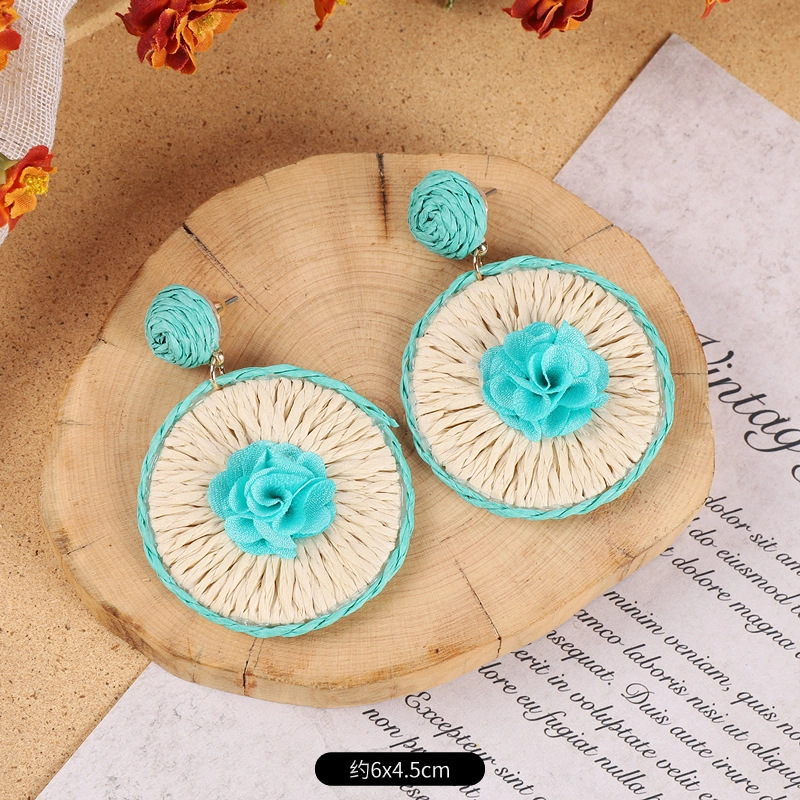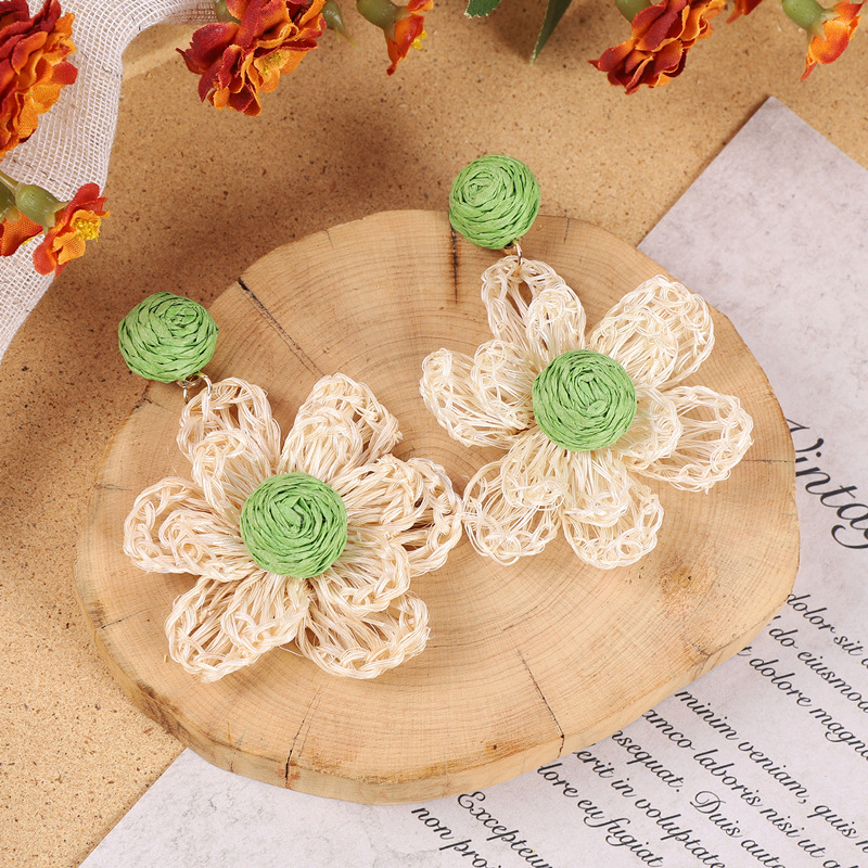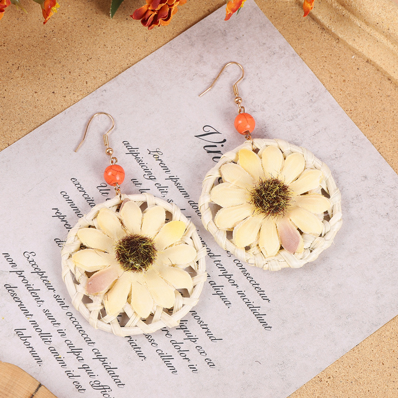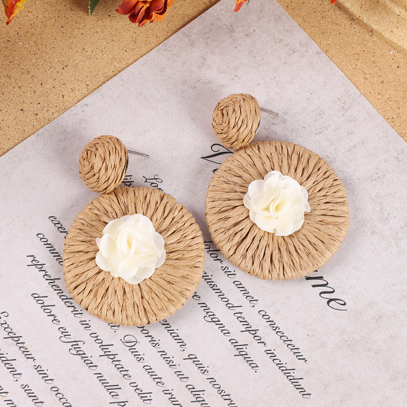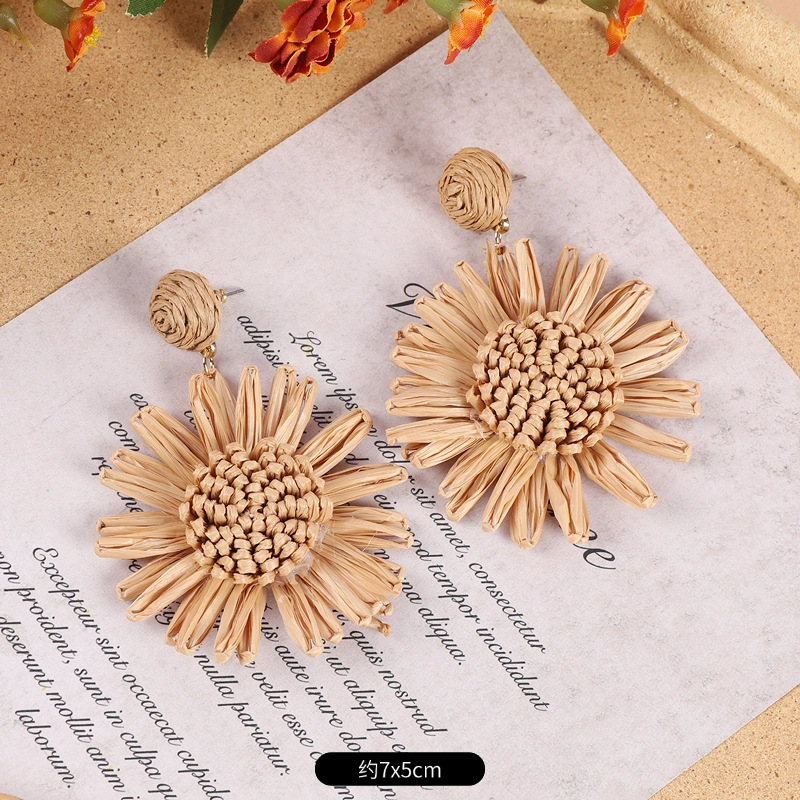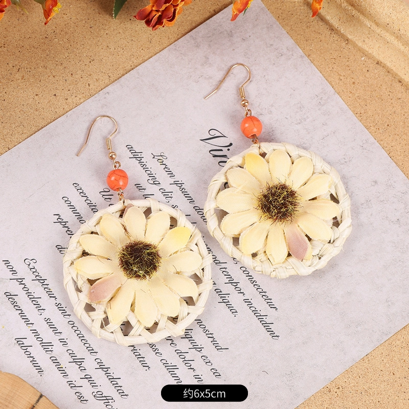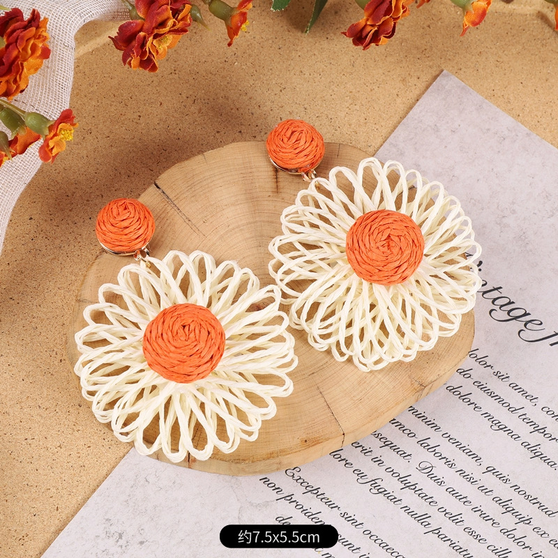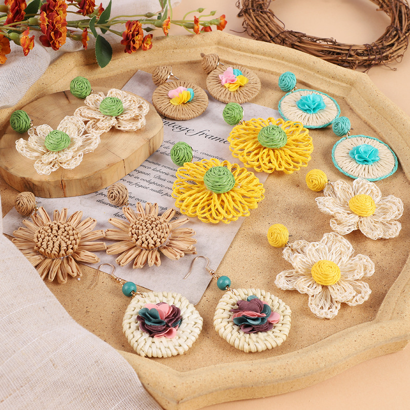 度假风藤编花朵耳钉欧美波西米亚海边复古草编耳饰品民族风女耳环